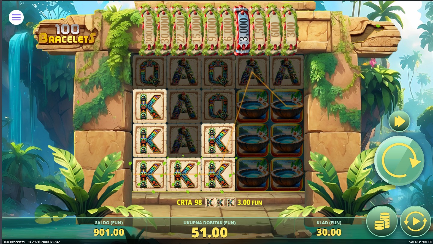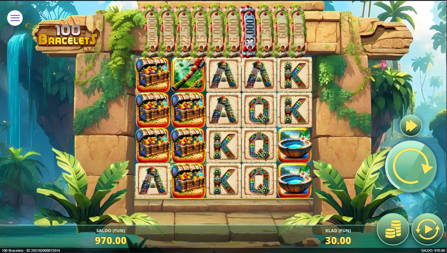 100 Bracelets vodi te u tropski Aztec svijet gdje na mreži s 5 bubnjeva i 100 isplatnih linija pronalaziš zlatne narukvice, blistavo kamenje i Wild simbol. Ova uzbudljiva i moćna slot igra providera 7777 donosi ti pravu avanturu punu neočekivanih obrata i bogatih nagrada. Posebna značajka je Prikupi mehanika: simboli napretka pomiču aktivne narukvice jedan stupac lijevo, a kada se prikupi dovoljno narukvica pojavljuje se simbol zlatnog idola koji ih prikuplja i dodjeljuje vrijednosti koje mogu doseći i do 10 000x uloga.