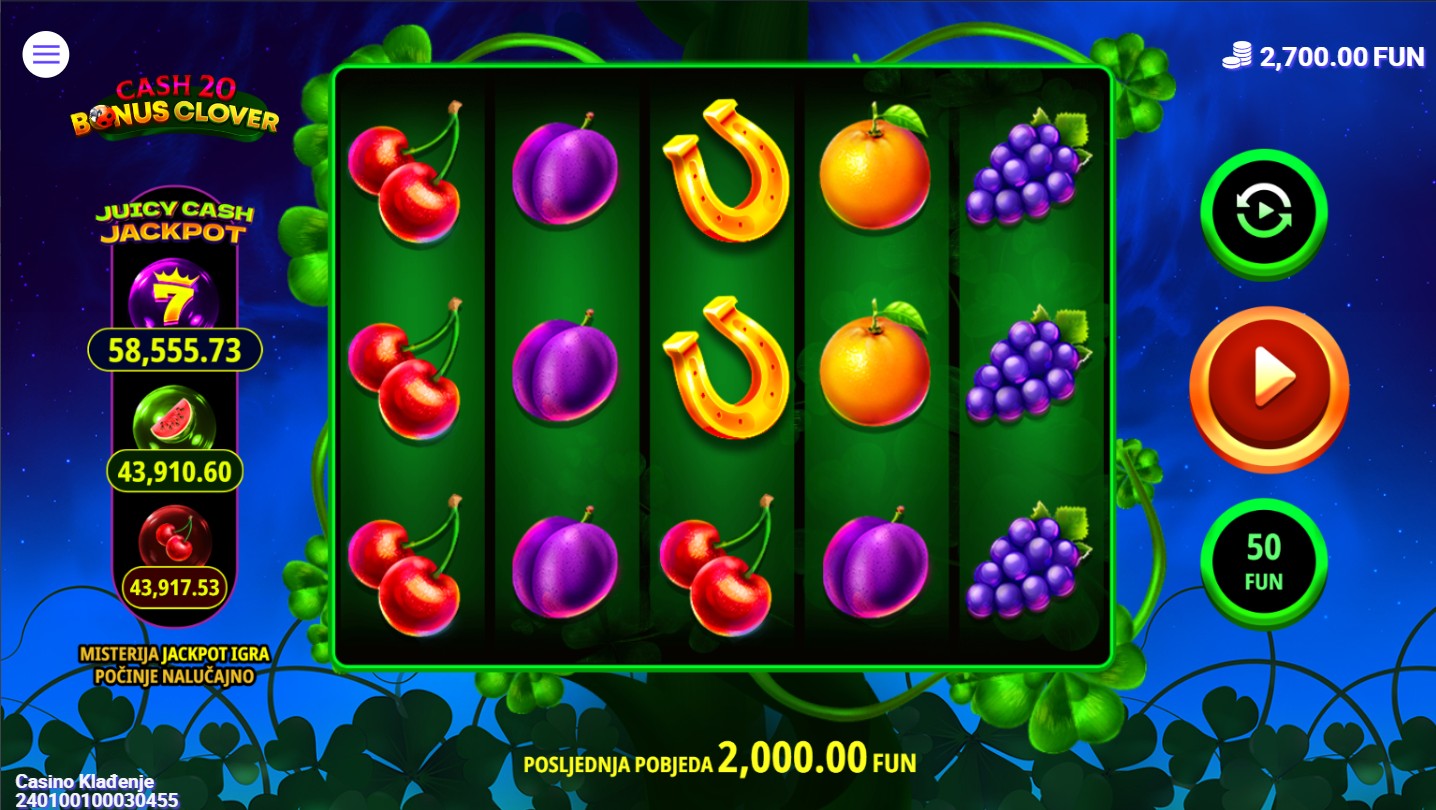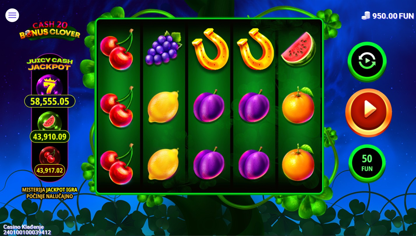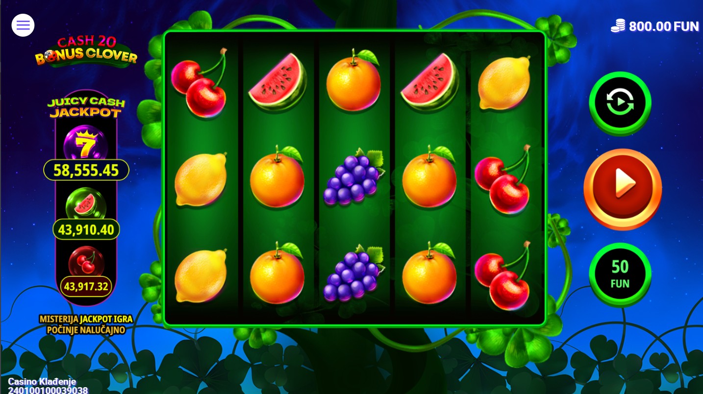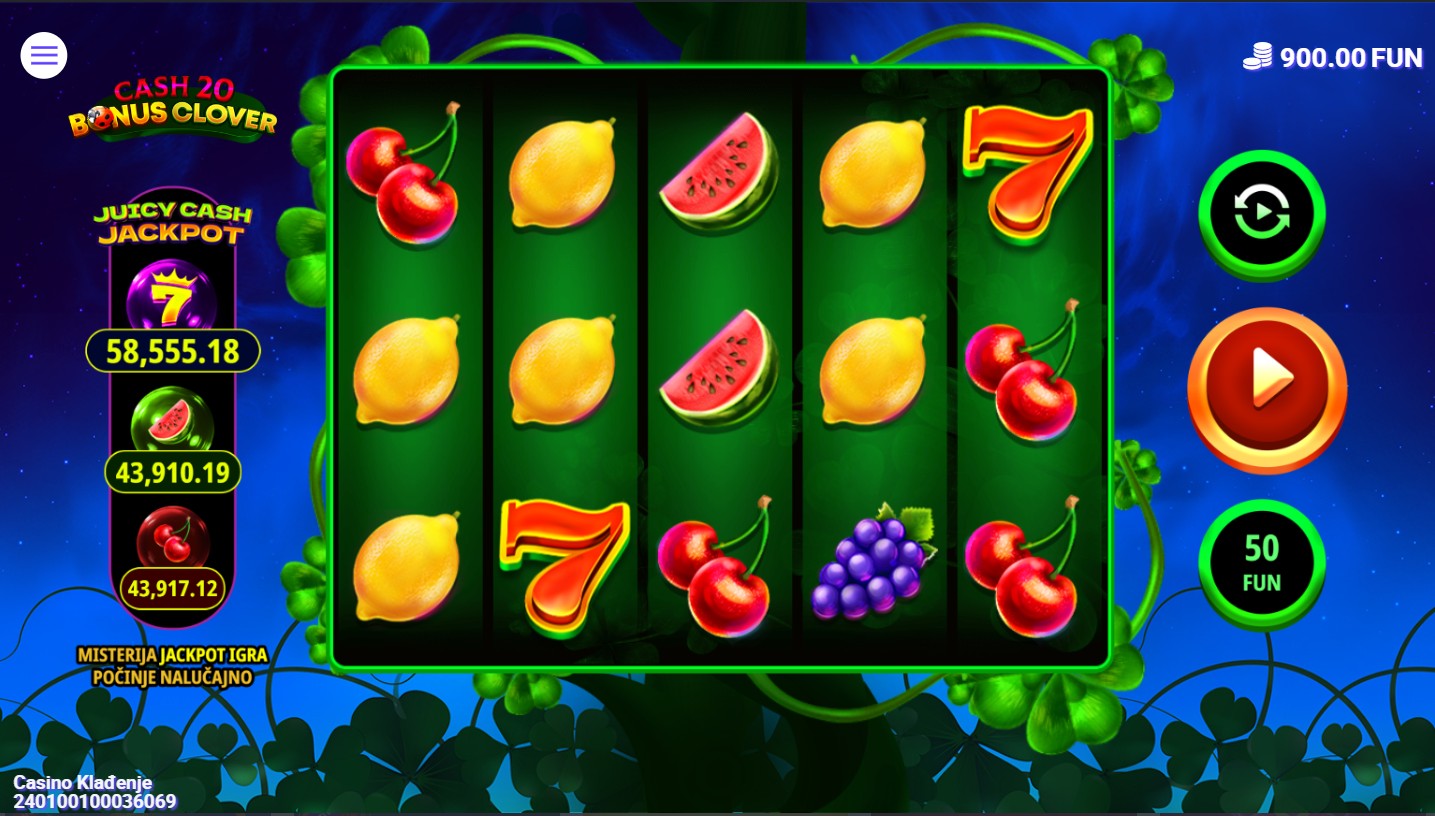 Cash 20 Bonus Clover je slot igra providera 7777 koja te vodi u veseli svijet voćnih simbola i sretnog djetelinskog lista. Igra se na 5 bubnjeva i 20 fiksnih isplatnih linija, a simboli kao što su trešnje, limuni, lubenice i zlatni potkovi stvaraju šarenu atmosferu dok Wild simbol u obliku djeteline zamjenjuje ostale simbole i pojavljuje se na stupcima 2, 3 i 4 za veće šanse za dobitak. U igri se nalaze i besplatne vrtnje, bonus igra s množiteljima te mogućnost osvajanja jackpota.