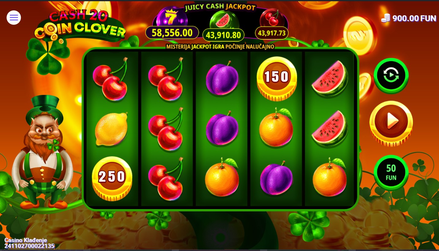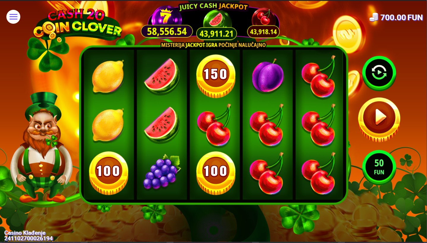 Cash 20 Coin Clover je slot igra providera 7777 koja te vodi u šareni i zabavni svijet djeteline, zlatnika i klasičnih voćnih simbola. Igra se na 5 bubnjeva sa 20 fiksnih isplatnih linija, a simboli uključuju limune, trešnje, grožđe, zlatne potkove i djetelinu kao Wild simbol koji zamjenjuje sve regularne simbole osim Scattera. Među uzbudljivim značajkama su besplatne vrtnje koje se aktiviraju pojavom Scatter simbola te nasumični množitelji koji dodatno umnažaju dobitke, ali i mogućnost osvajanja jackpota.