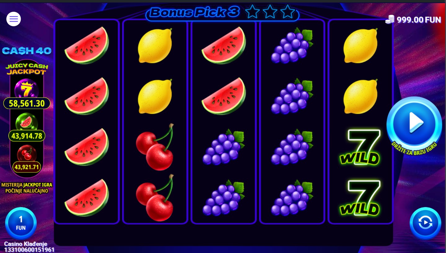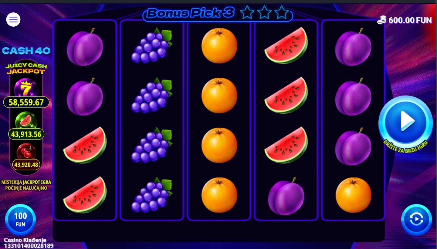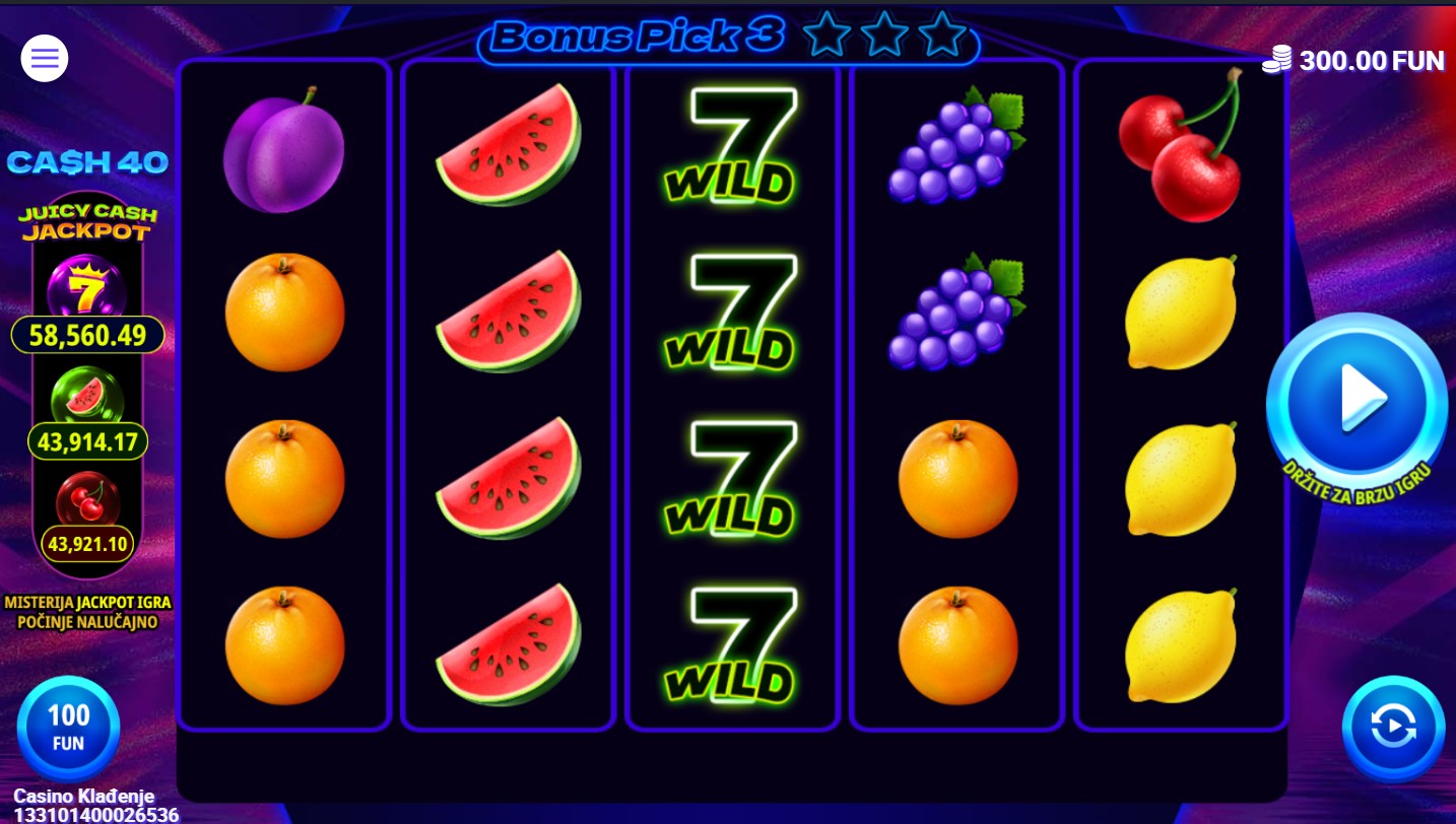 Cash 40 je slot igra providera 7777 koja donosi klasičnu voćnu tematiku s modernim značajkama na 5 bubnjeva i 40 isplatnih linija. Wild simbol zamjenjuje sve ostale simbole osim Scattera. Igra je puna bonus značajki: tri ili više Scatter simbola pokreću Bonus Pick igru u kojoj biraš između devet zvijezda i osvajaš množitelje, a za dodatno uzbuđenje tu je i značajka Juicy cash Jackpot, kao i mogućnost osvajanja bogatog jackpota.