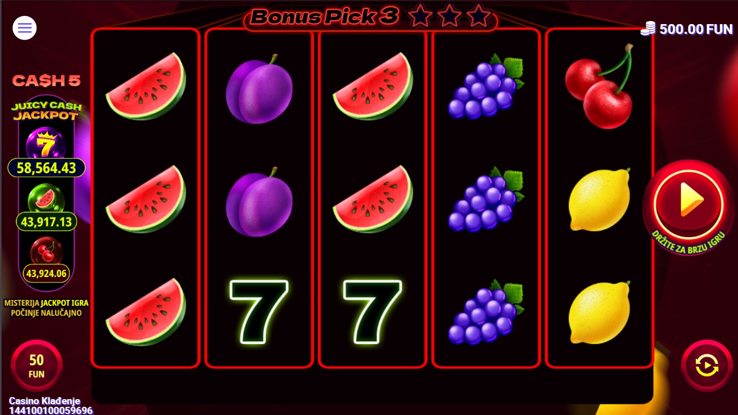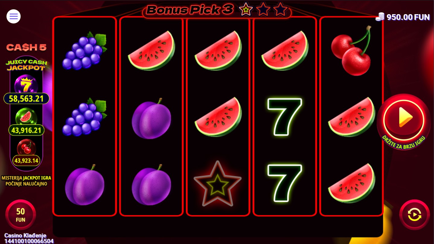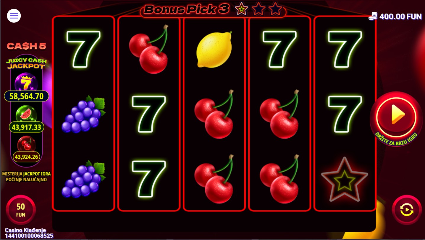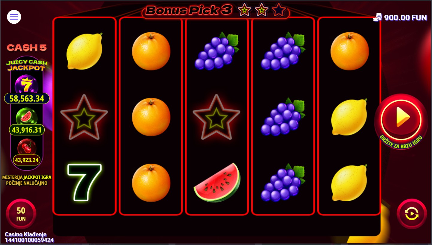 Cash 5 je slot igra proizvođača 7777 koja nudi klasičnu voćnu tematiku s modernim bonus značajkama na 5 bubnjeva i 5 isplatnih linija. Wild simbol zamjenjuje sve ostale simbole osim Scattera. Igra je puna bonus značajki: tri ili više Scatter simbola pokreću Bonus Pick igru u kojoj biraš između devet zvijezda i osvajaš množitelje, a za dodatno uzbuđenje tu je i značajka Juicy cash Jackpot, kao i mogućnost osvajanja bogatog jackpota.