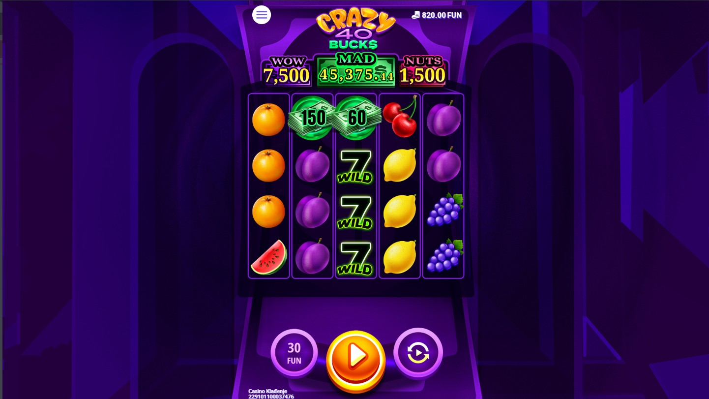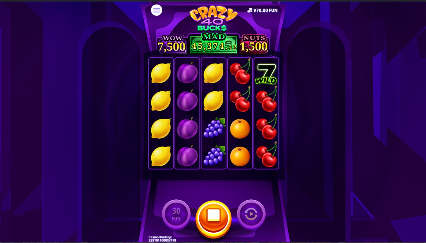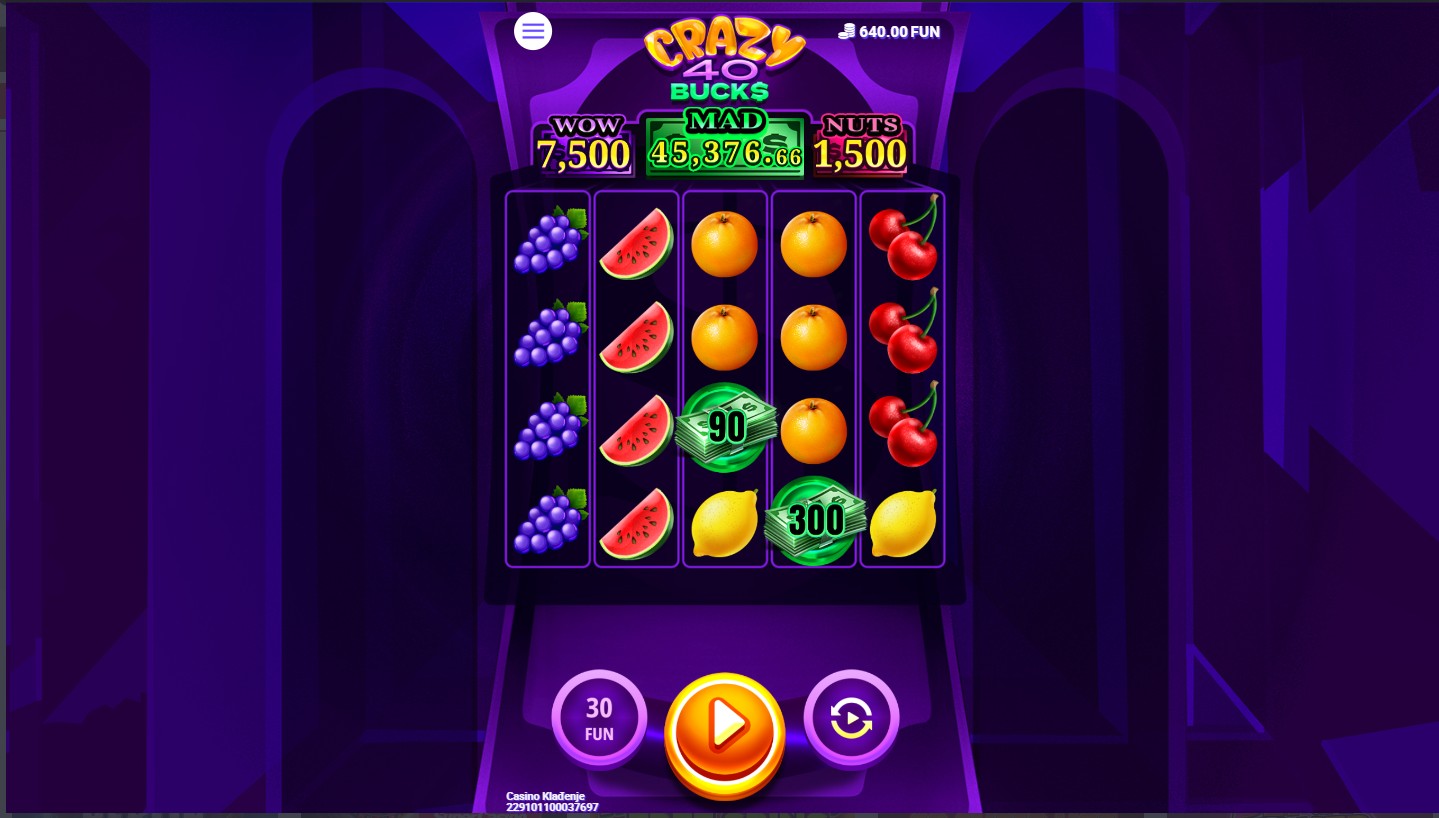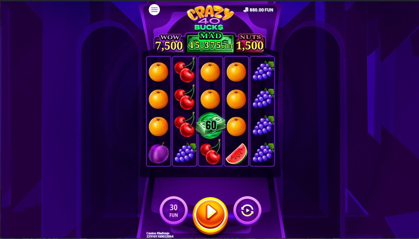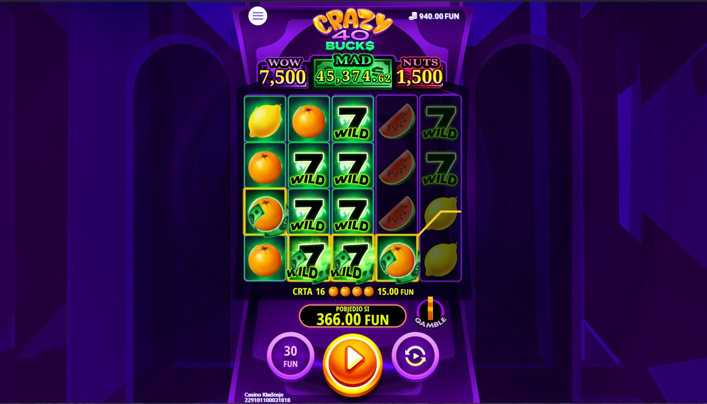 Crazy 40 Bucks je slot igra providera 7777 koja te vodi u razigrani voćni svijet s modernim značajkama. Igra se na 5 bubnjeva i 40 fiksnih isplatnih linija. Simboli uključuju klasično voće, zlatnike i sedmice dok Wild simbol zamjenjuje regularne simbole i otvara veće šanse za dobitak. Za dodatno uzbuđenje tu su i bogati množitelji, mogućnost udvostručavanja dobitka, kao i osvajanja progresivnog jackpota.