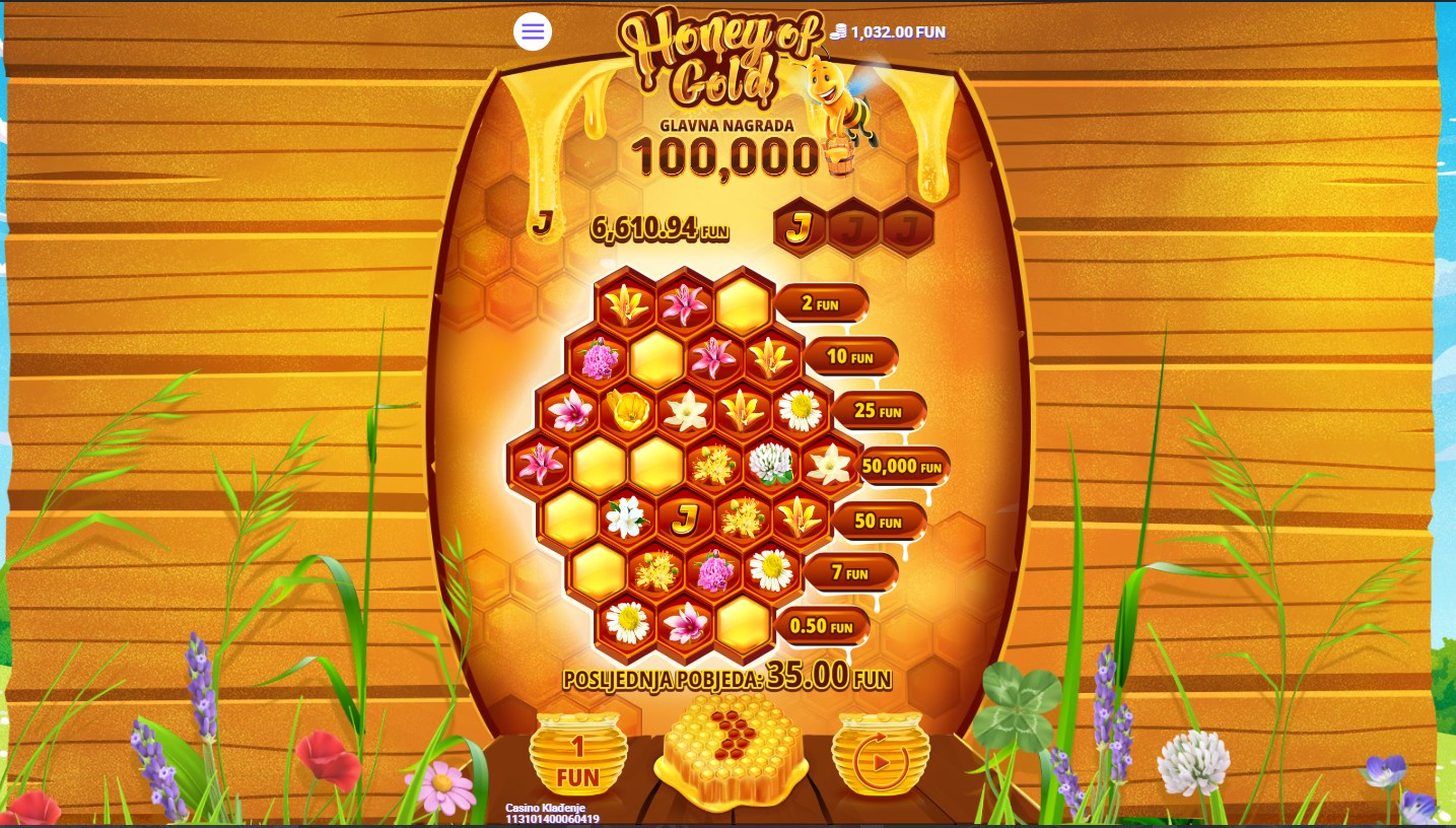 Honey of Gold se igra na uzbudljivoj mreži u košnici. Dobitne kombinacije se broje s lijeva na desno, a Wild simbol zamjenjuje sve ostale simbole osim Scattera. U igri, svaka vrtnja može donijeti dodatne šanse za osvajanje putem nasumičnih funkcija koje uključuju dodavanje Wild simbola i multipliciranje dobitaka. Simbol Tegle s medom pokreće besplatne vrtnje, tijekom kojih multiplikatori mogu dodatno povećati tvoje dobitke. Pčele koje lete oko bubnjeva mogu donijeti i dodatne nagrade s misterioznim simbolima koji otkrivaju skrivene bonus dobitke. Za dodatno uzbuđenje tu je i bonus igra Jackpot Temple, kao i mogućnost osvajanja progresivnog jackpota, dok tvoja medena avantura nudi uzbudljive šanse za velike pobjede!
