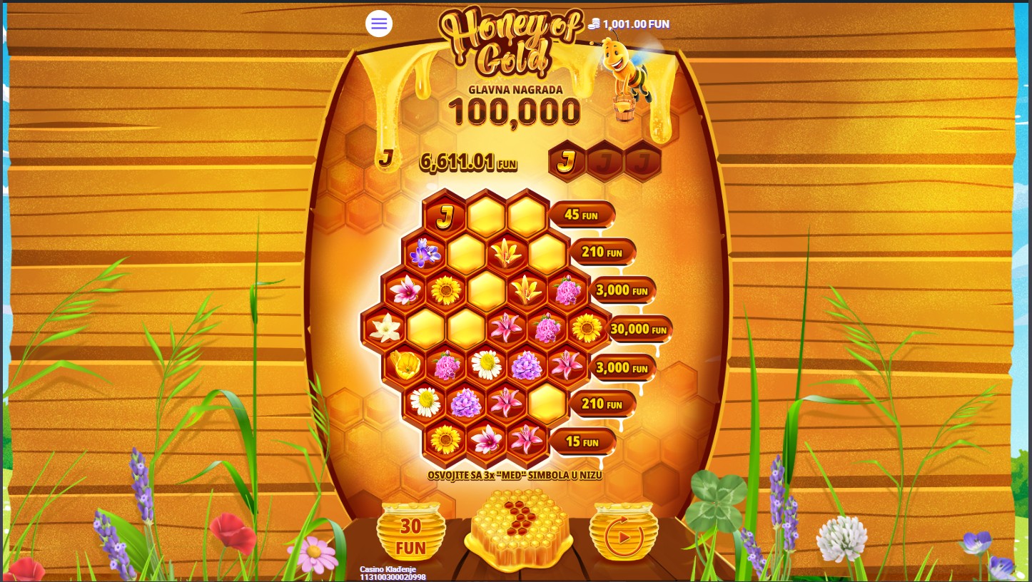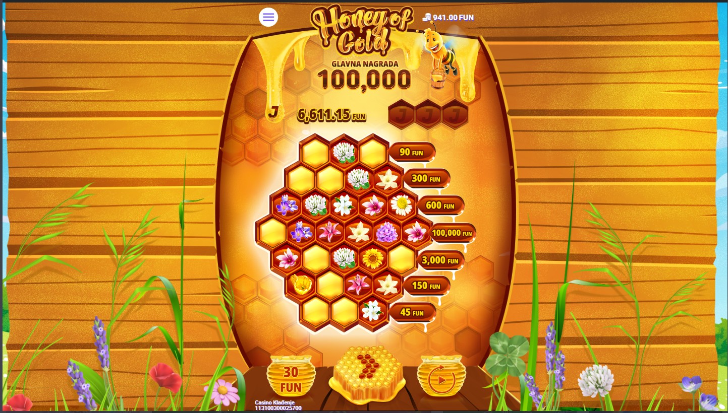 Zakorači u šarmantni svijet medenih nagrada, gdje ti pčele donose bogatstvo u ovoj slatkoj avanturi! Honey of Gold, slot igra providera 7777, vodi te na zabavnu mrežu košnice, s nevjerojatnim bonus značajkama koje će tvoju igru pretvoriti u pravo medeno uživanje. U ovoj igri, simboli Wild zamjenjuju sve druge simbole osim Scattera, dok Scatter simboli aktiviraju besplatne vrtnje koje mogu dovesti do nevjerojatnih dobitaka. Pčele nisu samo marljive u stvaranju meda, već donose i multiplikatore koji povećavaju tvoje šanse za dobitak! Sa svakom vrtnjom možeš otkriti skrivene zalihe meda koje čine svaku igru još uzbudljivijom, a bonus runde nude ti šansu za osvojiti pravu zlatnu nagradu. Ako voliš igre s fantastičnim bonusima i šansama za velike dobitke, Honey of Gold je pravi izbor za tebe!