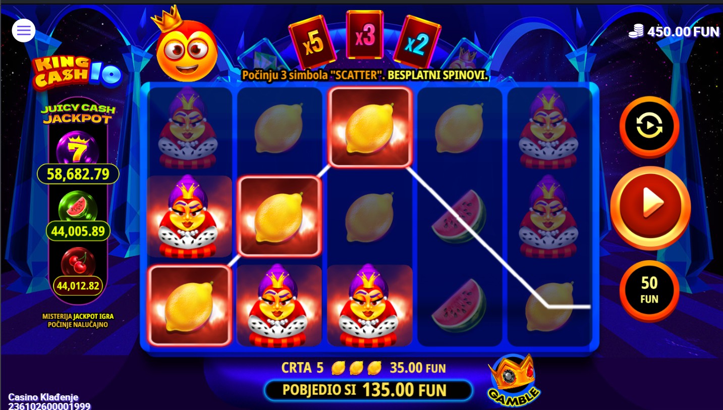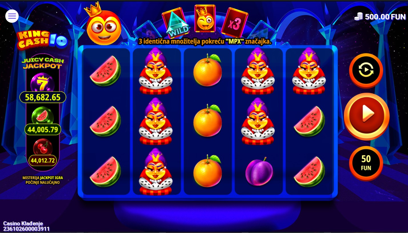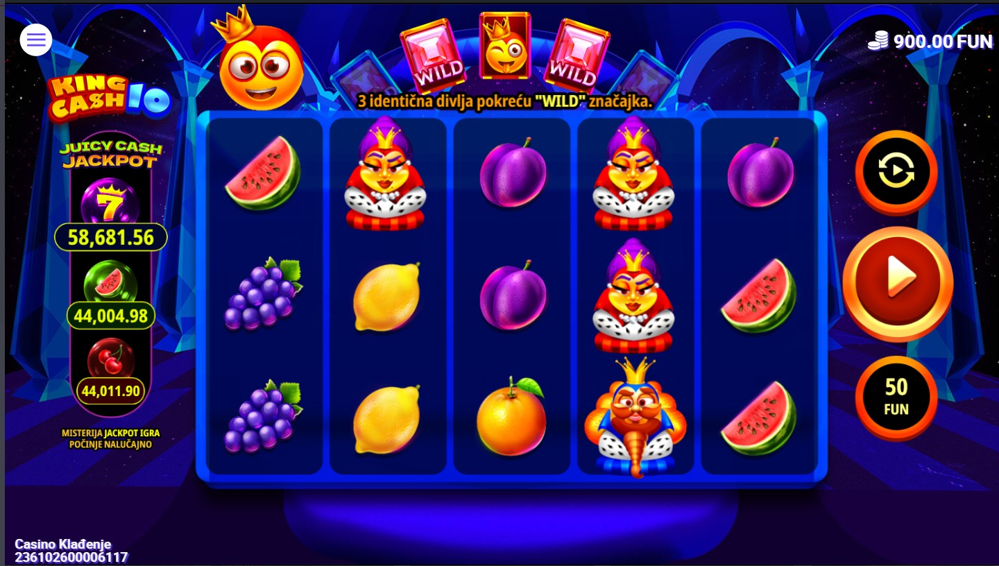 King Cash 10 se igra na 5 bubnjeva i 3 reda s 10 isplatnih linija. Dobitne kombinacije broje se s lijeva na desno, a Wild simbol zamjenjuje sve druge simbole osim Scattera. Tri ili više Scatter simbola pokreću bonus besplatnih vrtnji, u kojima možeš osvojiti dodatne nagrade i multiplikatore. Svaka vrtnja donosi šansu za veliki dobitak, a za dodatno uzbuđenje tu je i značajka Juicy cash Jackpot koji ti povećava RTP do 1,5%, kao i mogućnost udvostručenje dobitka. Uz kraljevske simbole i fantastične značajke, King Cash 10 je tvoja prilika za osvajanje prijestolja bogatstva!