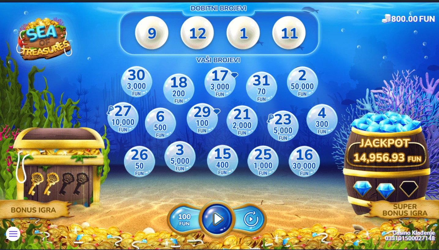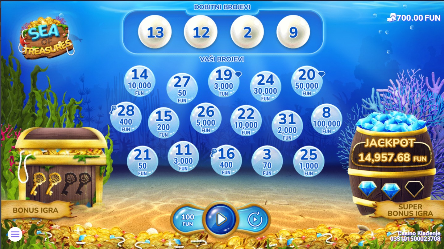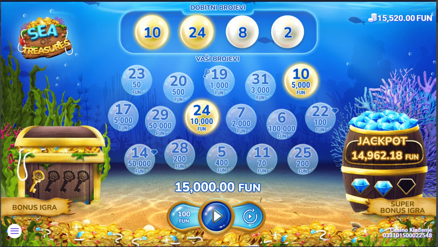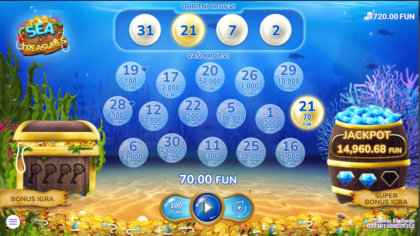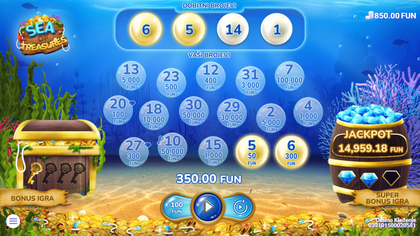 Zaronite u dubine mora u Sea of Treasures, gdje vas čekaju bogatstva skrivena pod površinom! Ova uzbudljiva igra providera 7777 koristi mrežu koja se otkriva s 4 dobitna broja i 16 tvojih brojeva. Šarene ribe otkrivaju brojeve na mreži, a svaki od njih može donijeti nevjerojatne nagrade. Igra uključuje različite bonus funkcije koje povećavaju vaše šanse za dobitak, dok zaranjanje u moru donosi uzbudljive trenutke i otkrivanje novih bogatstava!