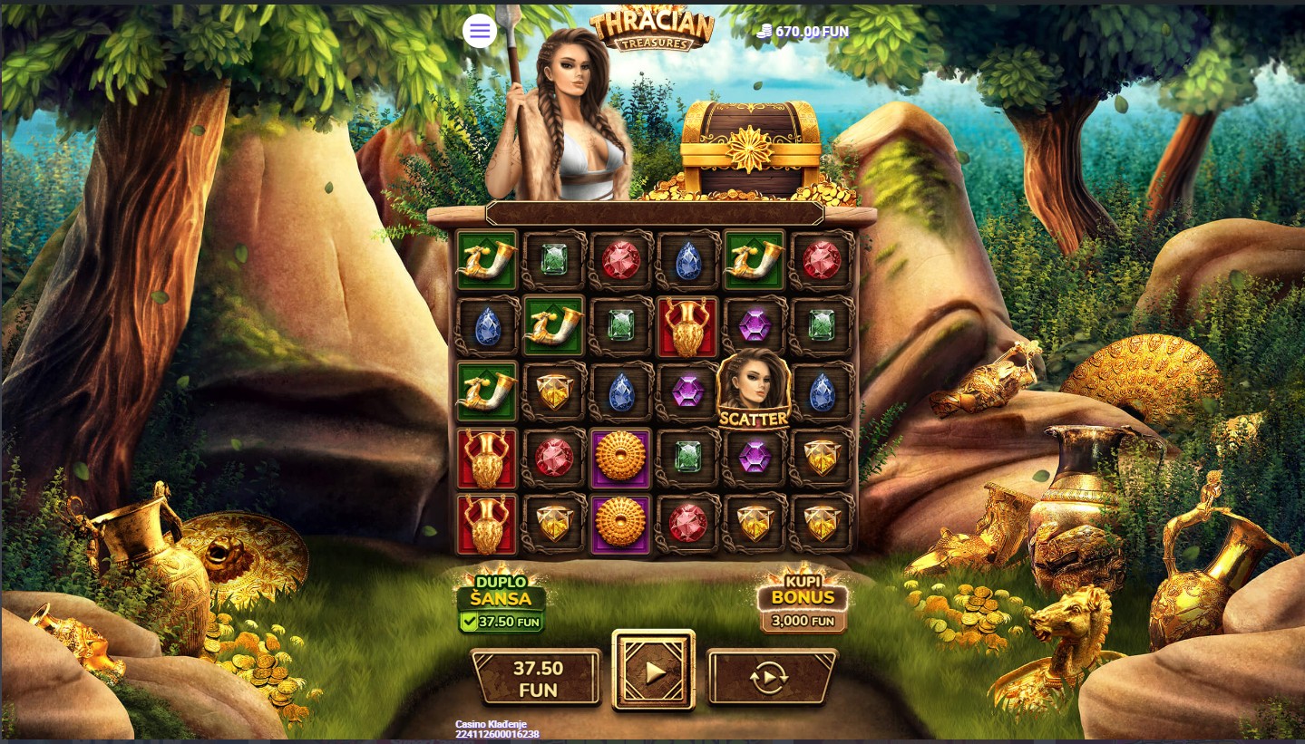 Zakorači u svijet drevnog svijeta, gdje su skrivena neprocjenjiva blaga u Thracian Treasures! Ova uzbudljiva slot igra providera 7777 vodi te kroz mističnu zemlju, gdje ćeš otkriti nevjerojatne nagrade dok istražuješ tajne prošlih vremena. Na 6 bubnjeva i 5 redova, besplatne vrtnje donose dodatne šanse za velike dobitke. Uz bogate multiplikatore do 500x dobitka, bonus runde i priliku za osvajanje blaga, Thracian Treasures pruža pravi adrenalin u potrazi za neprocjenjivim bogatstvima!