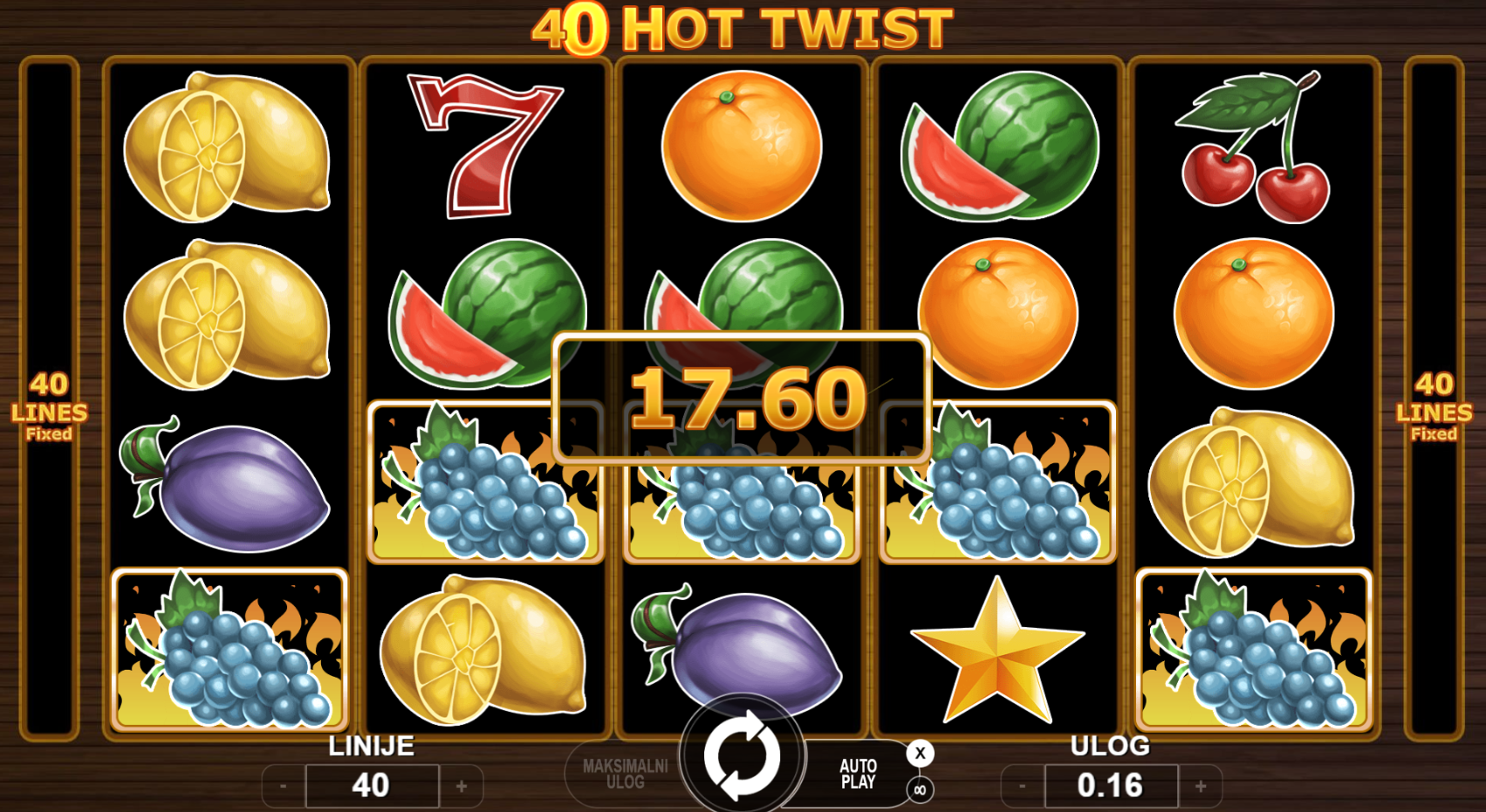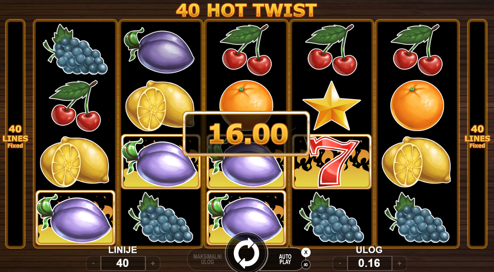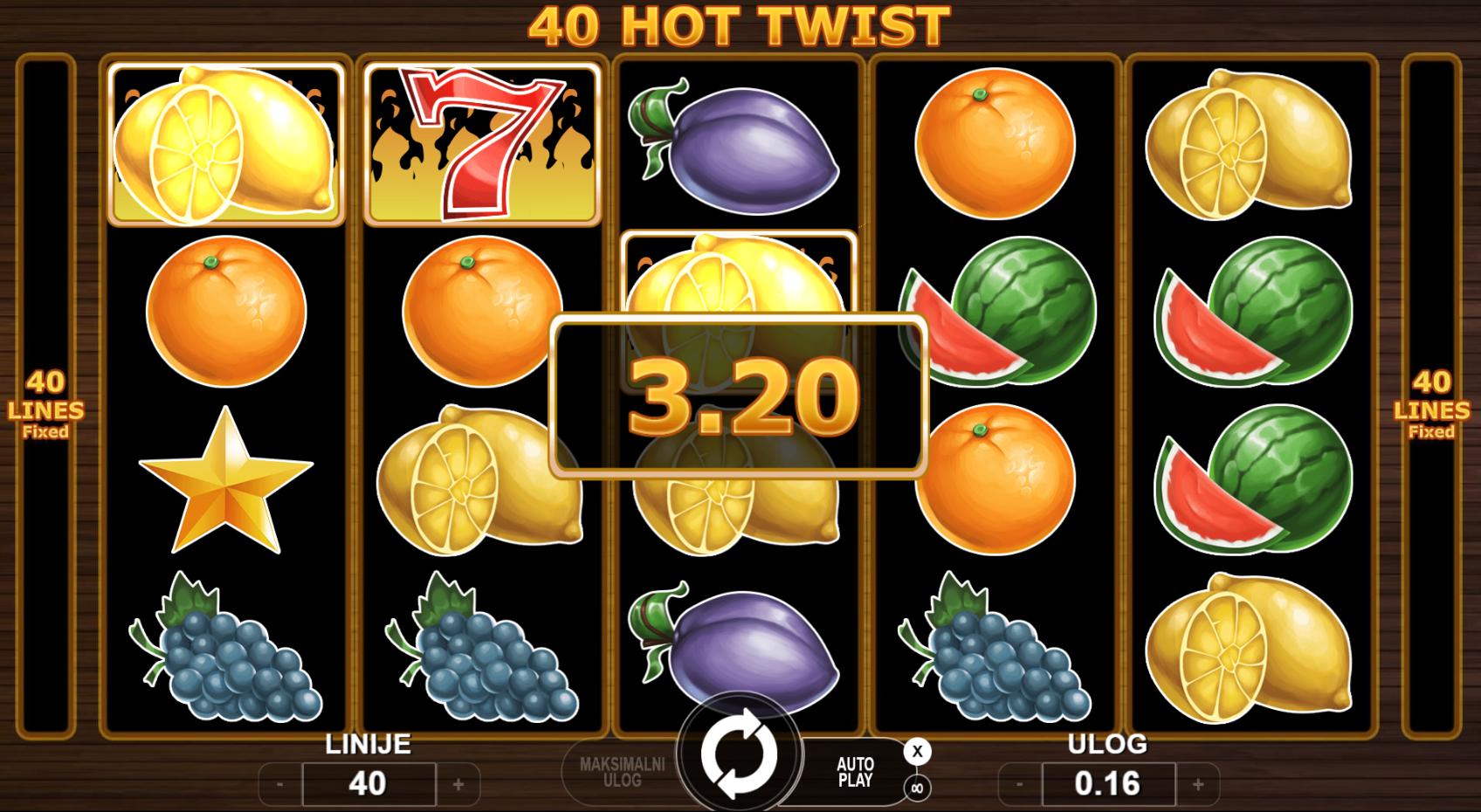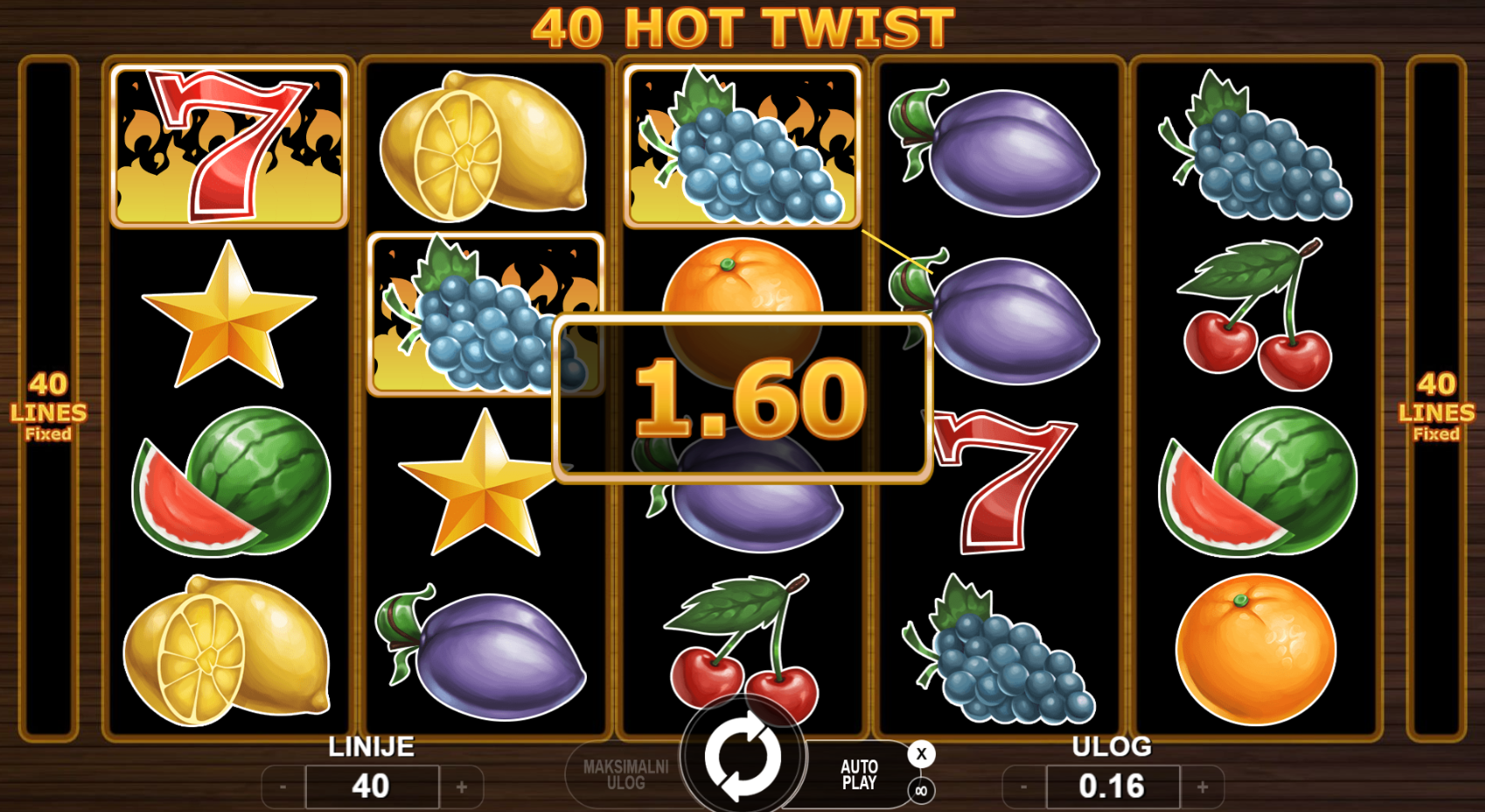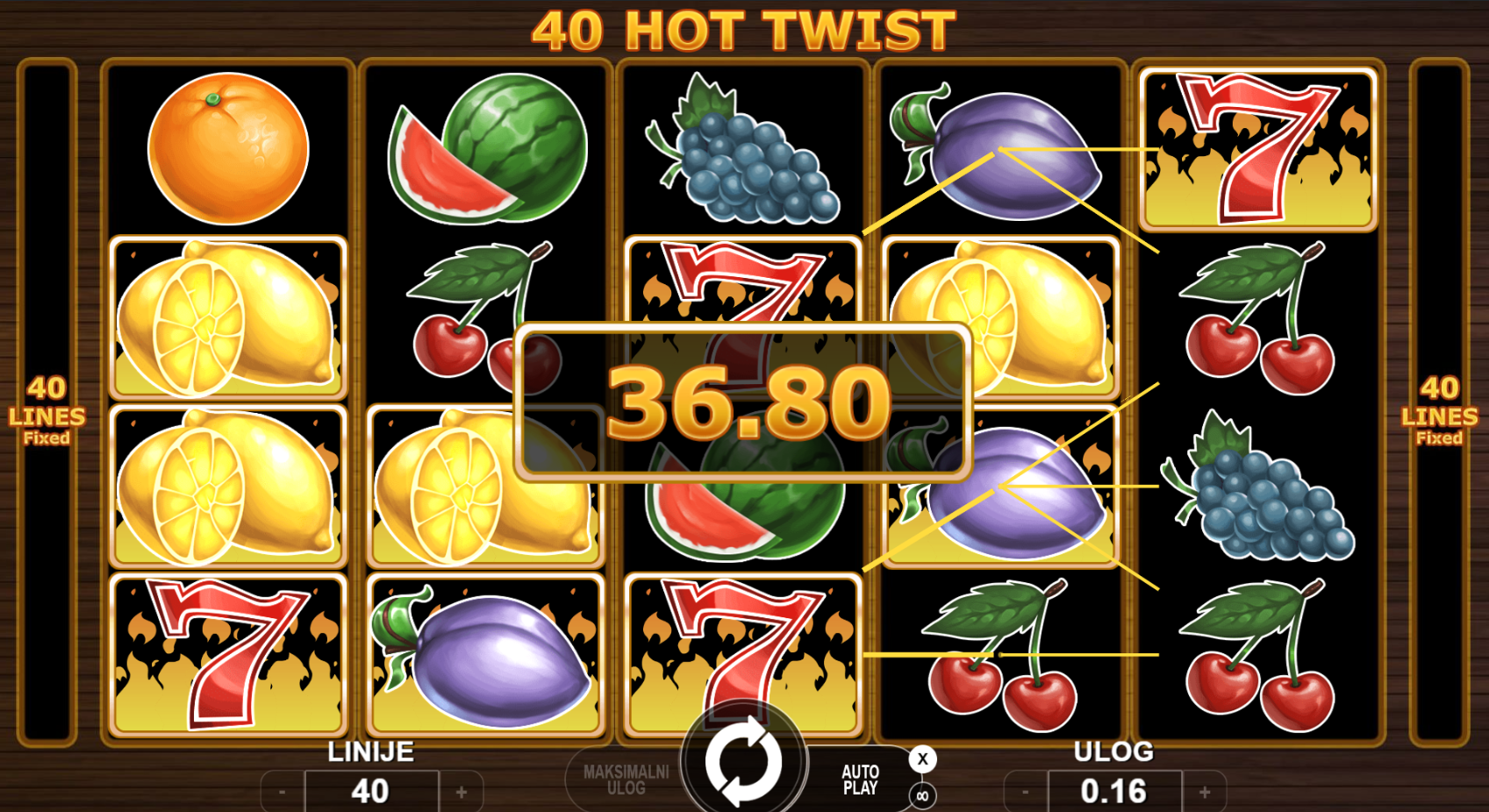 40 fiksnih isplatnih linija. Sve se vrti oko brzih dobitaka, jednostavnih pravila i vruće zabave!