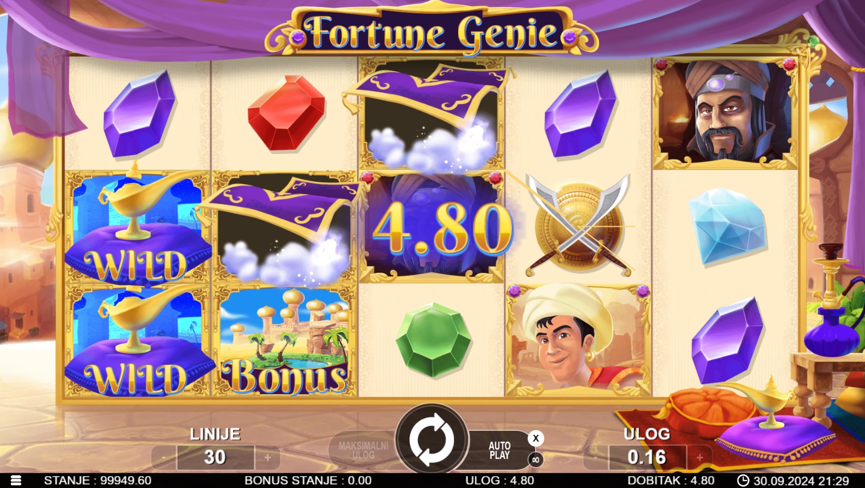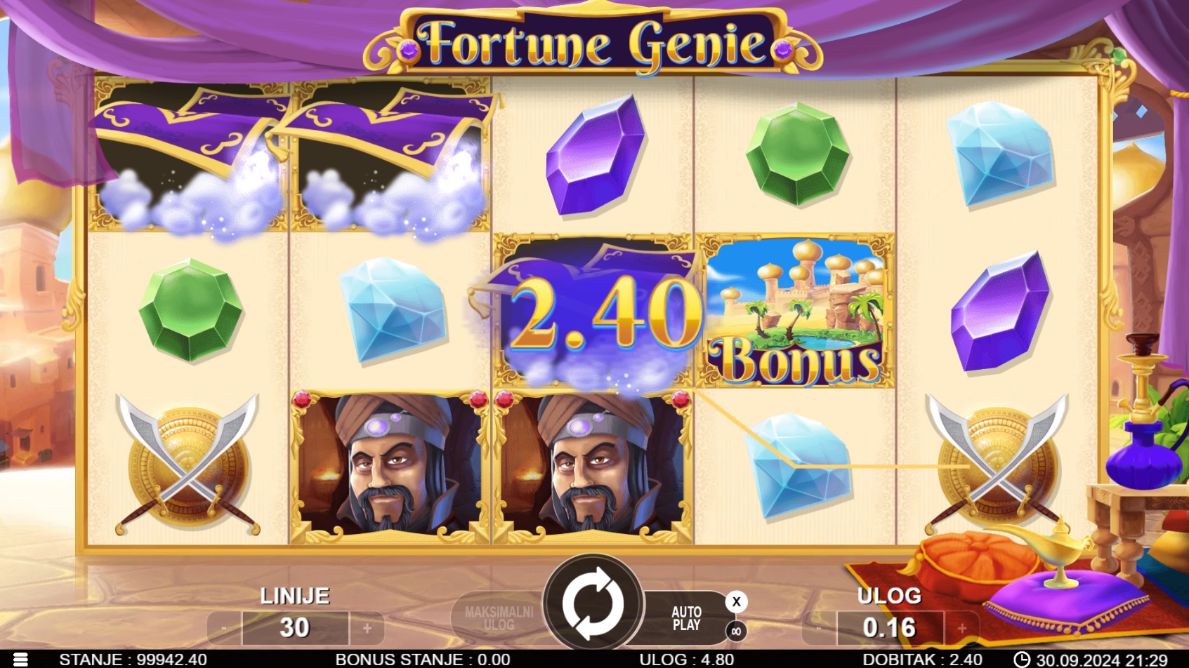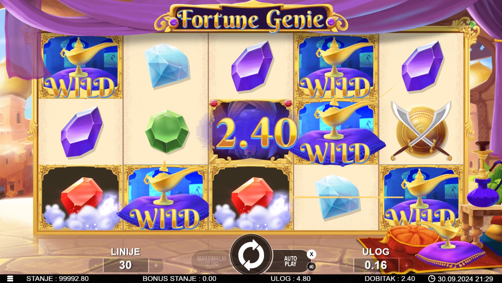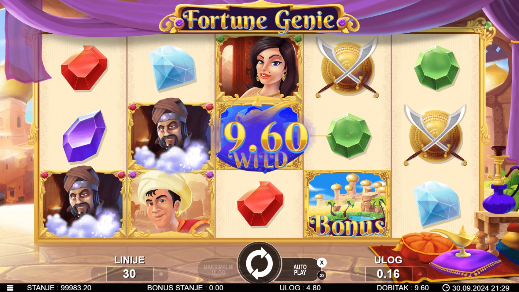 U igri Fortune Genie, vodi te čarobni svijet kroz mističnu pustolovinu na pet koluta i tri reda, sa 30 podesivih isplatnih linija. Igra je bogata bonusima i wild simbolima koji povećavaju tvoje šanse za dobitak. Uz 11 različitih simbola, kombinacije se formiraju kada se tri ili više istih simbola pojave na susjednim kolutima, počevši od lijevog. Wild simboli zamjenjuju sve simbole osim bonus simbola, omogućujući češće i veće dobitke. Kreni u potragu za blagom uz Fortune Genie i otkrij magične nagrade!
