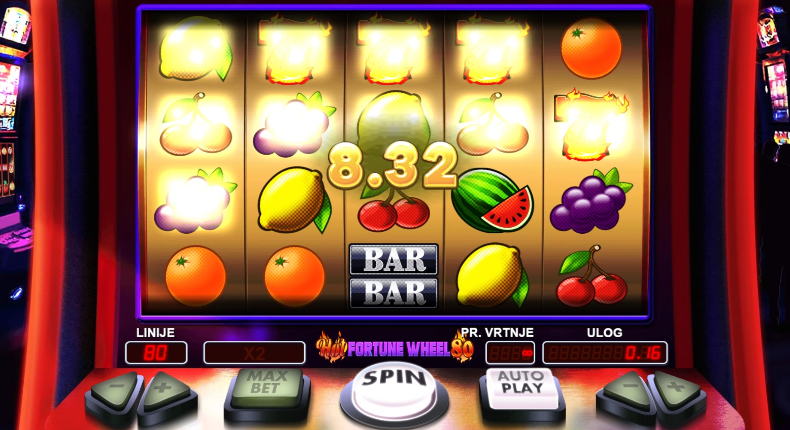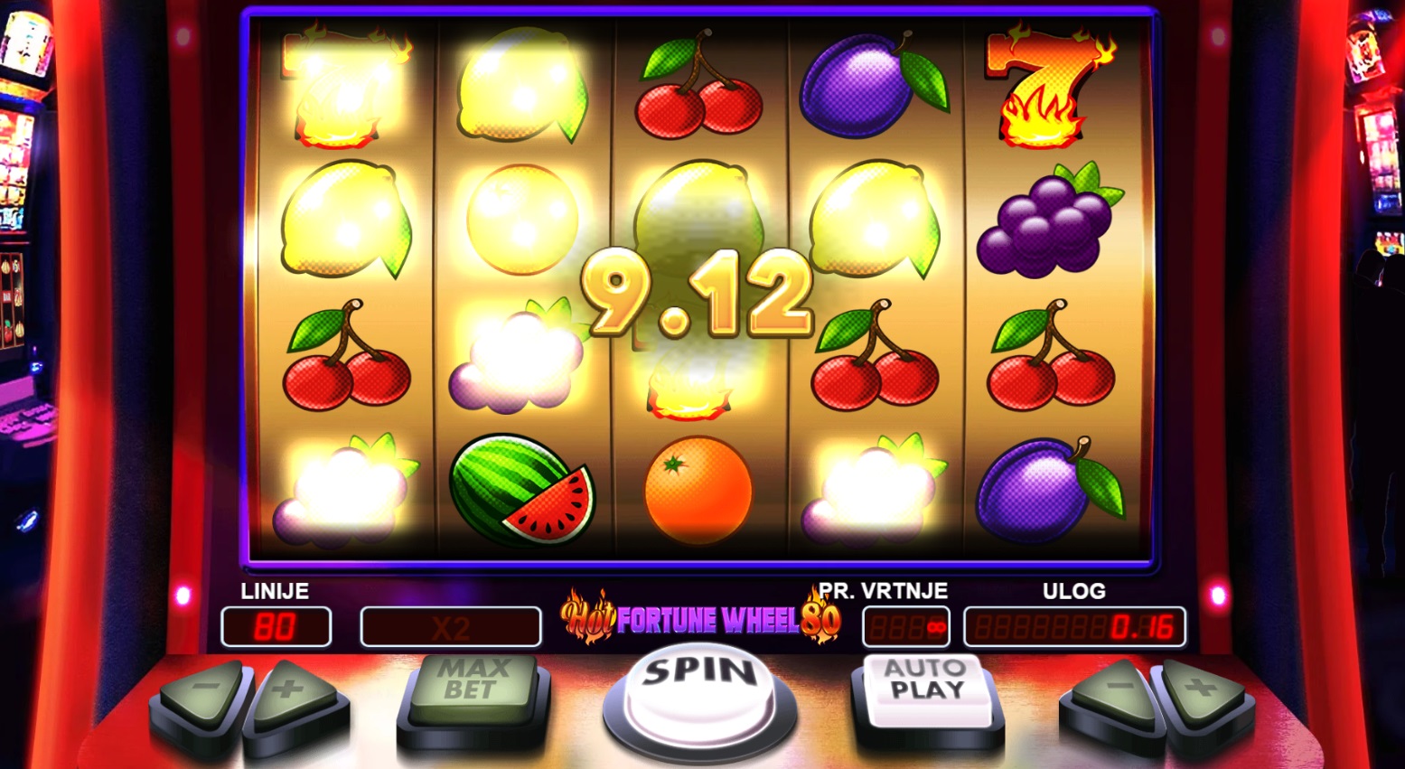 Hot Fortune Wheel 80 je uzbudljiva slot igra s 5 koluta i 4 reda, koja se igra na 80 fiksnih isplatnih linija. Kombinacija 3 ili više istih simbola na susjednim kolutima, počevši od lijevog, donosi dobitak. Wild simboli povećavaju šanse za pobjedu zamjenjujući ostale simbole, dok bonus simboli aktiviraju Bonus Igru. Ova igra nudi dinamičan gameplay s bonus značajkama, gdje možeš osvojiti vrijedne nagrade okretanjem Kola sreće.