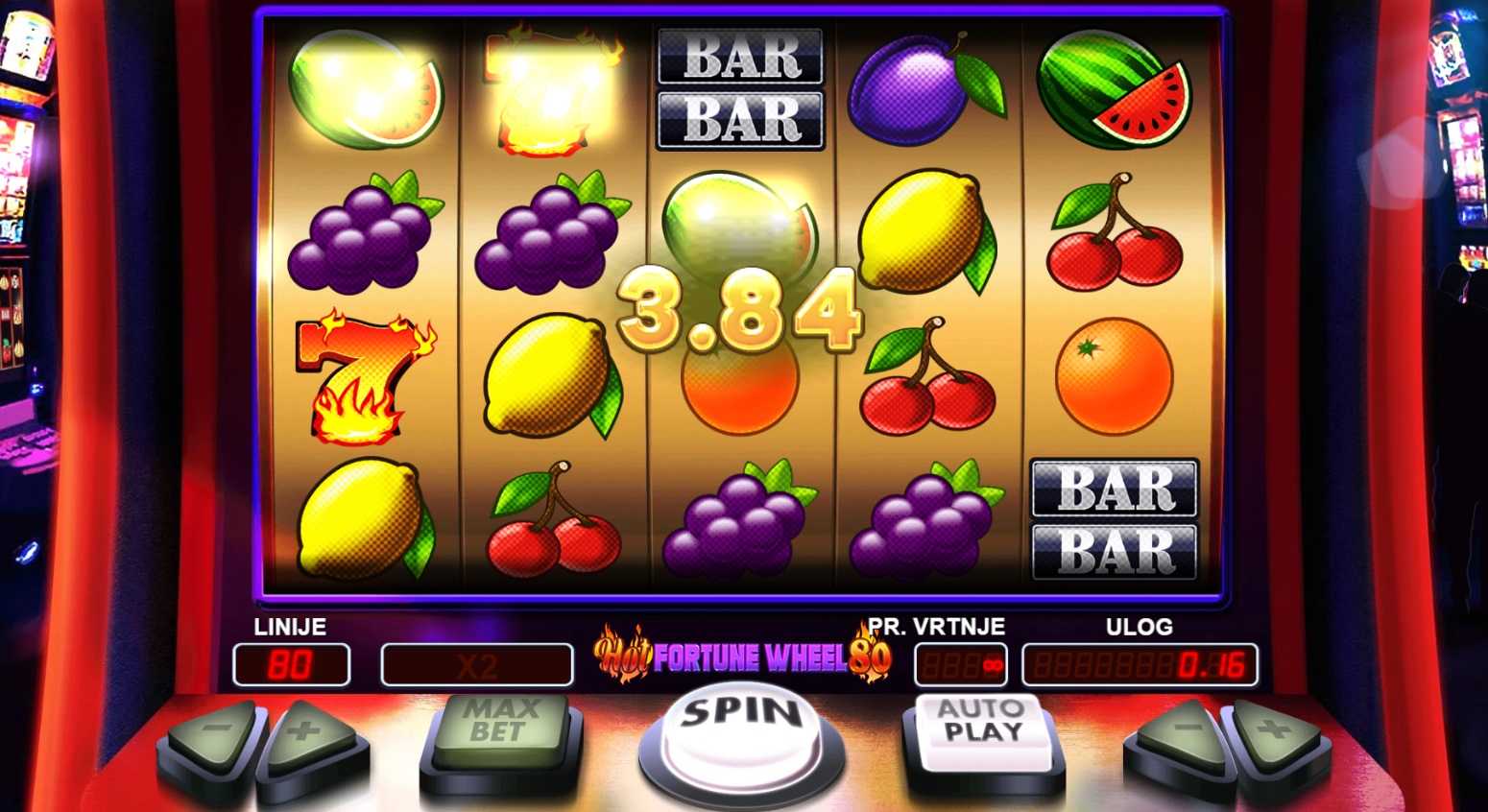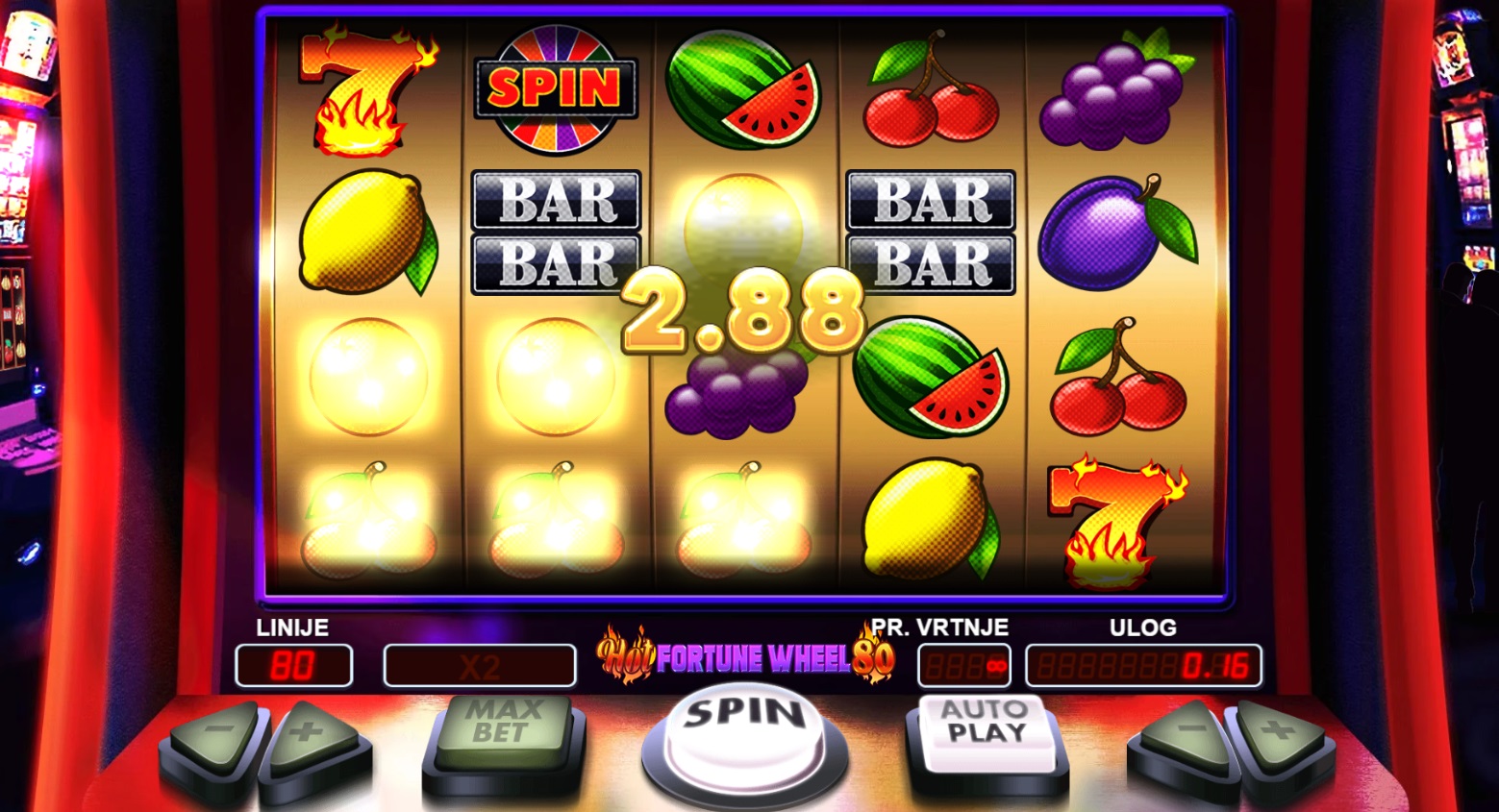 Hot Fortune Wheel 80 nudi jednostavan, ali uzbudljiv gameplay s 80 isplatnih linija. Igrači ostvaruju dobitak kombinacijama simbola s lijeva na desno, a Wild simboli pomažu povećati šanse za pobjedu. Bonus simboli na kolutima 2, 3 i 4 aktiviraju Bonus Igru, gdje vrtiš Kolo sreće i osvajaš nagrade utemeljene na tvom ulogu. Također, tu je i dodatna značajka "Crveno ili crno", gdje možeš pokušati udvostručiti dobitak pogađajući boju karte.