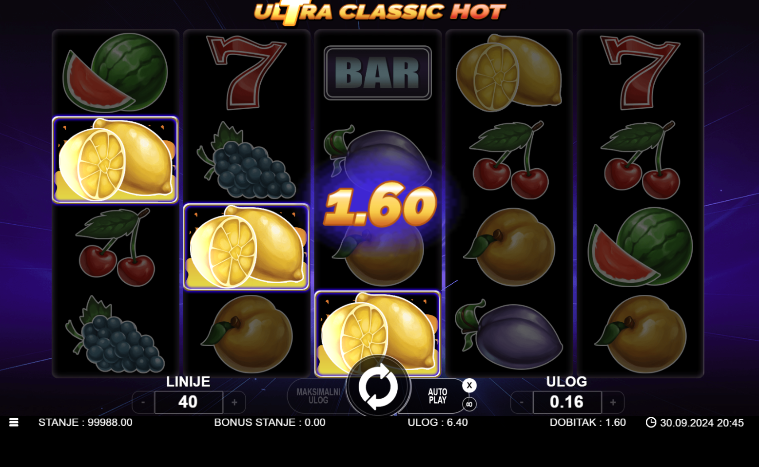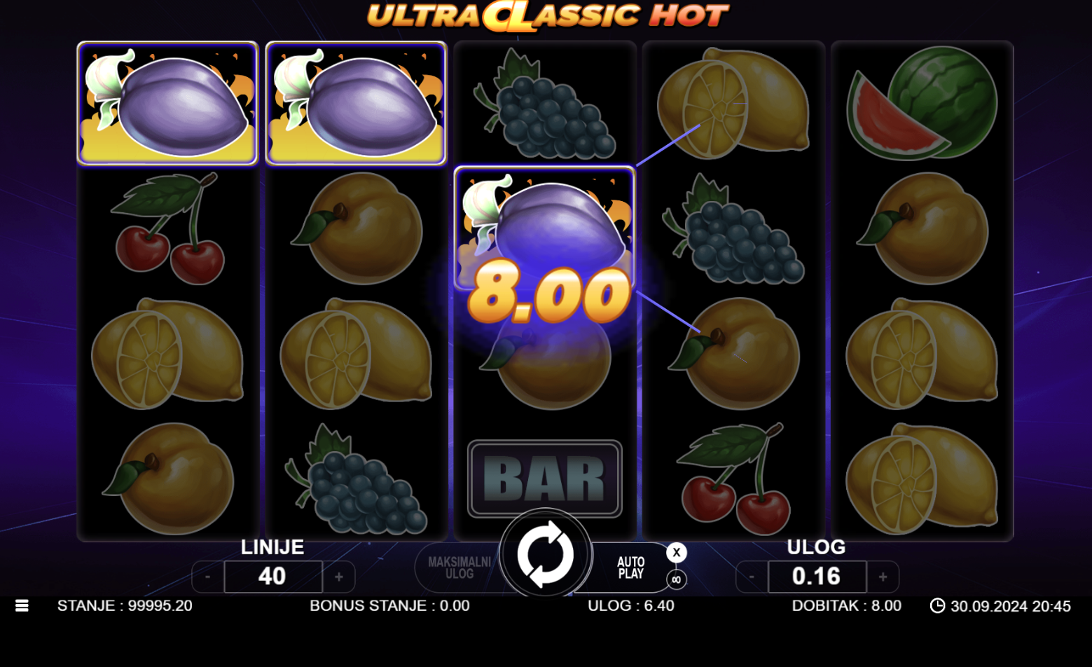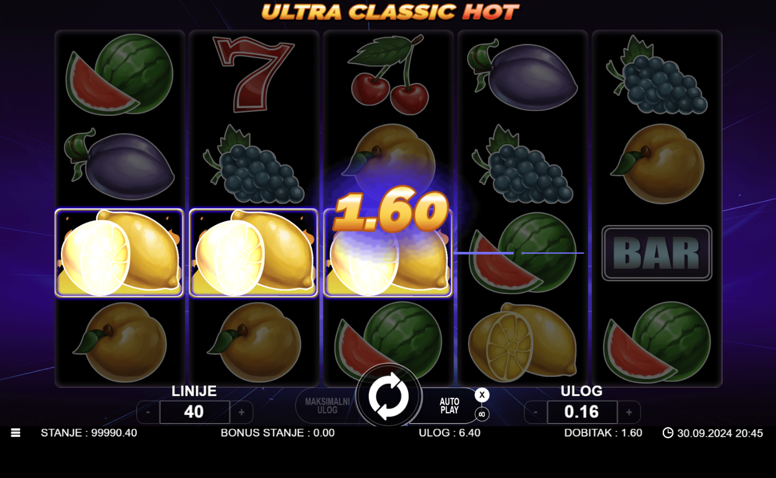 Ultra Classic Hot je klasična slot igra s pet koluta i četiri reda, koja donosi jednostavno, ali uzbudljivo iskustvo igranja. S 40 fiksnih isplatnih linija, ova video slot igra nudi priliku za velike dobitke uz kombinacije simbola koja se zbrajaju s lijeva na desno. Igra ima osam simbola koji donose nagrade, dok Wild simboli služe kao zamjena za ostale, čime povećavaju šanse za dobitak. Opcija "Igraj Se" omogućuje ti dodatnu priliku za duplanje dobitaka, što donosi još više uzbuđenja!