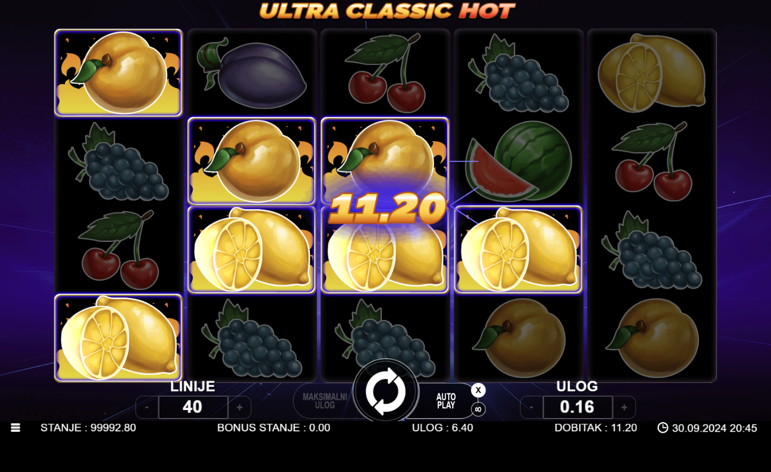 Ultra Classic Hot se igra na pet koluta s četiri reda i 40 fiksnih isplatnih linija. Dobitne kombinacije nastaju kad se tri ili više istih simbola pojave na susjednim kolutima, počevši od lijevog. Ako na različitim isplatnim linijama ima više dobitnih kombinacija, sve se zbrajaju. Wild simboli povećavaju šanse za dobitak zamjenjujući ostale simbole. Opcija duplanja omogućuje ti da nakon svakog dobitka pokušaš udvostručiti nagradu, pogađajući boju karte. Pazi, dobitak može narasti, ali i nestati!