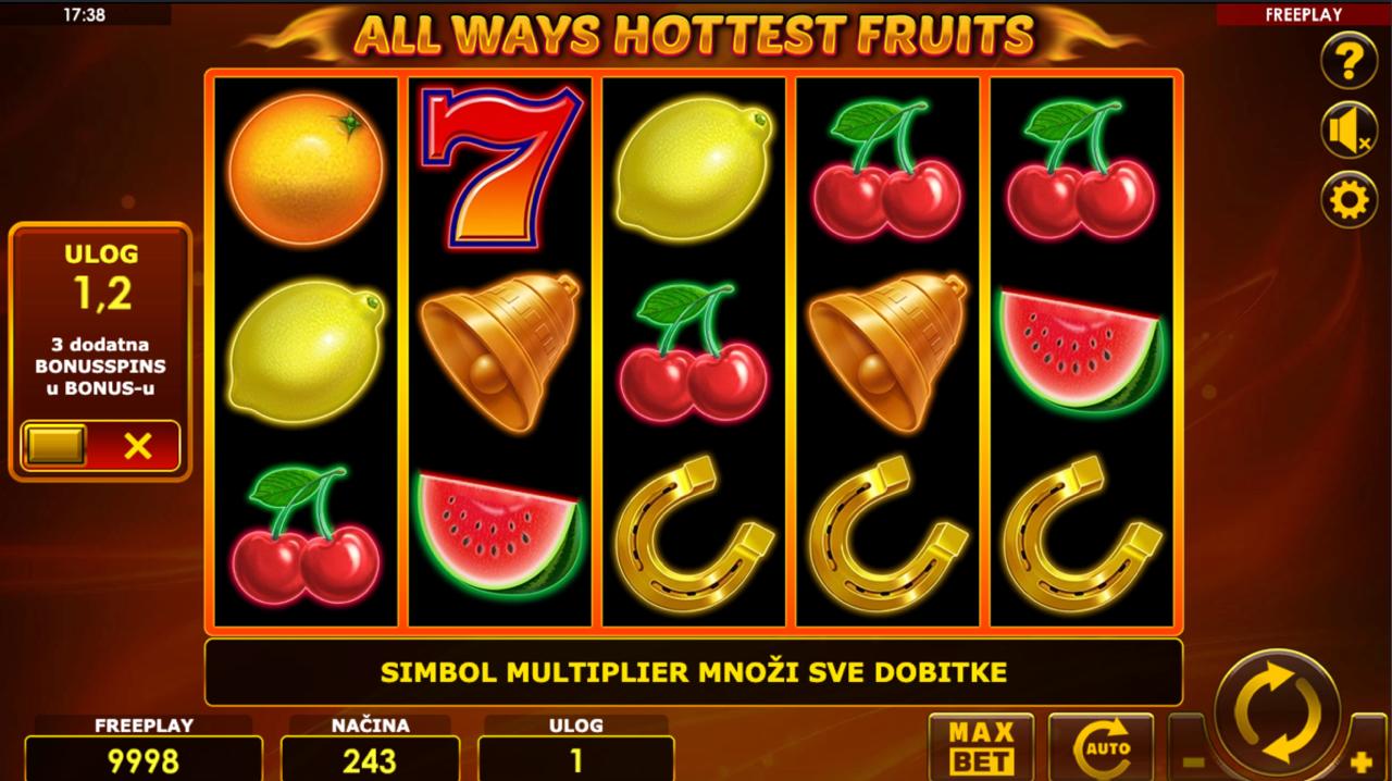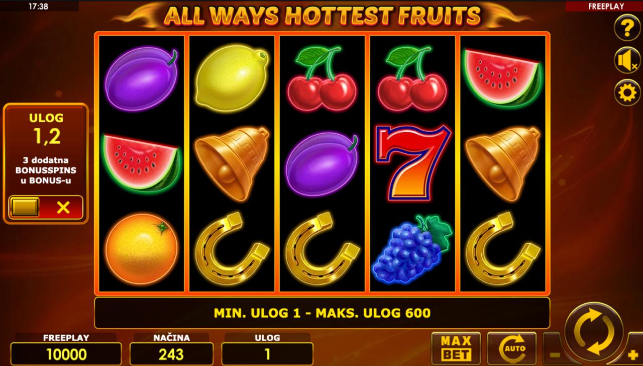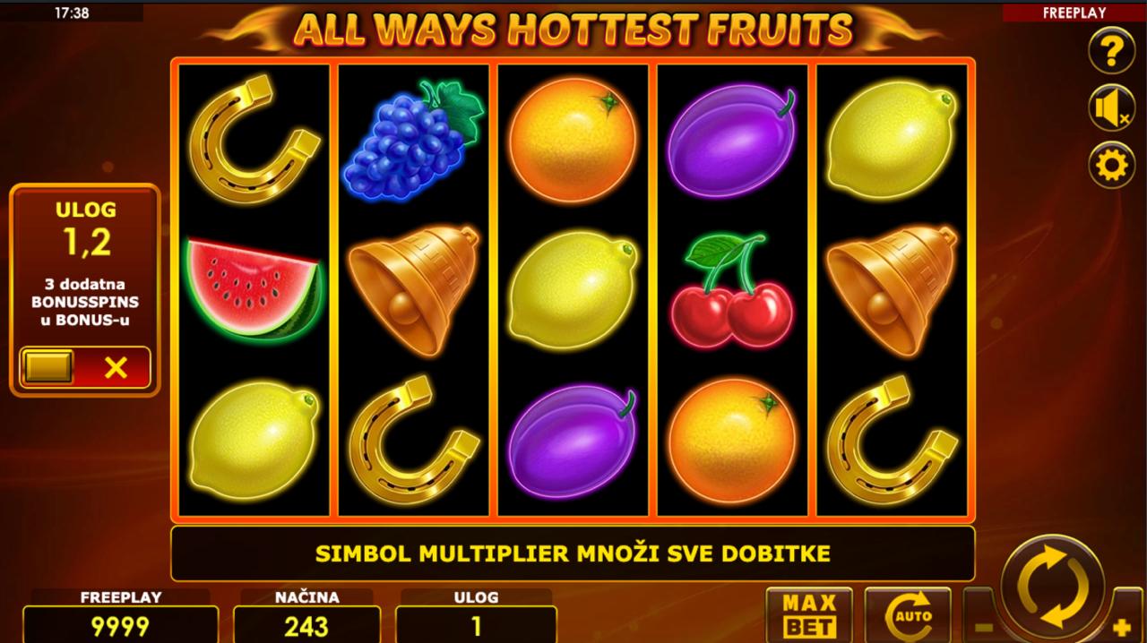 Dobrodošli u svijet klasičnih voćkica i brzih dobitaka! ALL WAYS HOTTEST FRUITS dolazi od providera Oryx i nudi retro-stil slot igru s voćnim simbolima — idealnu za igrače koji vole jednostavnost i klasičnu slot atmosferu. Minimalni ulog iznosi 0,10 €, dok maksimalni iznosi 12,00 €, što igru čini pogodnom i za igrače s manjim budžetom ili one koji žele opušteno igranje. Igra nema jackpot, ali svaki spin donosi šansu za dobitak kroz osnovne isplatne linije. Ako preferiraš jednostavne, klasične slotove — ALL WAYS HOTTEST FRUITS je dobar izbor.