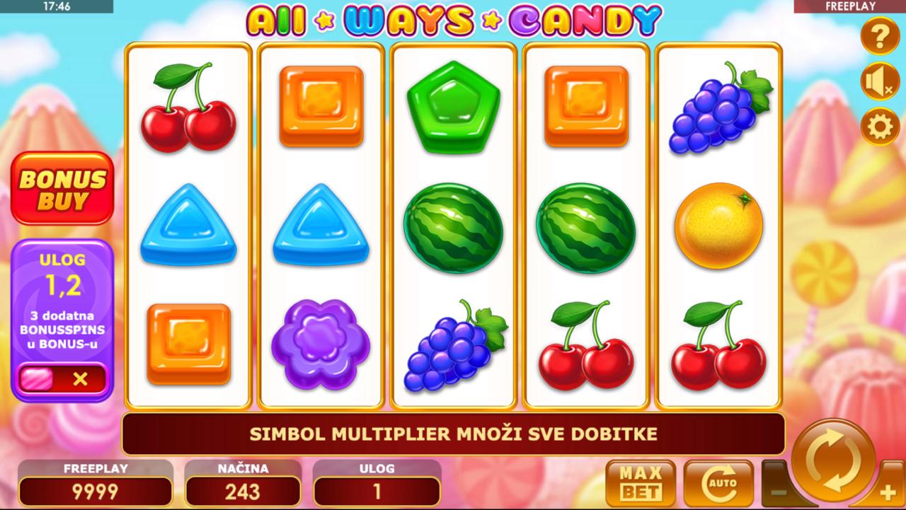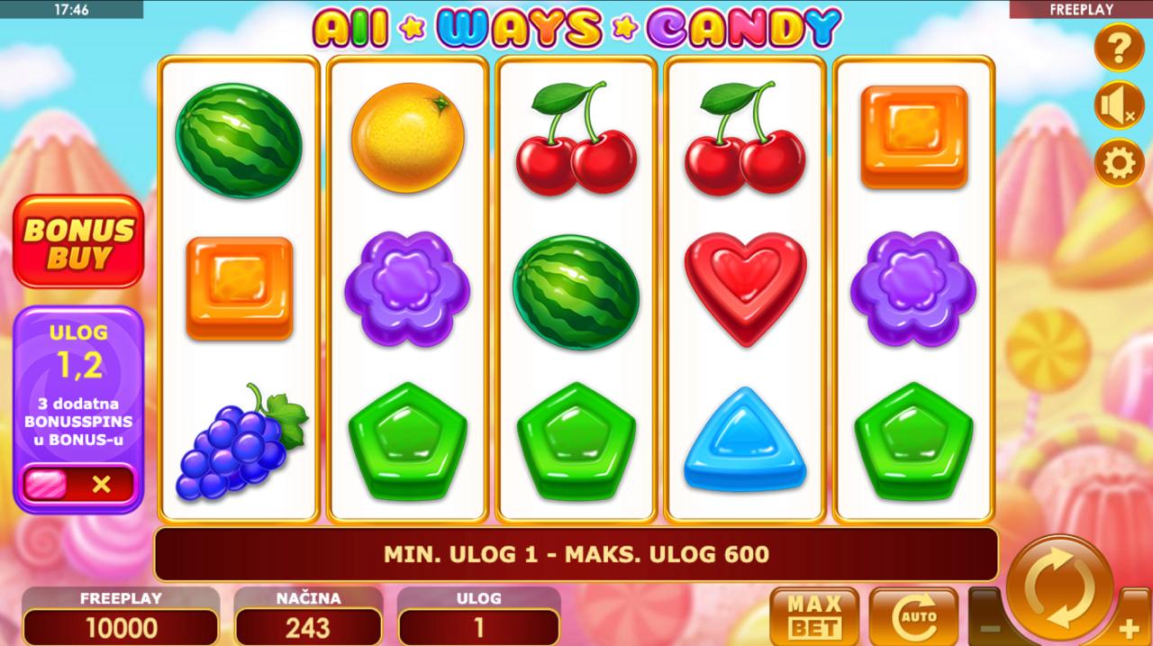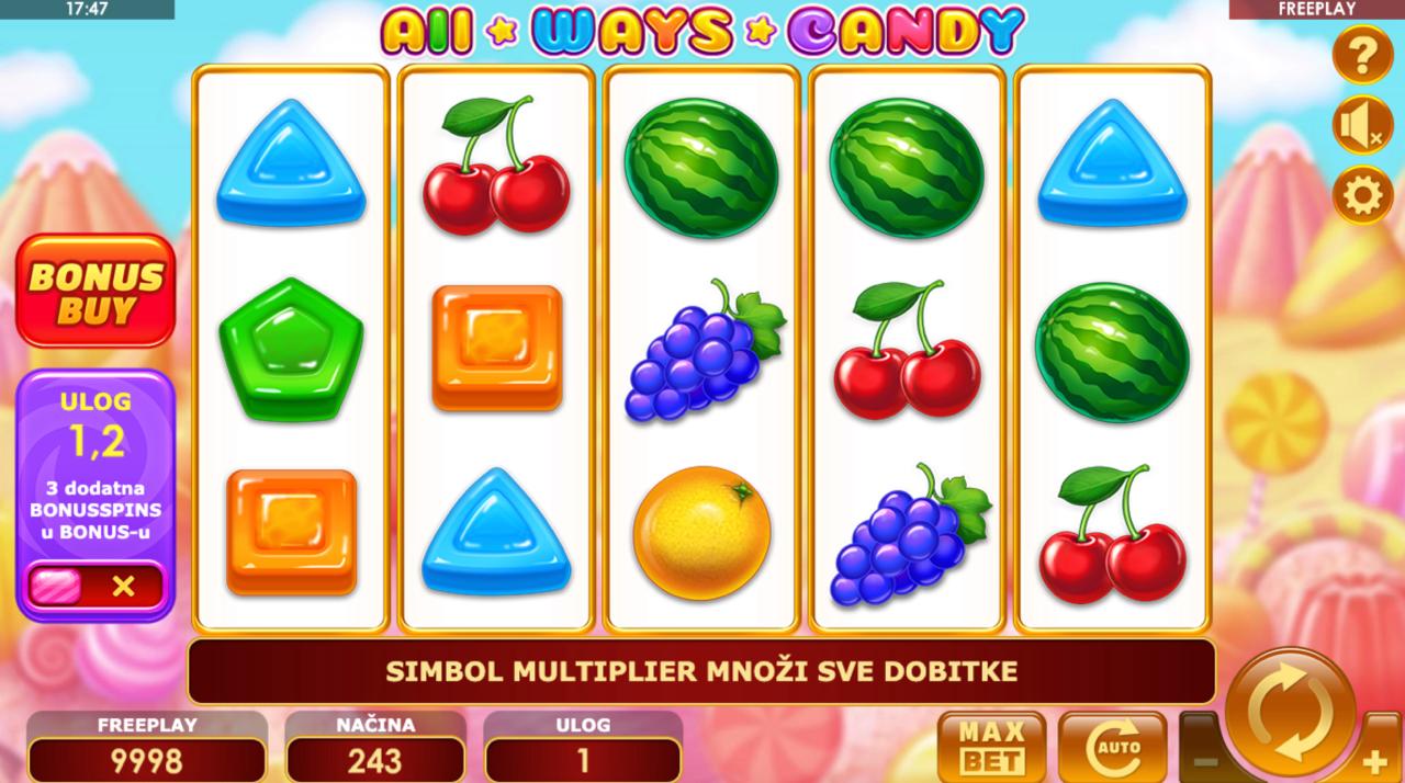 Dobrodošli u šareni svijet slatkiša, užitaka i mogućih dobitaka! ALLWAYS CANDY dolazi od providera Oryx i nudi slot igru s veselim, šarenim simbolima slatkiša — idealnu ako želiš opuštenu, jednostavnu i zabavnu igru bez previše komplikacija. Minimalni ulog iznosi 0,10 €, dok maksimalni iznosi 12,00 €, što igru čini dostupnom igračima s manjim budžetom i onima koji vole laganu zabavu. Igra nema jackpot, ali svaki spin nosi šansu za dobitak zahvaljujući osnovnim isplatnim linijama i pristupačnim ulogom. Ako voliš igre s veselom atmosferom i jednostavnim pravilima — ALLWAYS CANDY je prava igra za tebe!