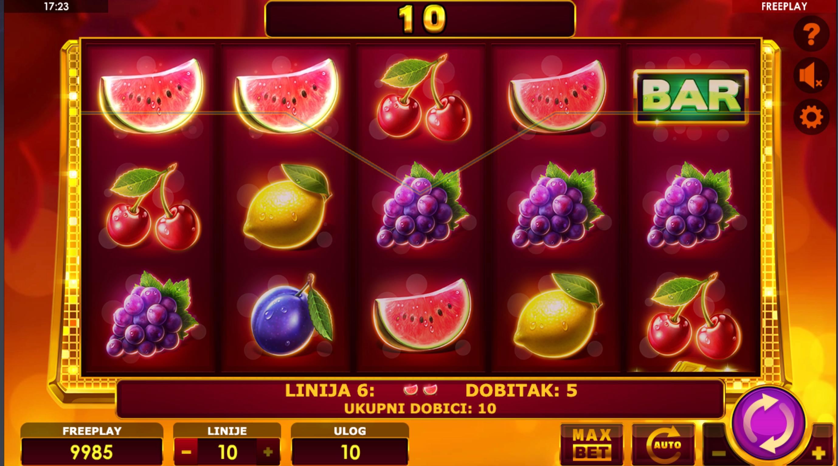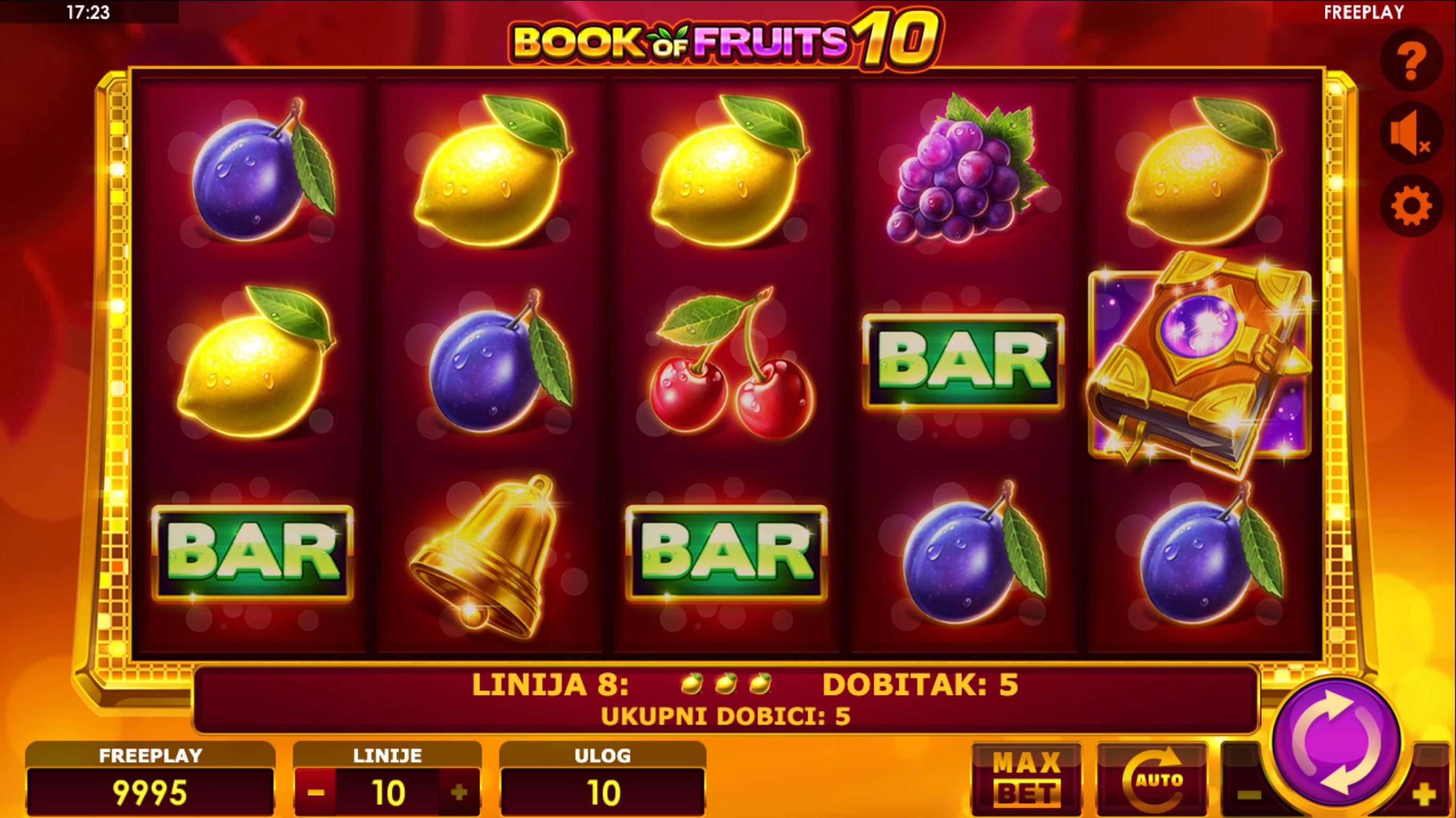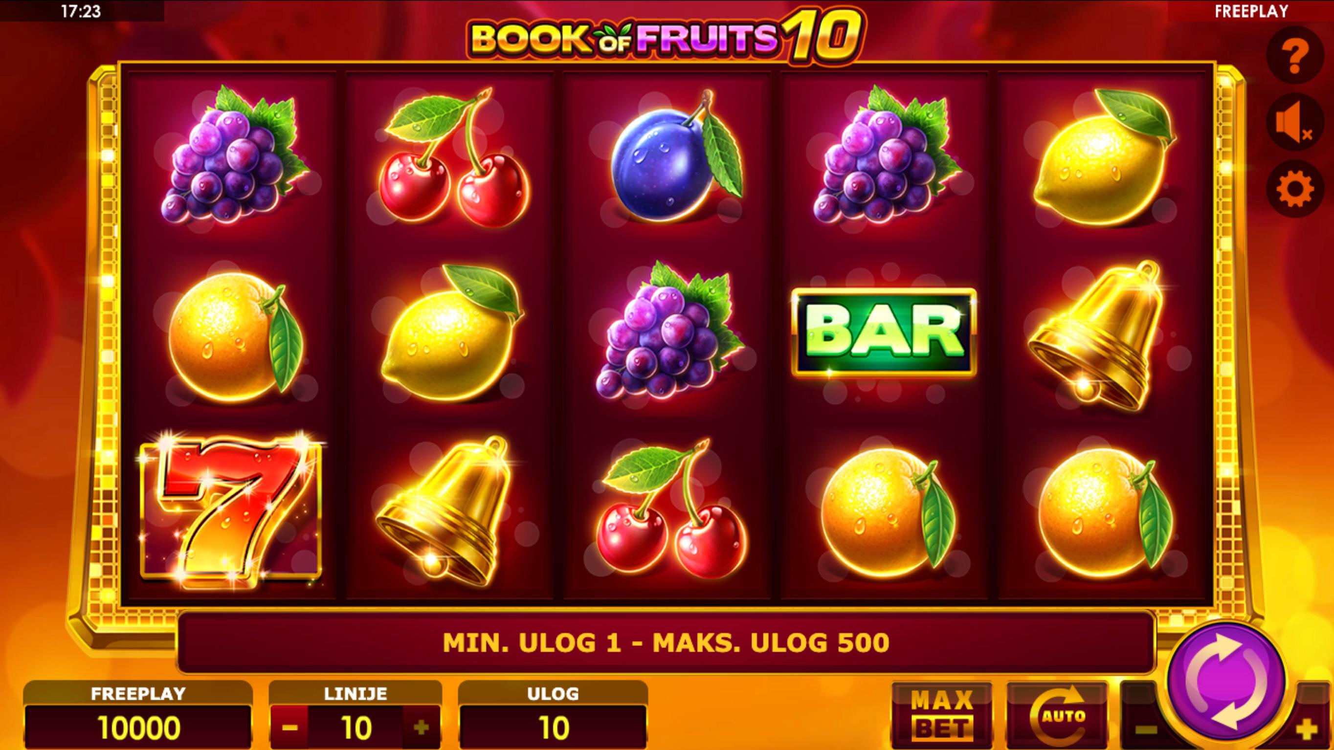 Book of Fruits 10 je slot igra providera Oryx (razvijena pod markom Amatic Industries) koja nudi 5 koluta, 3 reda i 10 isplatnih linija. Tema je voćna s klasičnim simbolima poput trešanja, limuna, sedmica i knjige (“Book”) koja funkcionira kao Wild i Scatter.