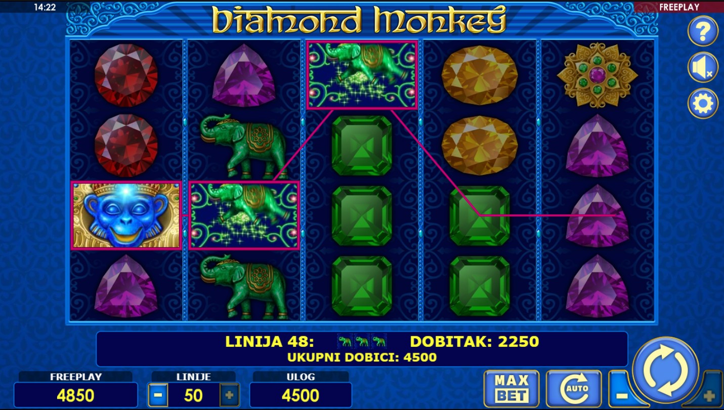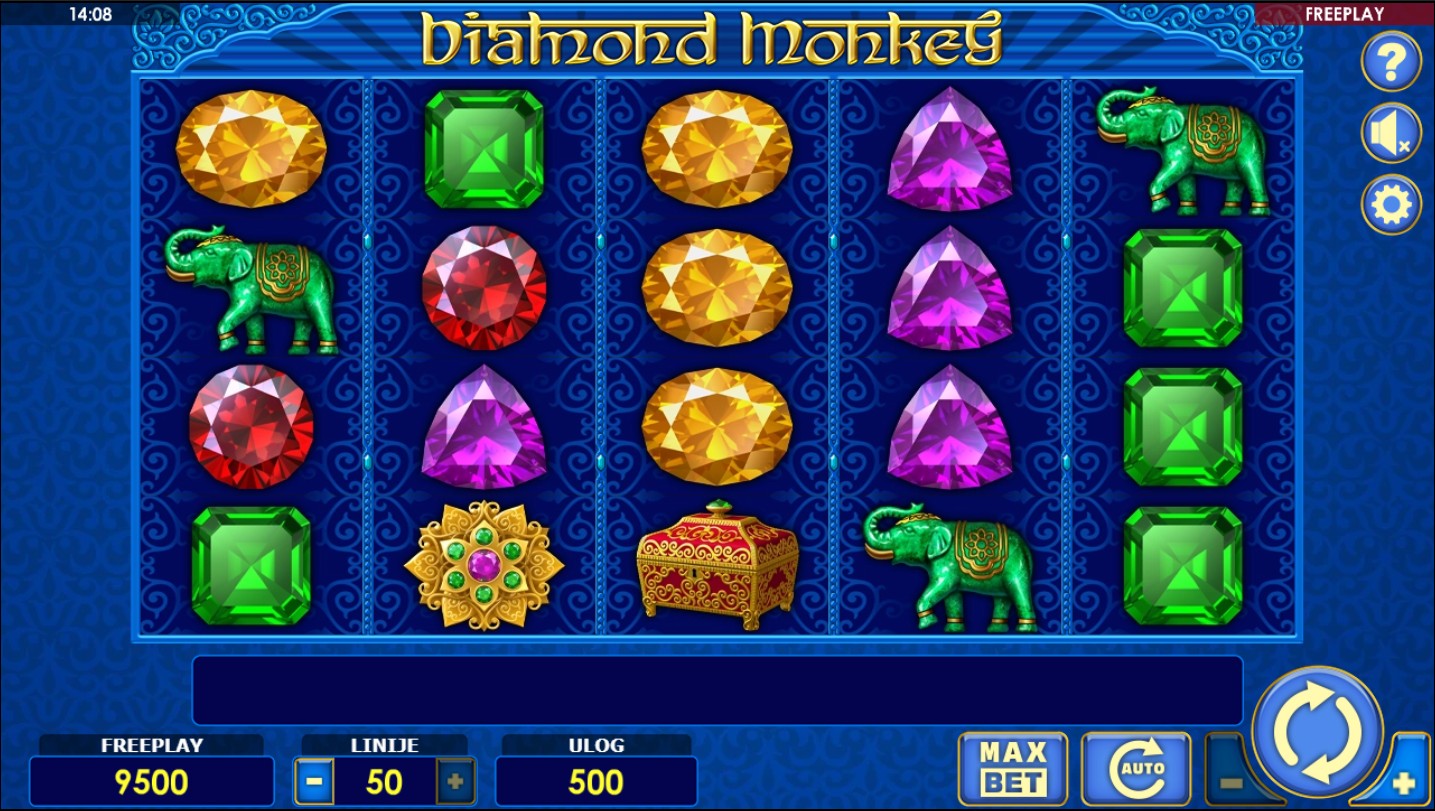 Diamond Monkey se igra na 5 bubnjeva i 50 fiksnih isplatnih linija. Dobitne kombinacije broje se s lijeva na desno, a Wild simbol zamjenjuje sve ostale simbole osim Scatter simbola. Scatter simboli mogu pokrenuti besplatna okretanja ili bonus značajke. Cilj igre je složiti identične simbole na isplatnim linijama kako bi ostvario dobitke, a Wild simboli povećavaju šanse za stvaranje dobitnih kombinacija i dodatnu zabavu tijekom svakog okretanja.