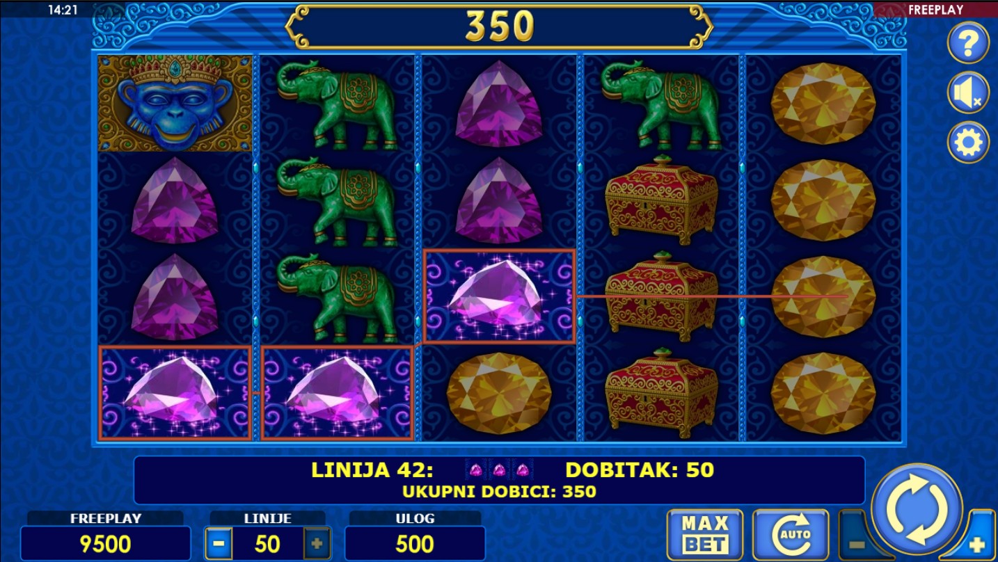 Diamond Monkey je slot igra providera Amatic koja te vodi u džunglu punu zabave, majmuna i sjajnih nagrada. Ova slot igra igra se na 5 bubnjeva i 4 reda s 50 fiksnih isplatnih linija, nudeći jednostavnu, ali uzbudljivu igru s Wild simbolima koji zamjenjuju ostale simbole i pomažu ti da formiraš dobitne kombinacije. Scatter simboli mogu aktivirati bonus značajke i besplatna okretanja, čineći igru dinamičnom i idealnom za sve koji vole klasične slotove s dodatnim uzbuđenjem.
