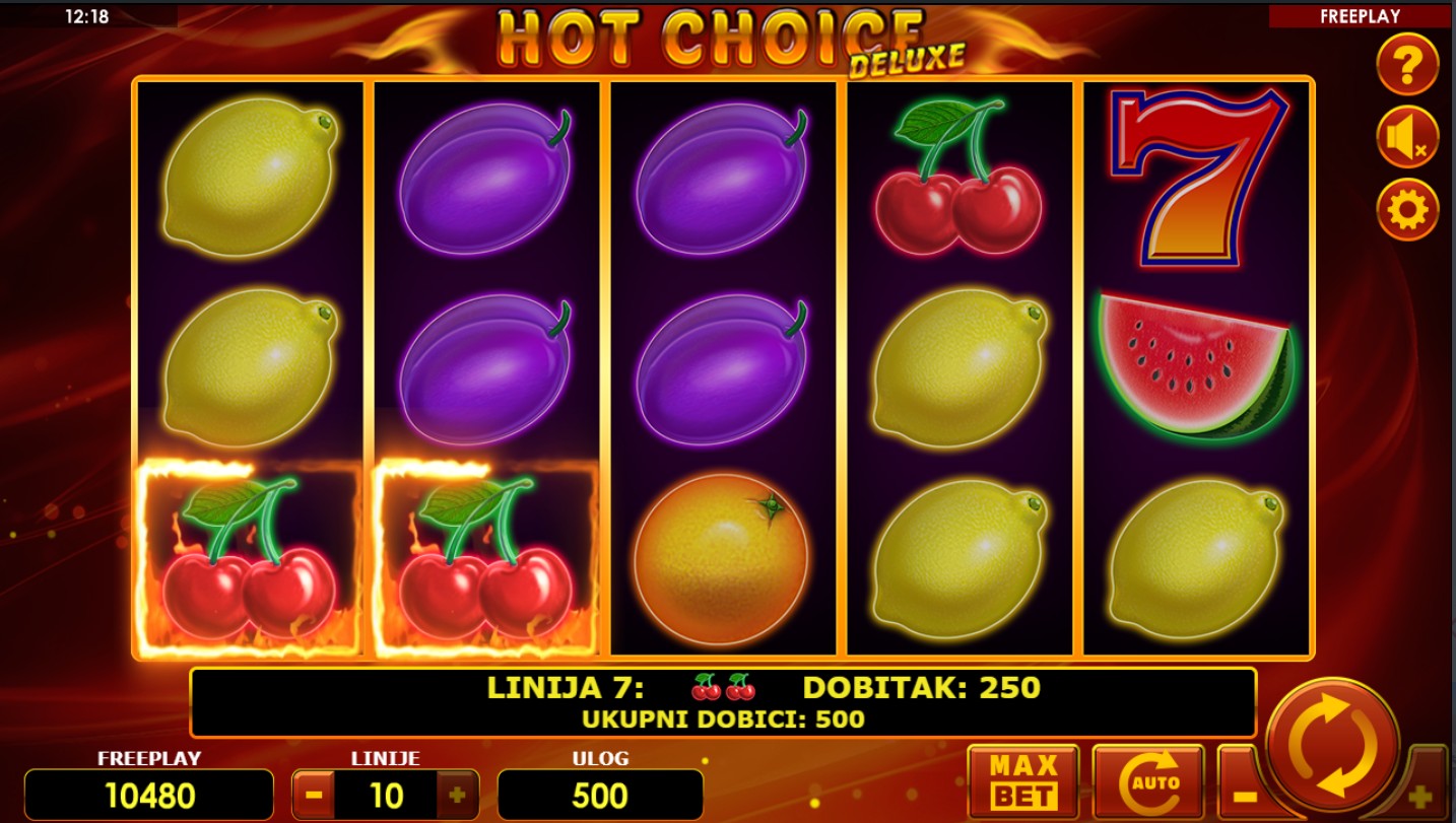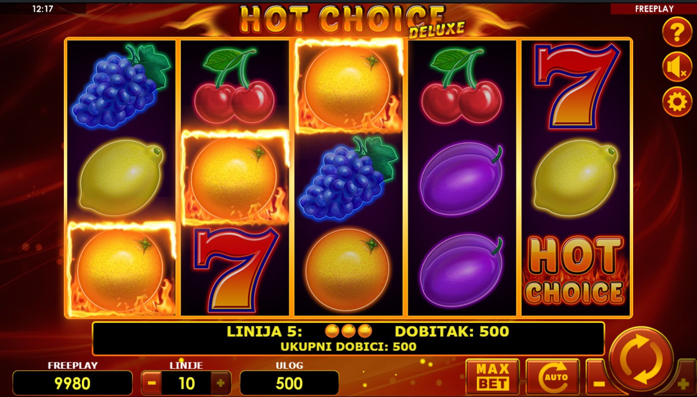 Hot Choice Deluxe se igra na 5 bubnjeva s 10 isplatnih linija. Dobitne kombinacije broje se s lijeva na desno, a Wild simbol zamjenjuje sve ostale simbole osim Scatter simbola. Pojavom tri ili više Scatter simbola aktivira se bonus značajka besplatnih vrtnji, koja donosi dodatne prilike za dobitke. Tijekom osnovne igre mogu se nasumično aktivirati posebne funkcije poput dodatnih Wild simbola ili ponovnog okretanja bubnjeva. Odaberi svoj ulog, pritisni Spin i uživaj u klasičnom, ali uzbudljivom slot doživljaju Hot Choice Deluxe!