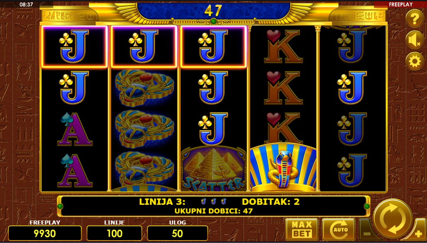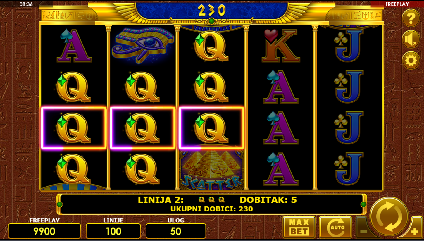 Zavrti kolute i potraži simbole faraona, skarabeja i zlatnih knjiga! Tri ili više Scatter simbola pokreću bonus rundu s besplatnim vrtnjama, dok Wild simboli pomažu da spojiš dobitne kombinacije. Igra je jednostavna, ali moćna, klasičan slot s modernim tempom i 100 isplatnih linija. Svaka vrtnja je tvoj korak dublje u egipatske riznice!