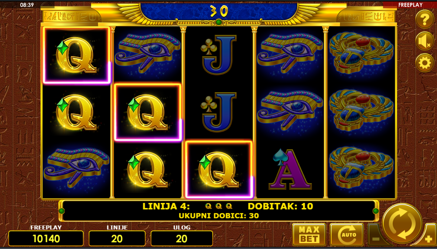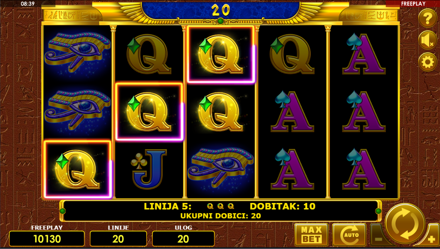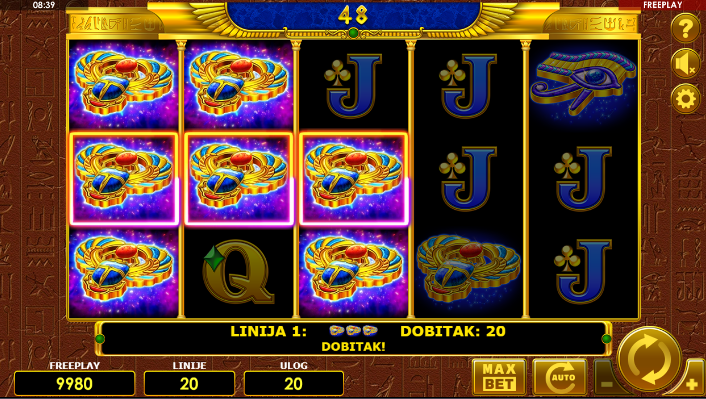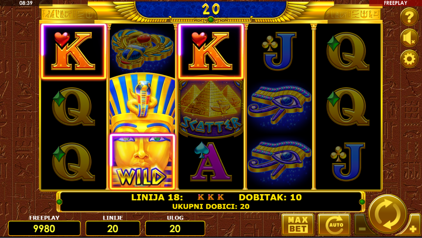 Vrti kolute i traži svete simbole faraona, skarabeja i knjiga! Tri ili više Scatter simbola otključavaju bonus rundu s besplatnim vrtnjama, dok Wild simboli povećavaju tvoje šanse za pobjedu. Igra nudi savršenu kombinaciju jednostavnosti i uzbuđenja, s 20 linija koje stalno nude nove prilike. Svaka vrtnja može pretvoriti pijesak pustinje u zlato!