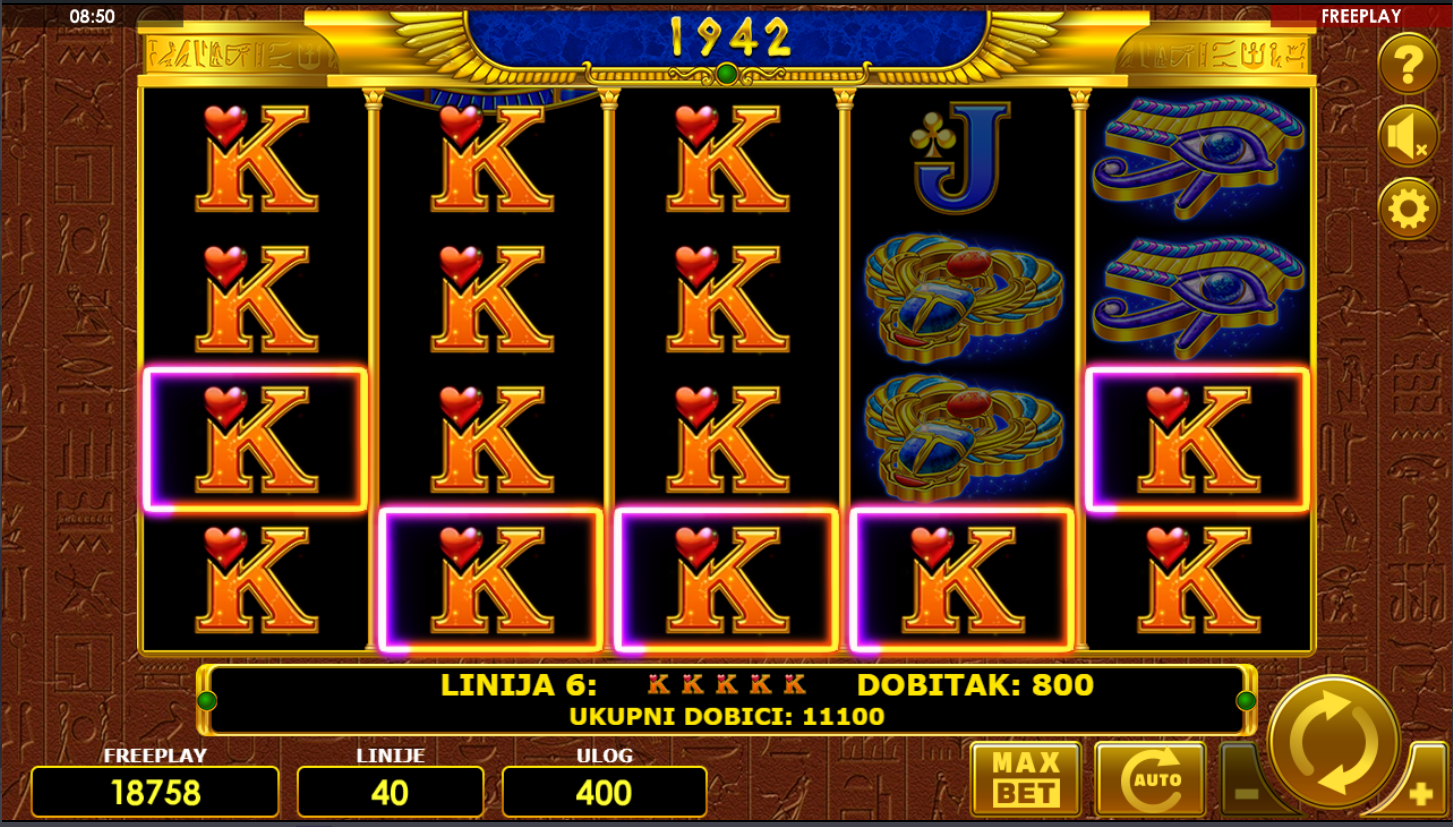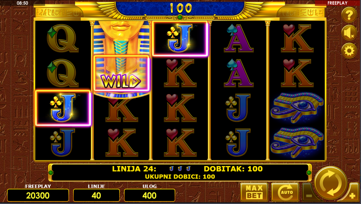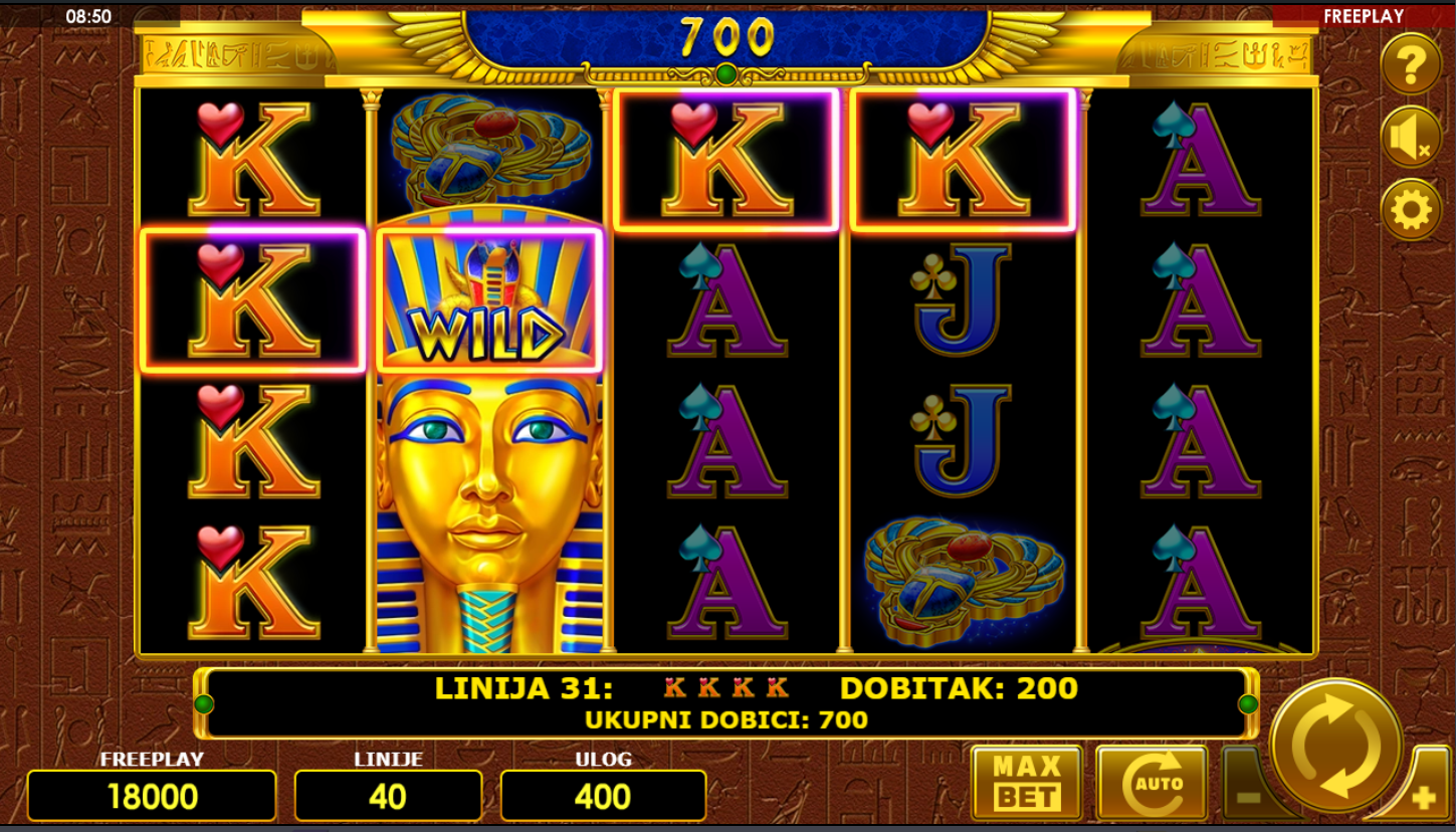 Vrti kolute i traži simbole faraona, skarabeja, knjiga i zlatnih maski! Wild simboli zamjenjuju sve ostale, dok Scatteri otključavaju posebne dobitke. Igra kombinira jednostavnost klasičnih slotova s uzbudljivom modernom dinamikom i 40 linija koje nude mnoštvo prilika za pobjedu. Uđi u hram sreće i pusti da te bogovi Egipta nagrade!