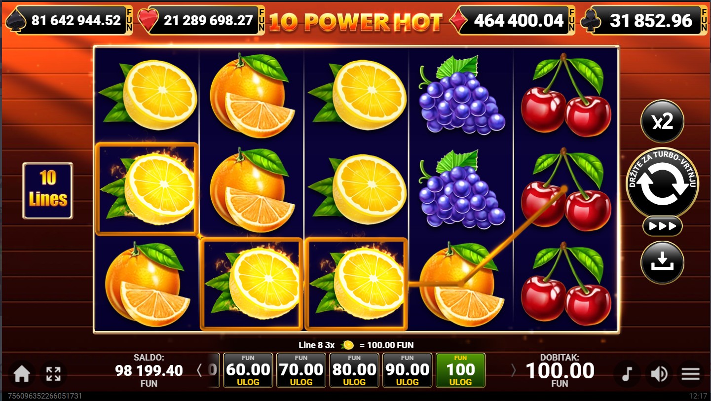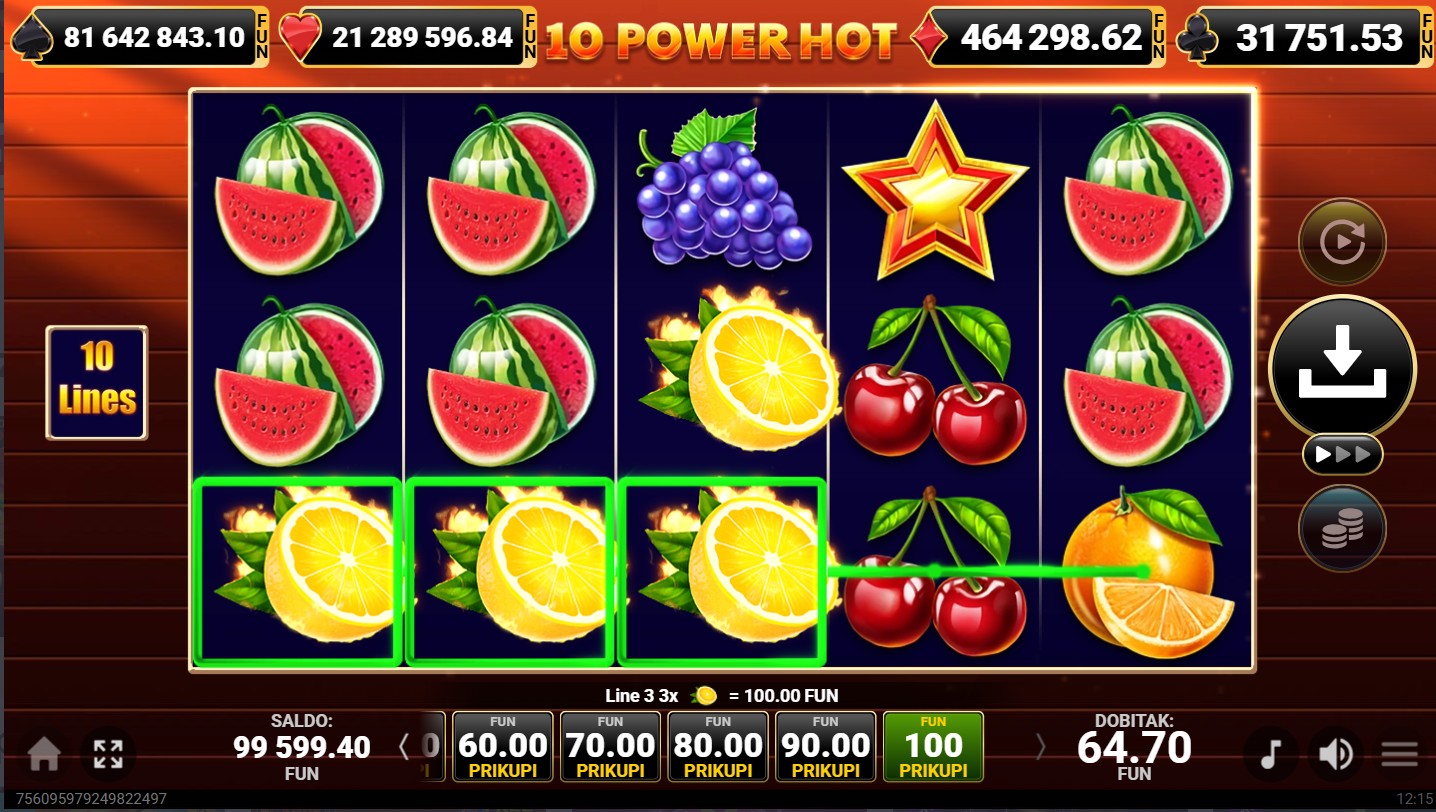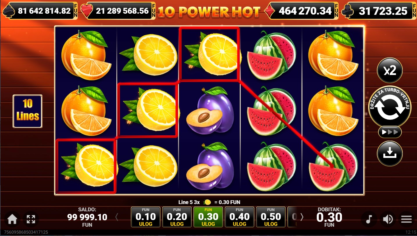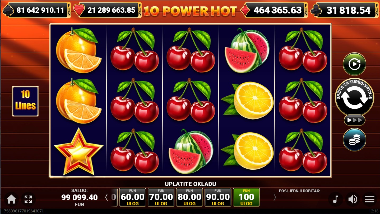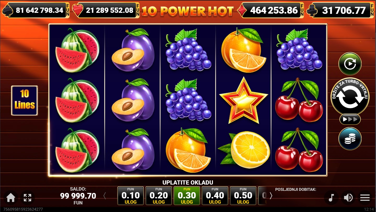 10 Power Hot se igra na 5 valjaka i 3 reda s 10 isplatnih linija. Dobitne kombinacije formiraju se kada se isti simboli slože na aktivnim linijama, a cilj je složiti što više istih simbola kako bi ostvario nagrade. Posebni simboli mogu povećati šanse za dobitak, dok svako okretanje donosi novu priliku za uzbudljivu voćnu avanturu. Za dodatno uzbuđenje tu je i mogućnost dobitka besplatnih vrtnji, kao i bogatog jackpota.