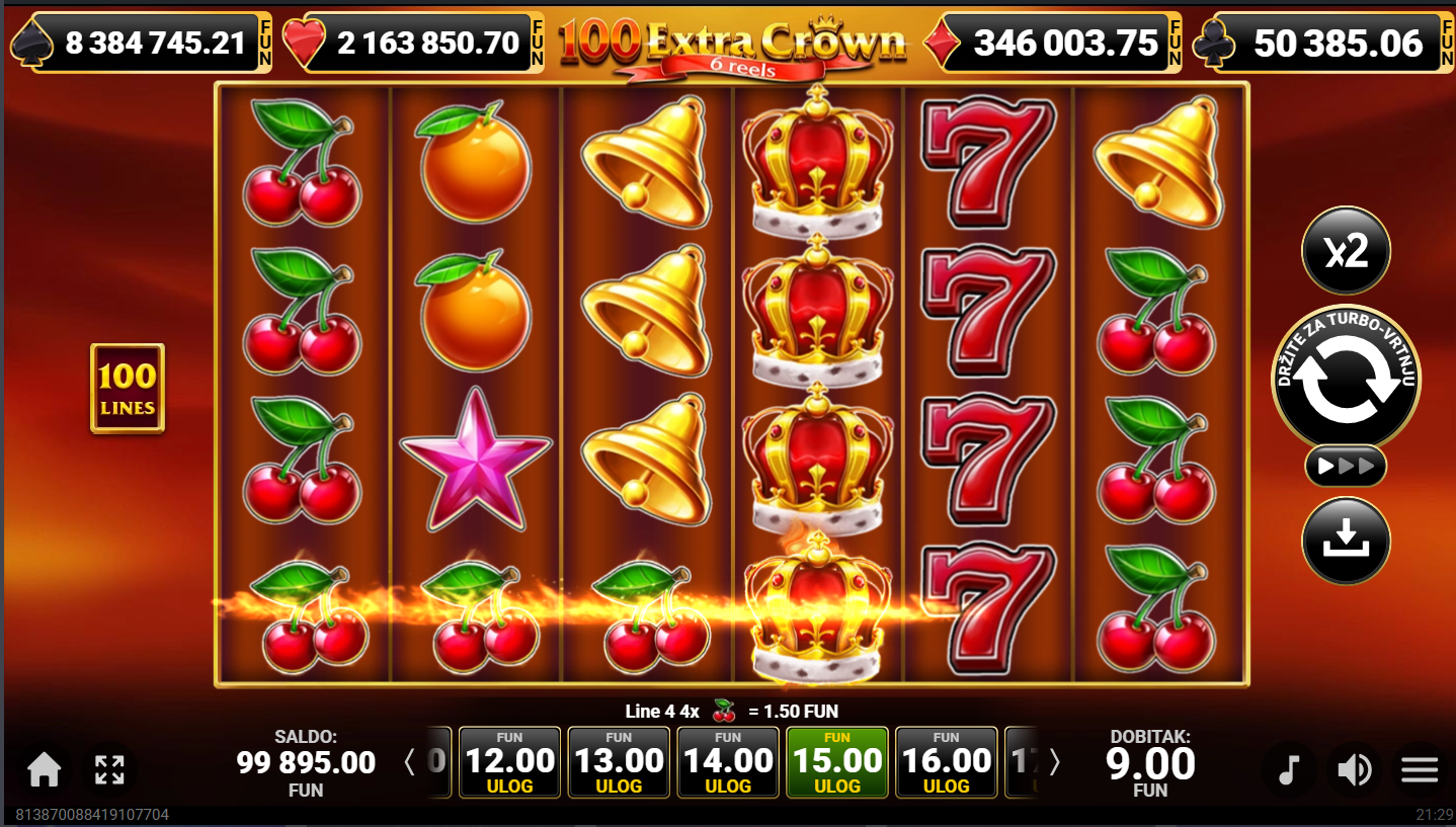 100 Extra Crown 6 Reels ima RTP 96% i srednju volatilnost.