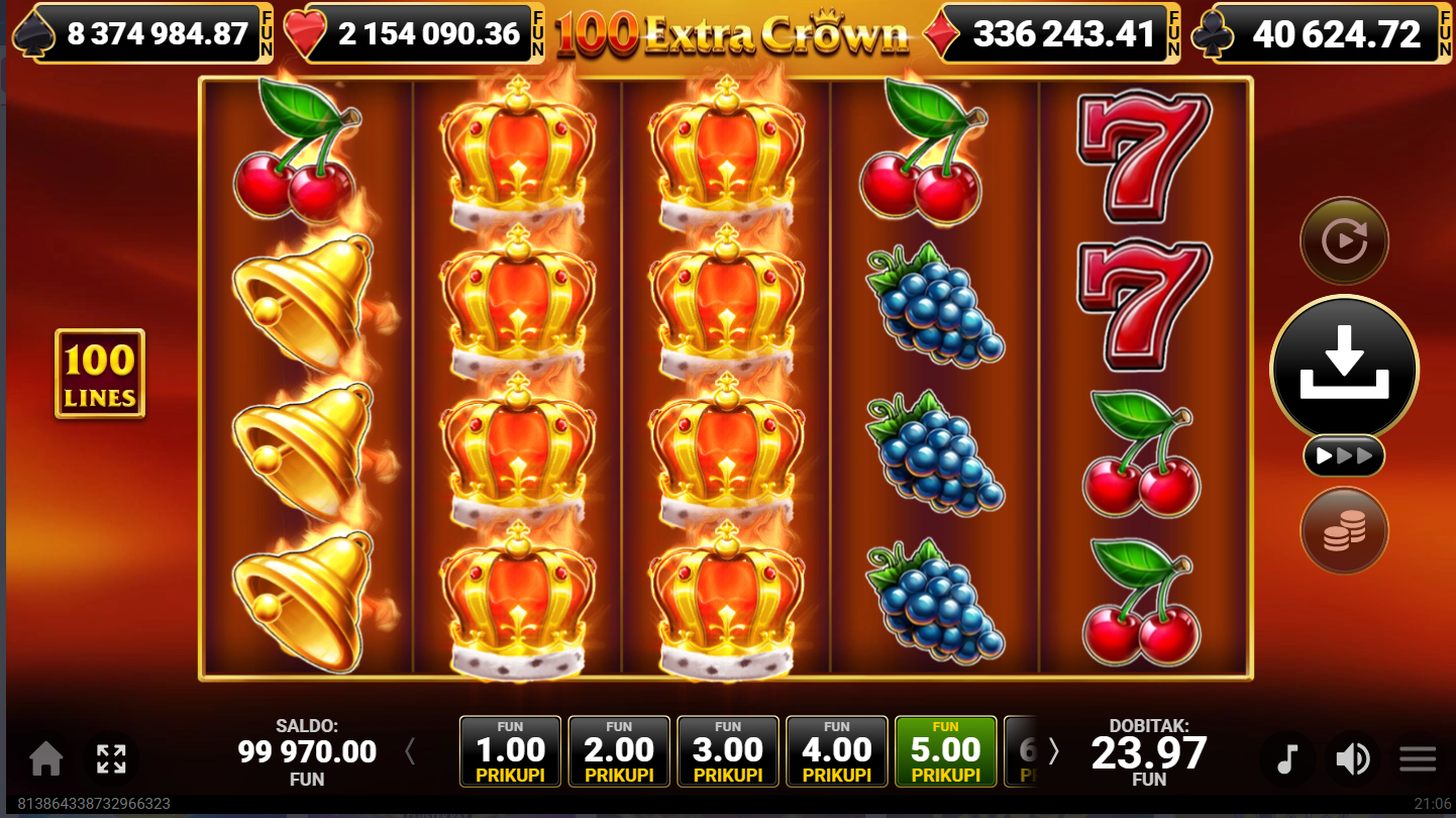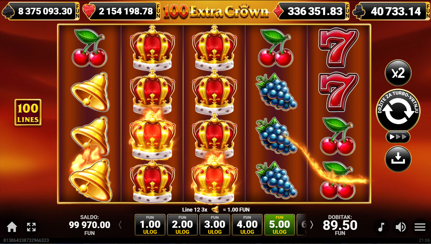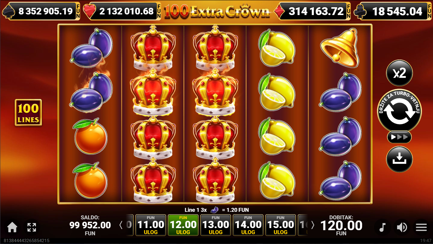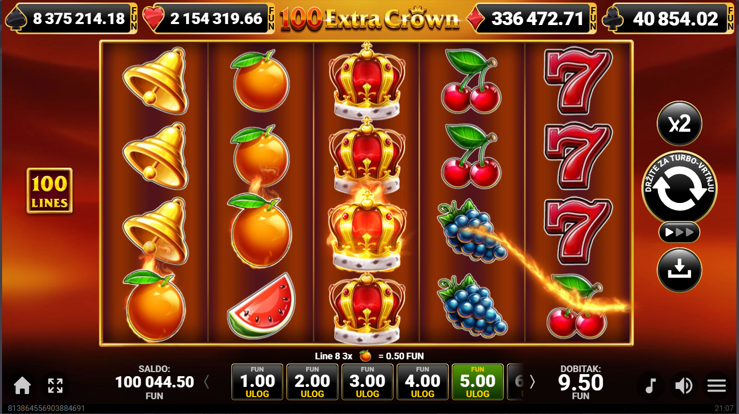 100 Extra Crown od provideraAmusnet je online video slot koji se odvija u kraljevskom okruženju s elegantnim simbolima i vizualima inspiriranim klasičnim automatima. U igri dominiraju simboli voća, zvona, sedmica i krune, pri čemu Crown Wild simbol zauzima posebno mjesto jer može pomoći u formiranju većih dobitnih kombinacija i širenjem na bubnjevima. Scatter simboli povećavaju šanse za veće isplate i mogu aktivirati posebne bonuse.