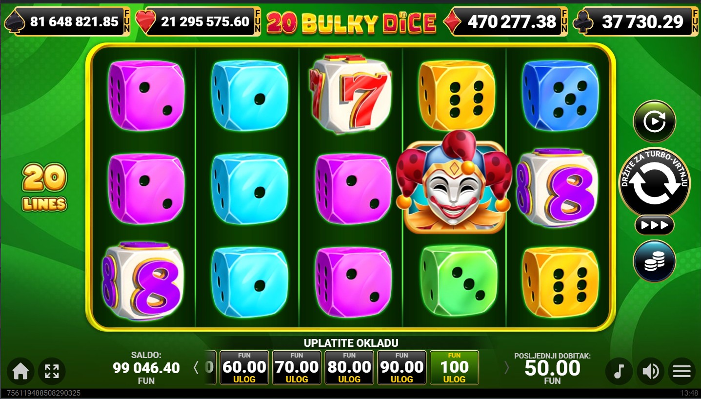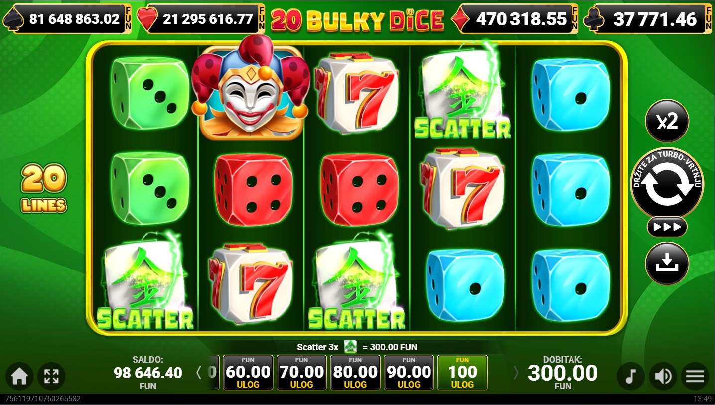 20 Bulky Dice se igra na 5 valjaka i 3 reda s 20 isplatnih linija. Dobitne kombinacije formiraju se kada se isti simboli slože na aktivnim linijama, a cilj je složiti što više identičnih simbola kako bi osvojio nagrade. Veliki simboli kockica zauzimaju više mjesta na valjcima, čime se povećavaju šanse za dobitak. Nakon svakog dobitnog okretanja možeš aktivirati opciju za udvostručenje dobitka odabirom boje karte, dok svako okretanje pruža novu priliku za osvajanje jackpota i dinamičnu, zabavnu avanturu.