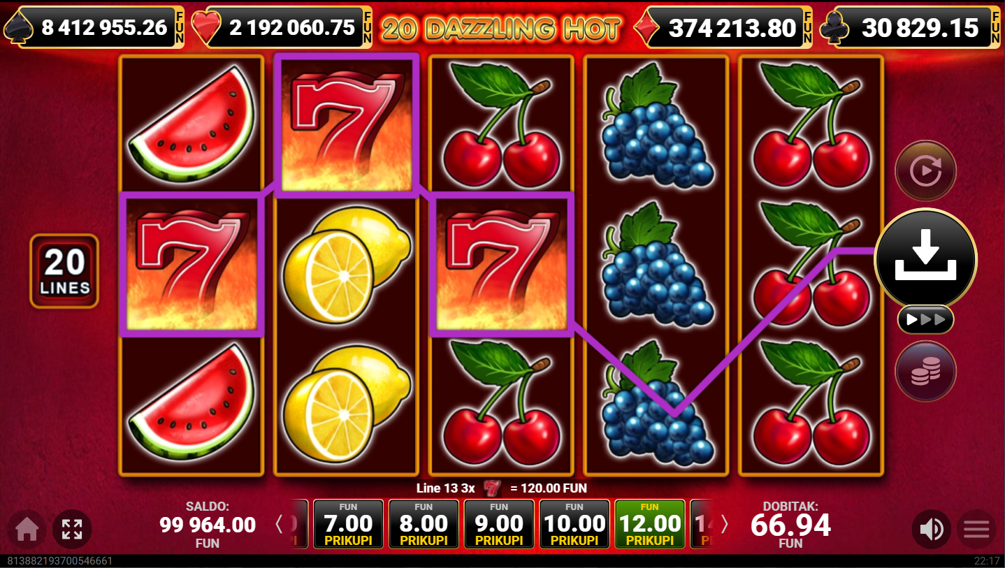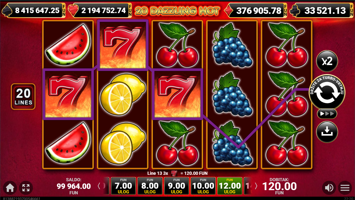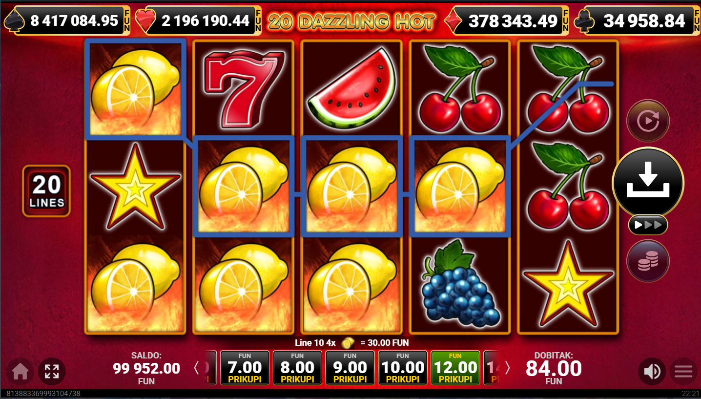 20 Dazzling Hot od Amusnet je klasični voćni slot koji ima pet bubnjeva i tri reda i 20 isplatnih linija. Svojom jednostavnom, ali energičnom temom kombinira tradicionalni stil s modernim elementima na ekranu. Vizualno podsjeća na klasične fruit slotove sa simbolima poput trešanja, limuna, šljiva i sedmica, a cilj je jednostavan: Složiti iste simbole s lijeva na desno.