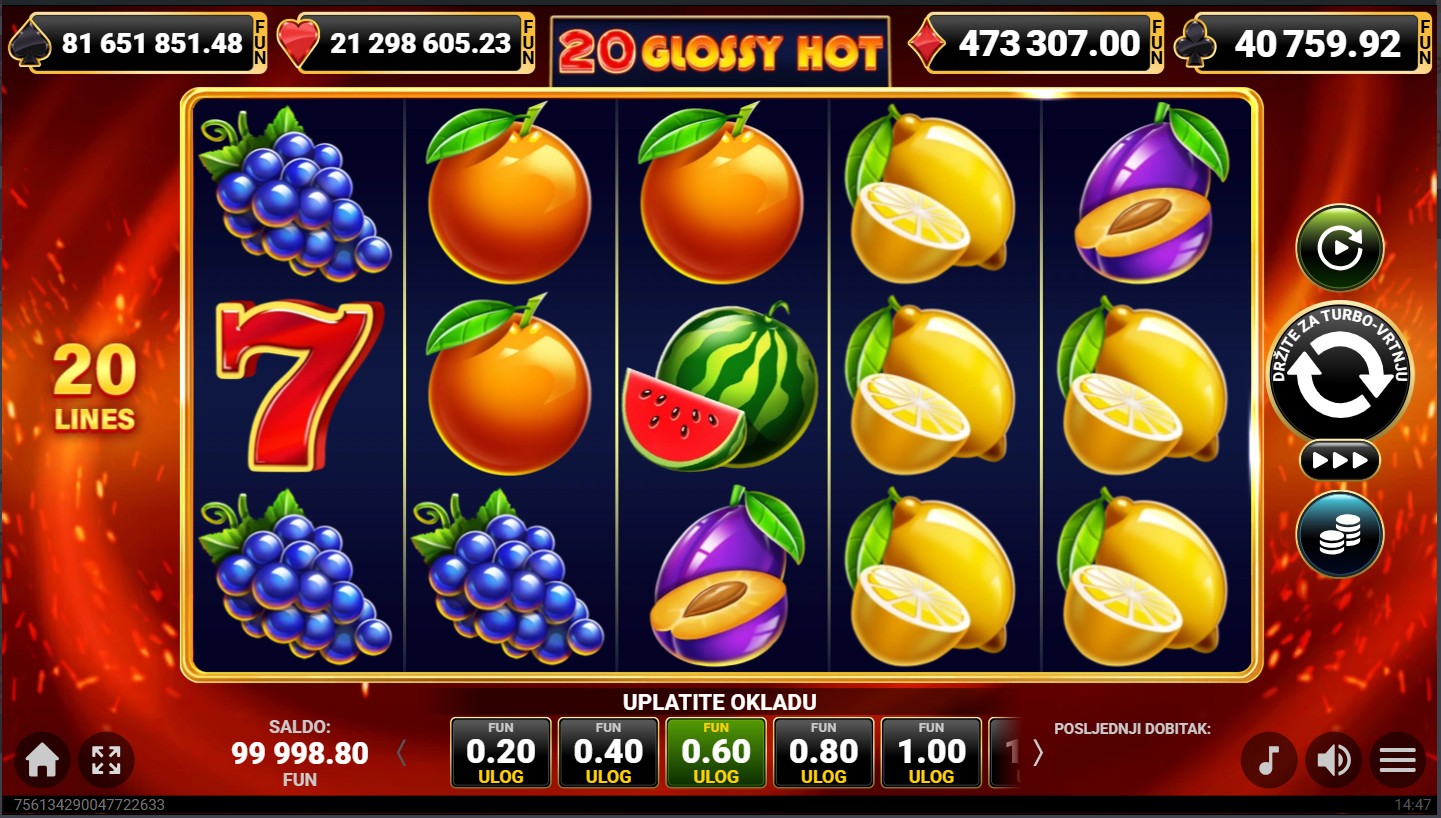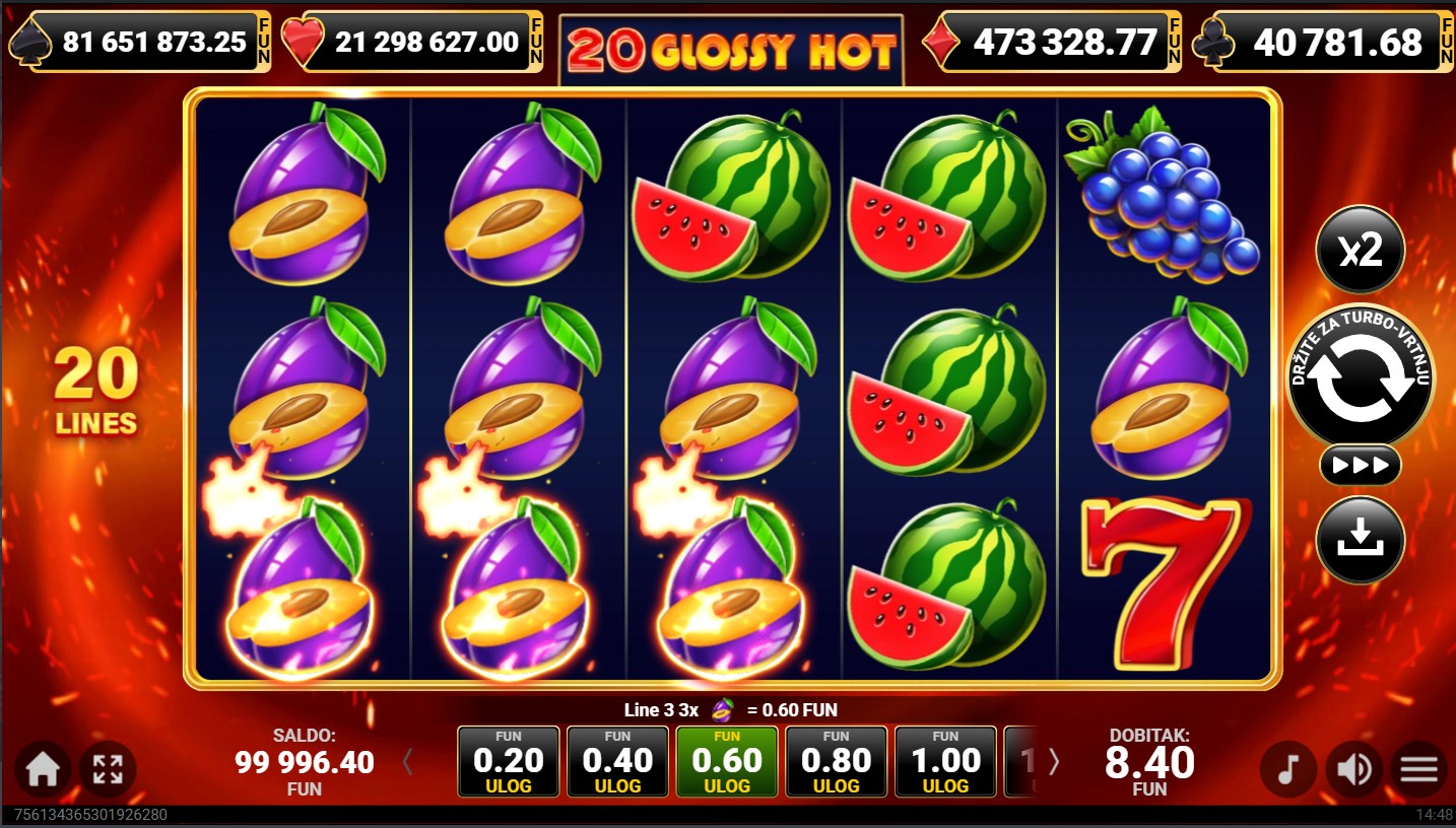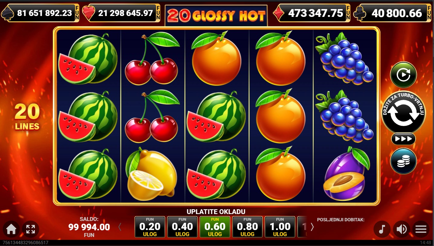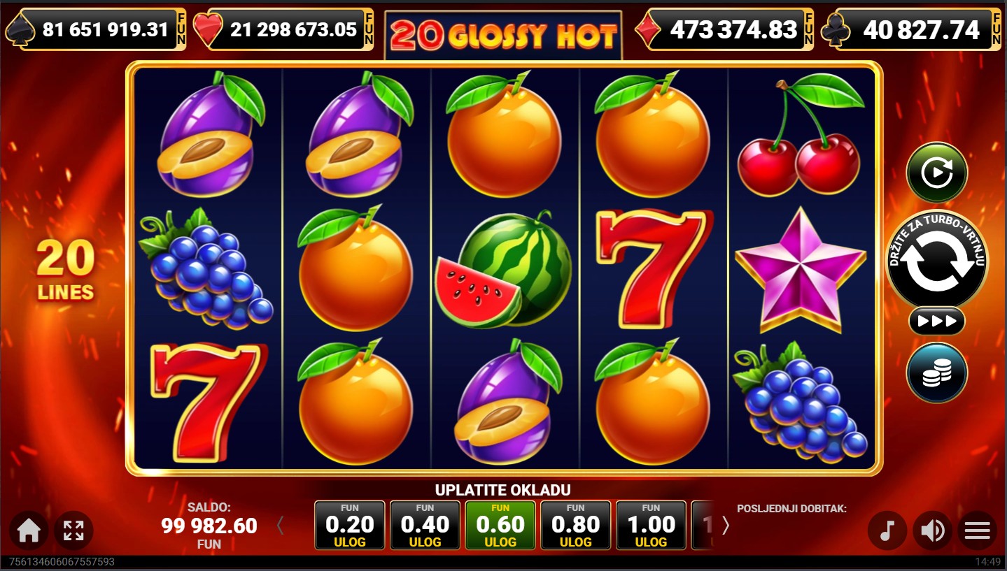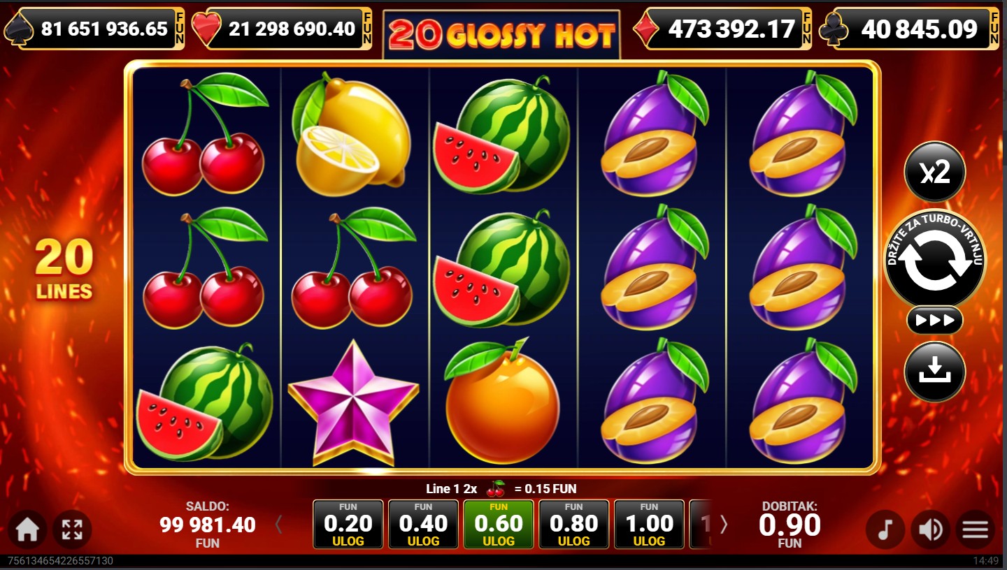 20 Glossy Hot se igra na 5 valjaka i 3 reda s 20 isplatnih linija. Dobitne kombinacije formiraju se kada se isti simboli slože na aktivnim linijama, a cilj je složiti što više identičnih simbola kako bi osvojio nagrade. Sjajni simboli voća zauzimaju više mjesta na valjcima, čime se povećavaju šanse za dobitak. Nakon svakog dobitnog okretanja možeš aktivirati opciju za udvostručenje dobitka odabirom boje karte, dok svako okretanje pruža novu priliku za osvajanje jackpota, besplatnih vrtnji i dinamičnu, zabavnu avanturu.