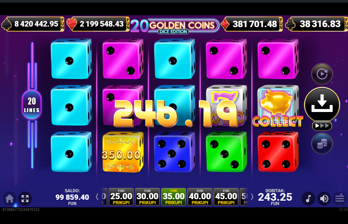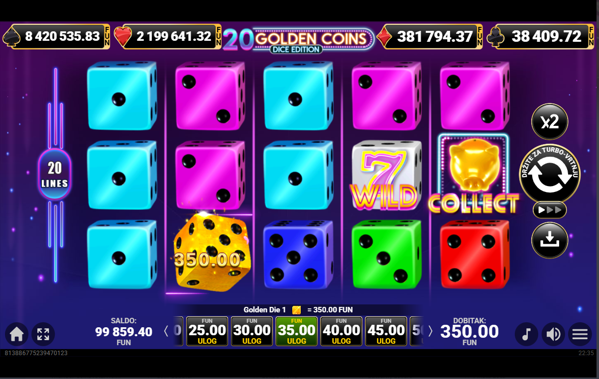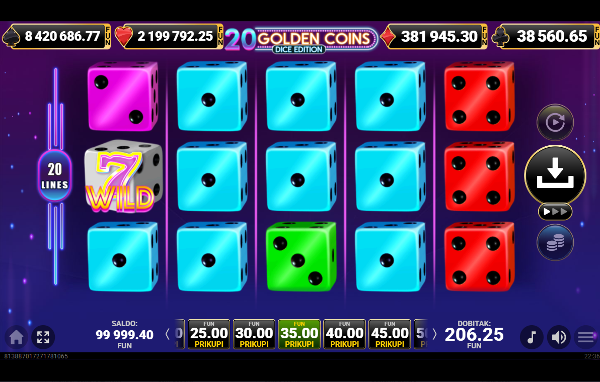 20 Golden Coins Dice Edition ima RTP 96,31% i nisku volatilnost.