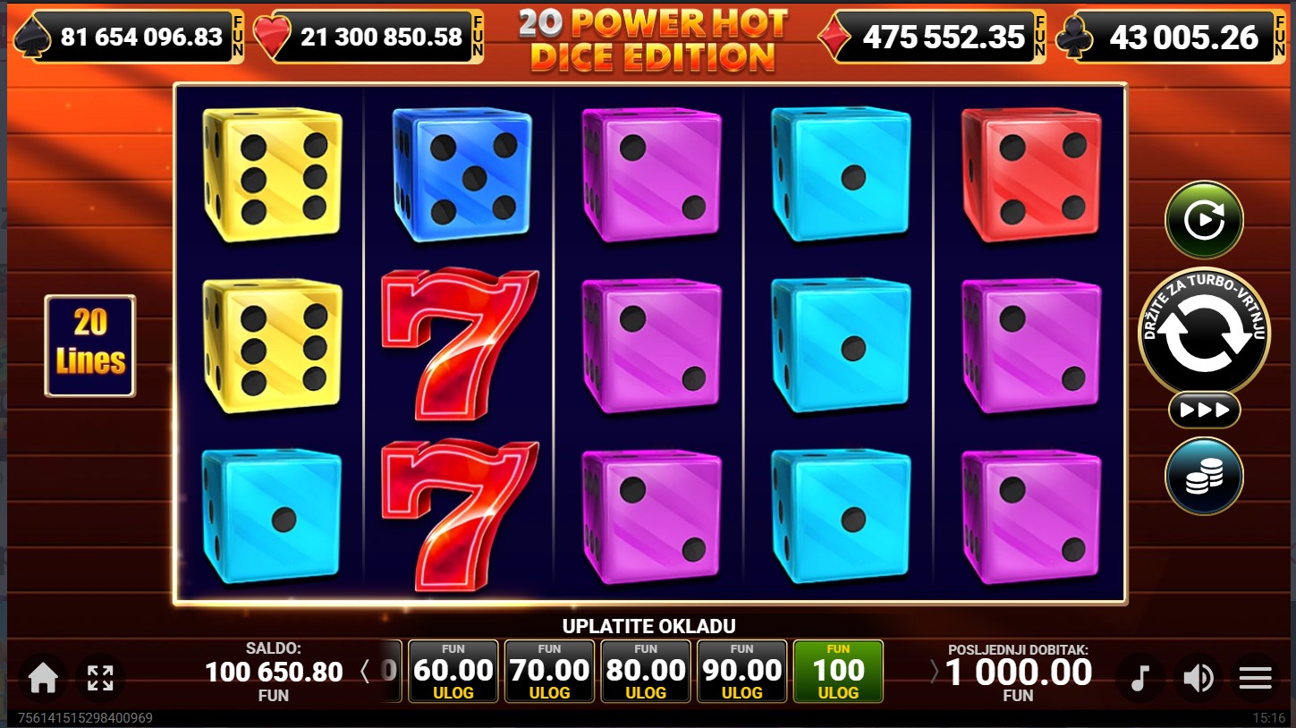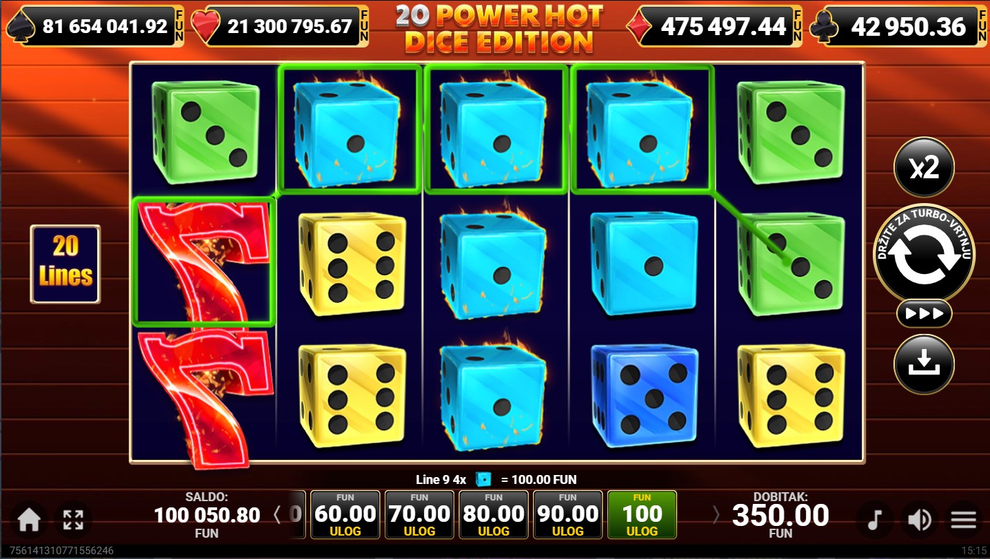 20 Power Hot Dice Edition se igra na 5 valjaka i 3 reda s 20 isplatnih linija. Dobitne kombinacije formiraju se kada se isti simboli slože na aktivnim linijama, a cilj je složiti što više identičnih simbola za nagrade. Simboli kockica donose dodatnu dinamiku igri, dok svako okretanje pruža novu priliku za zabavu. Nakon svakog dobitnog spina možeš iskoristiti opciju za udvostručenje dobitka biranjem boje karte, a svaki spin krije i priliku za osvajanje jackpota, kao i mogućnost dobitka nagradne vrtnje.
