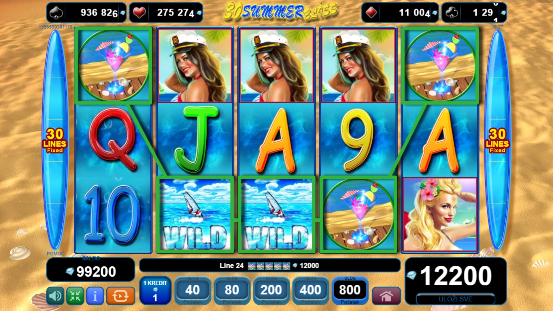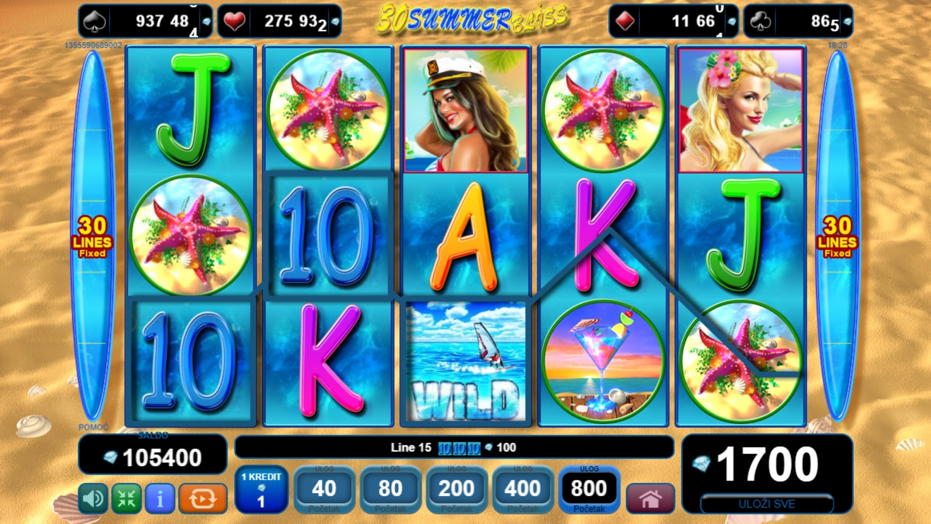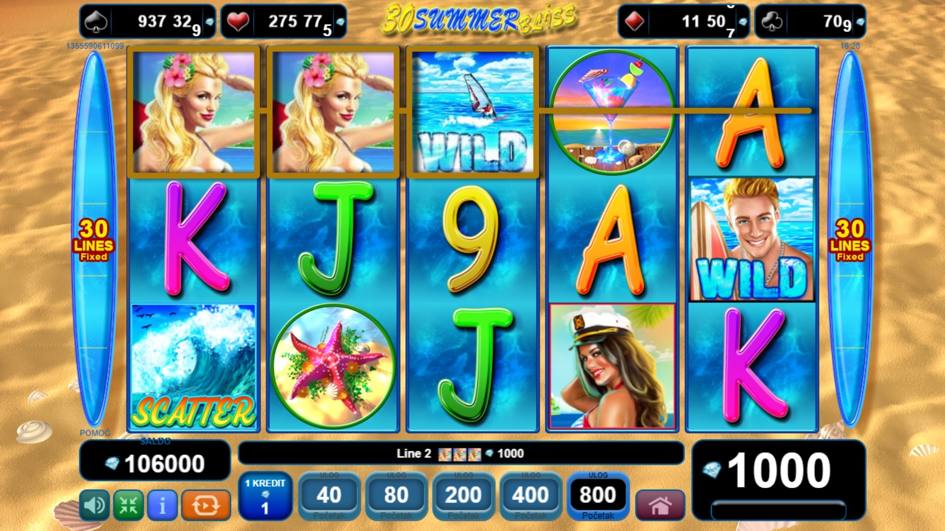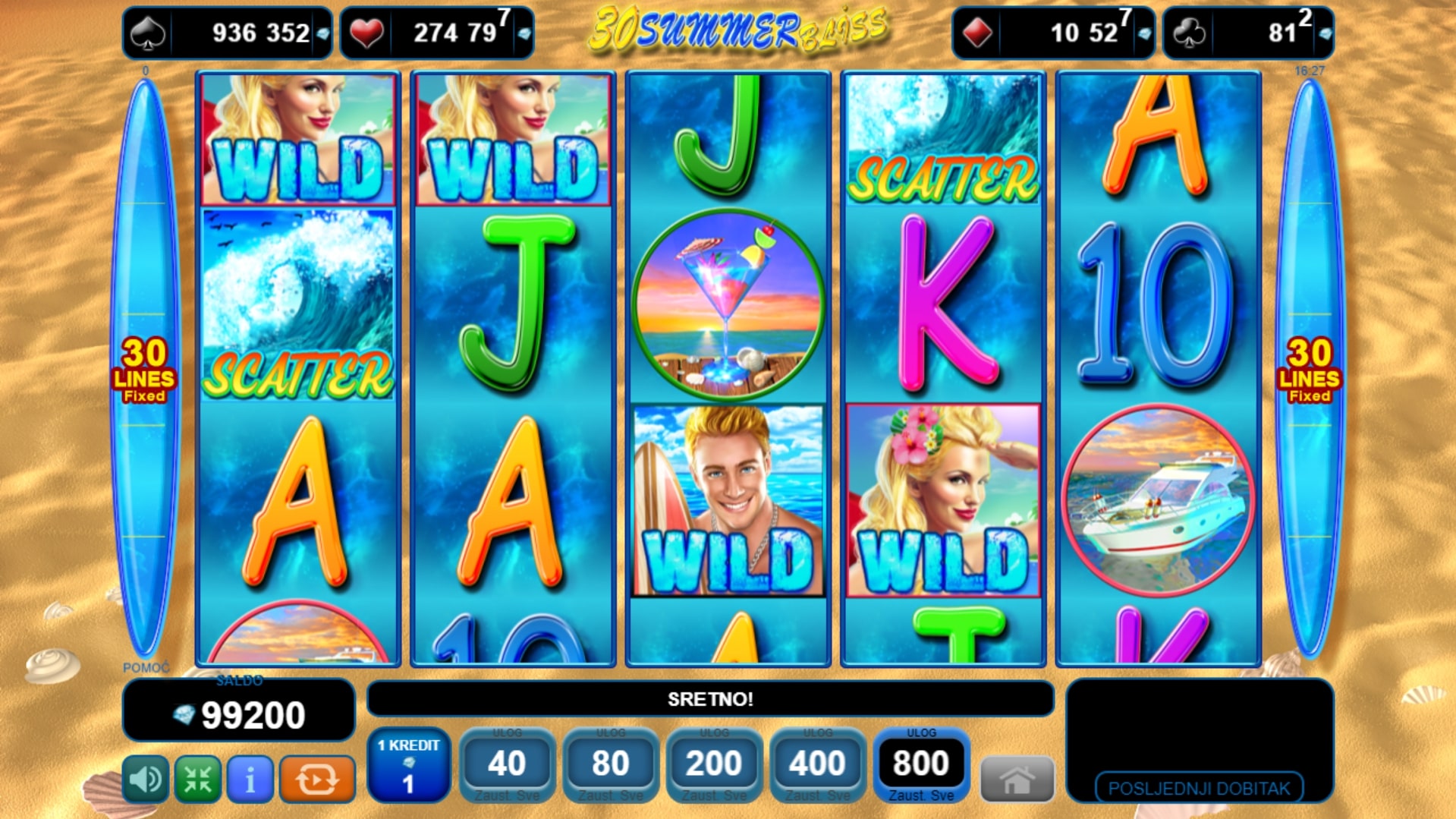 30 Summer Bliss slot je igra ljetnog ugođaja koja vodi igrača u nezaboravnu avanturu predivnim plažama i kristalno plavim morem. Najviše isplaćuju simboli jahta, ljepotica s plaže te surfera koji također ima funkciju zamjene drugih simbola u potrazi za dobicima. Najveći gušt ipak stvaraju valovi koji nizanjem na kolutu vode igrača u svijet besplatnih vrtnji. Kroz vrijeme igrač može ostvariti i tajanstveni Jackpot te dobitke dovesti na nove razine. Zaigraj 30 Summer Bliss te osvoji osvježavajuće dobitke!