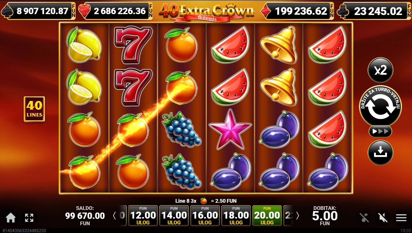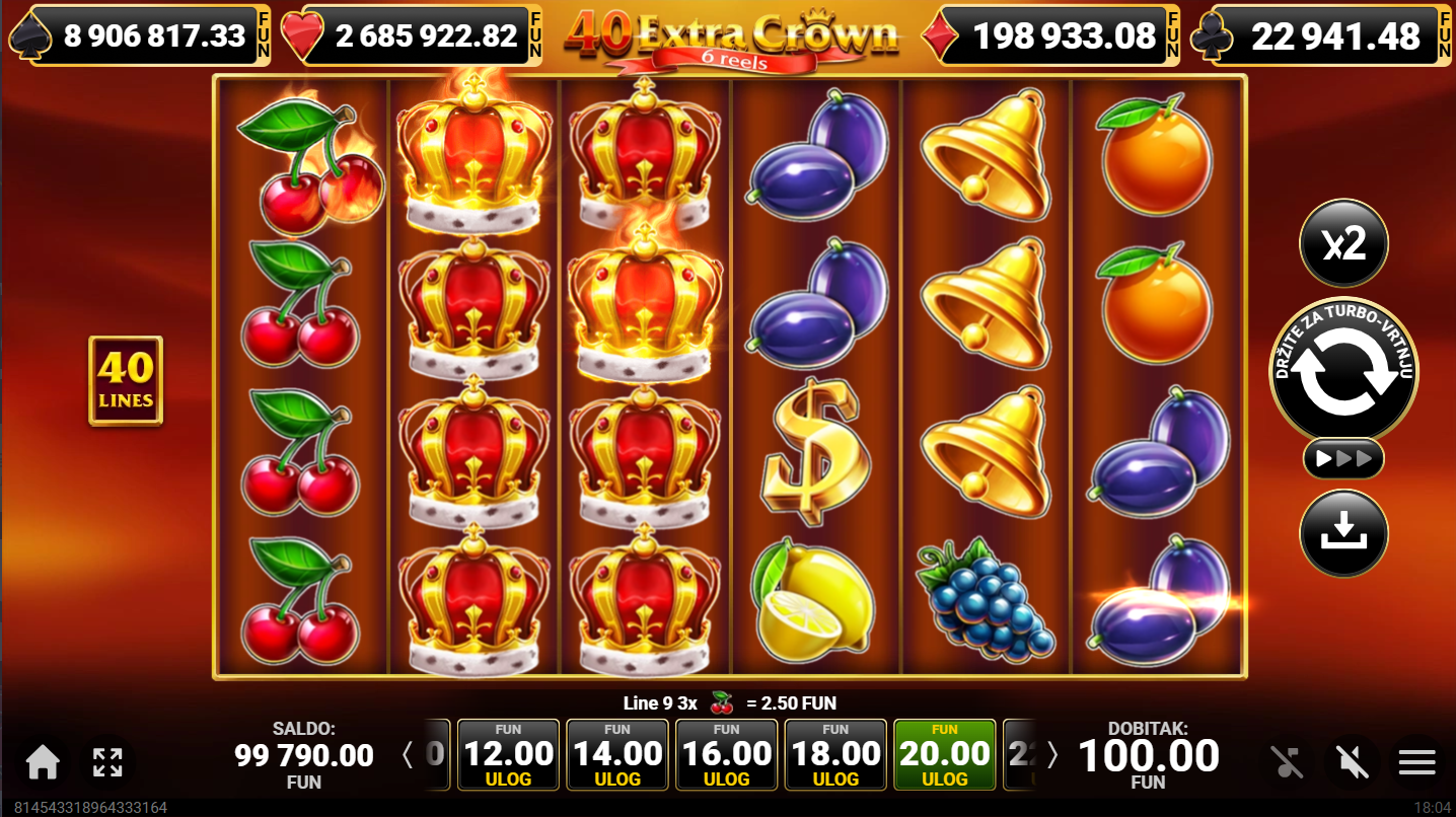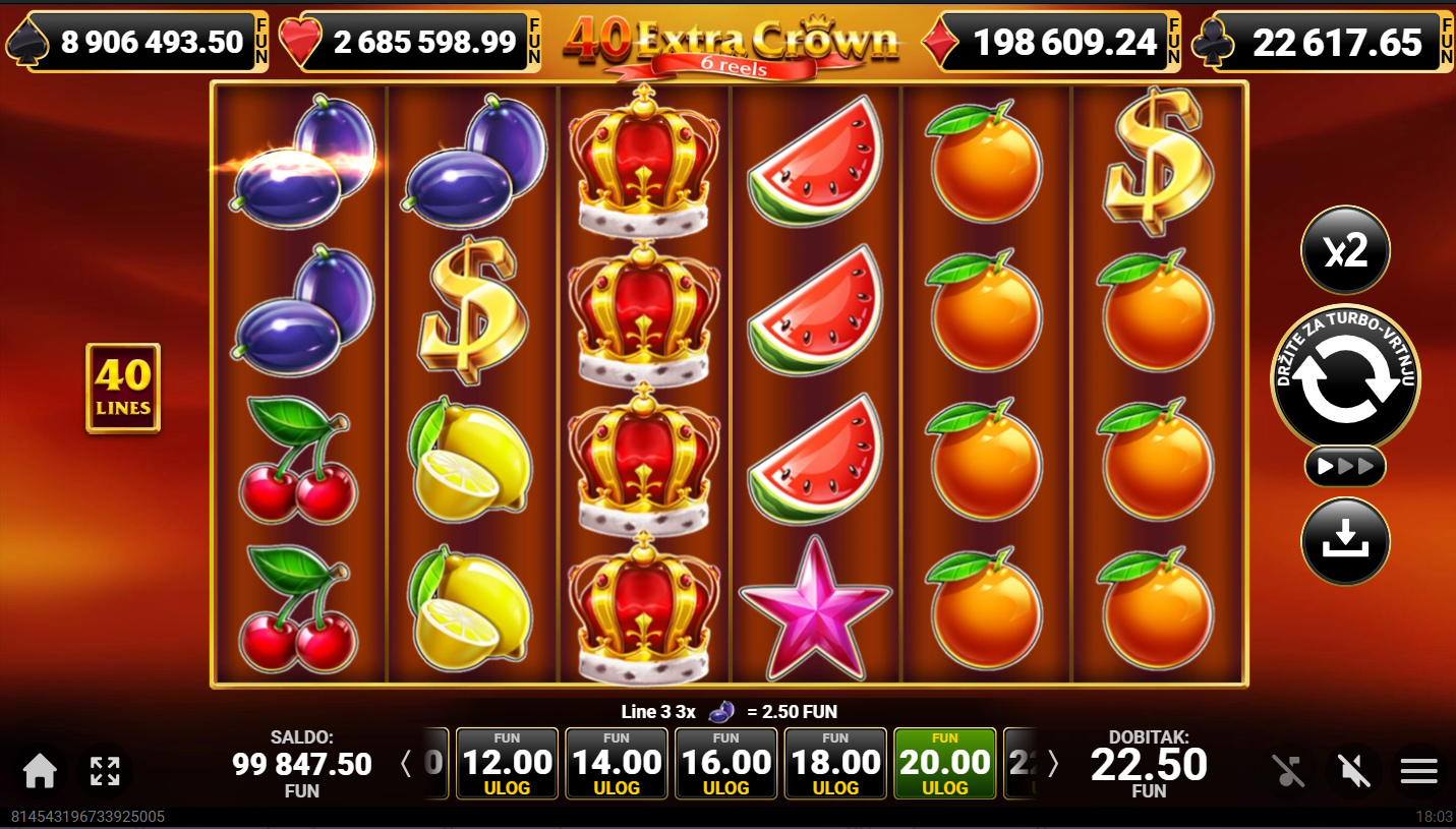 40 Extra Crown 6 Reels od Amusnetje online slot igra, a predstavlja nadogradnju popularnog Extra Crown naslova s dodatnim bubnjevima i još uzbudljivih mogućnosti. Igra ima šest bubnjeva i četiri reda s 40 fiksnih linija, a tematski smještena u kraljevsku voćnu atmosferu s modernim vizualima. Crown Wild simbol ima posebnu ulogu, pojavljuje se na srednjim bubnjevima i širi se kako bi zamijenio druge simbole i povećao šanse za dobitne kombinacije
