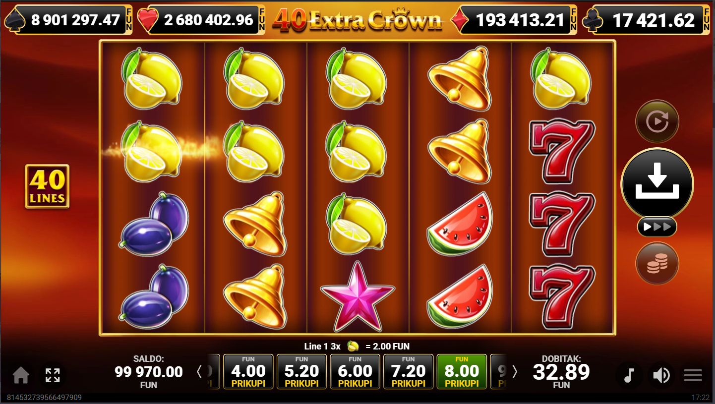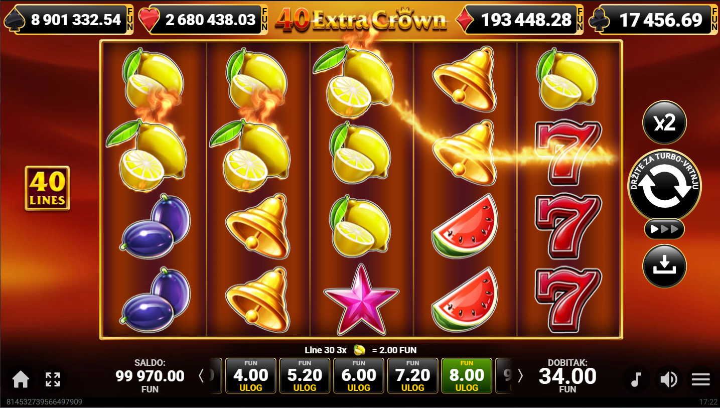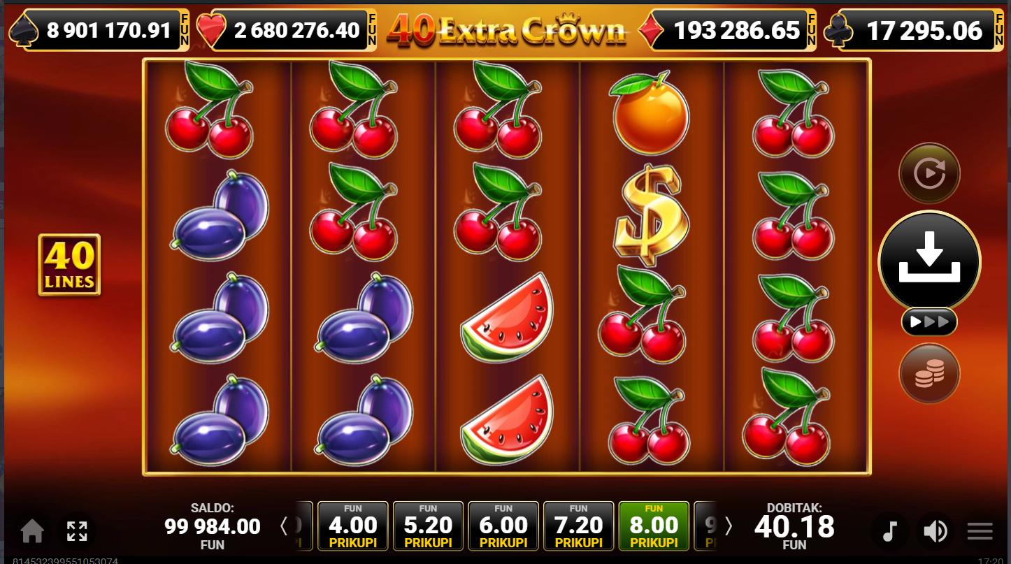 40 Extra Crown ima RTP 96,08% i visoku volatilnost.