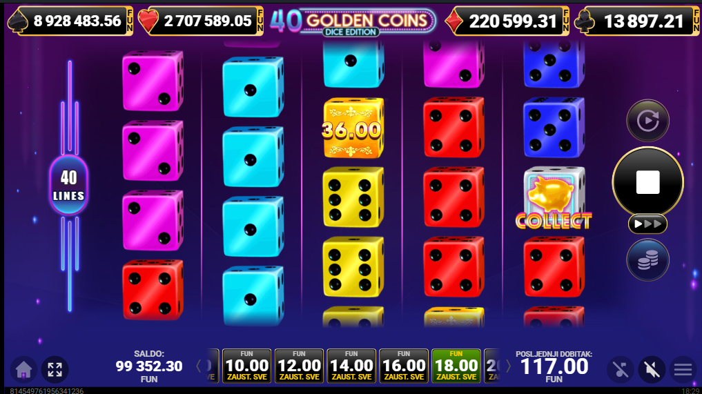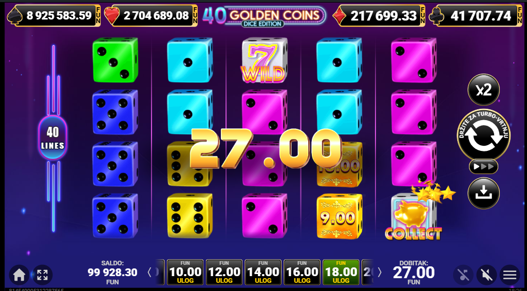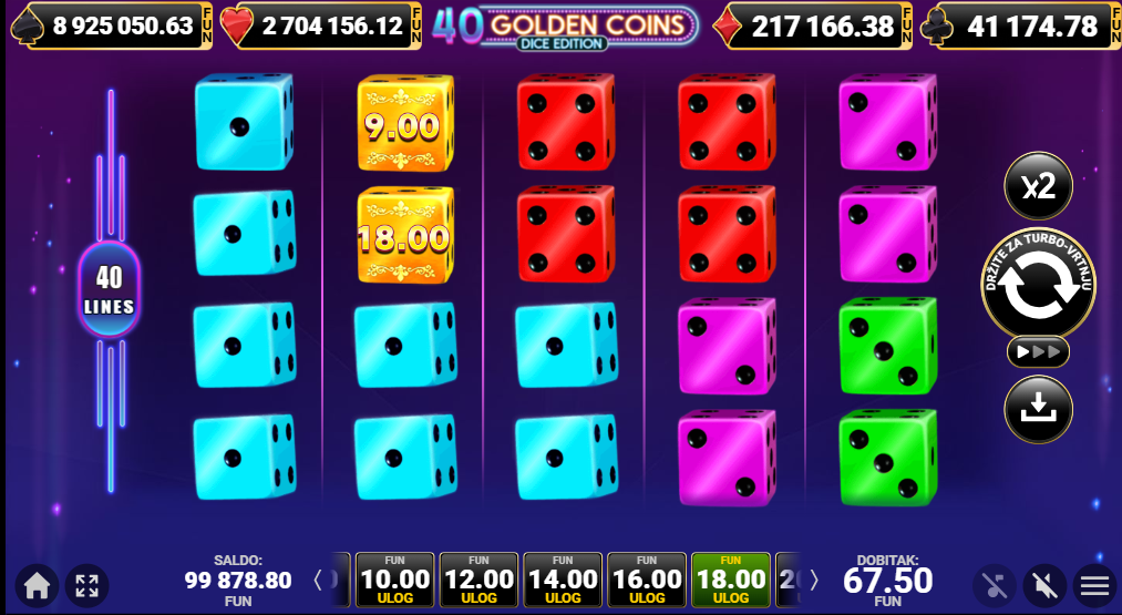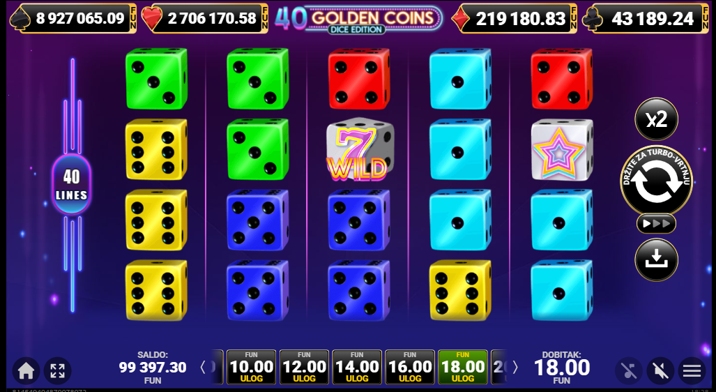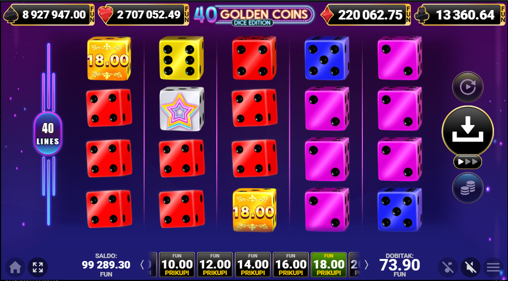 40 Golden Coins Dice Edition od Amusnetje video slot koji je tematiziran oko zlatnih simbola i simbola kockica u dinamičnom, modernom stilu. Igra ima vizualno atraktivan dizajn i zabavnu estetsku atmosferu. Igra se odvija na mreži od pet bubnjeva i četiri reda s 40 fiksnih isplatnih linija, što znači da su sve linije aktivne u svakom okretu i sudjeluju u obračunu dobitka. Igra je pogodna za sve casual igrače.