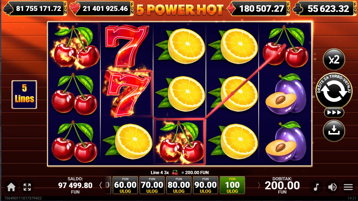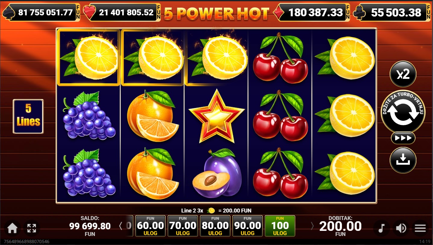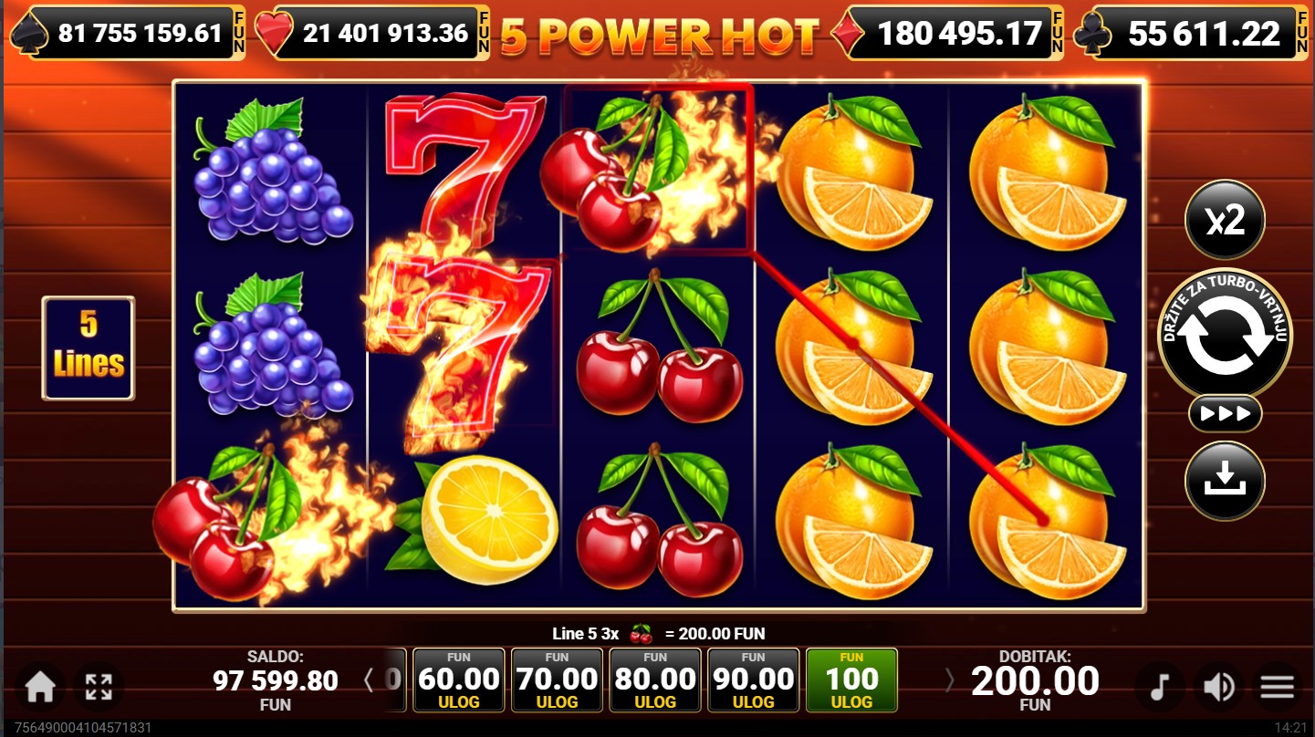 5 Power Hot se igra na 5 valjka i 3 reda s 5 isplatnih linija. Dobitne kombinacije formiraju se kada se isti simboli slože na aktivnim linijama s lijeva na desno. Nakon svakog dobitnog okretanja možeš aktivirati opciju udvostručenja dobitka biranjem boje karte, dok posebne značajke igre pružaju priliku za osvajanje jackpota i nagradnih vrtnji. Svaka vrtnja donosi novu priliku za zabavu i uzbuđenje.