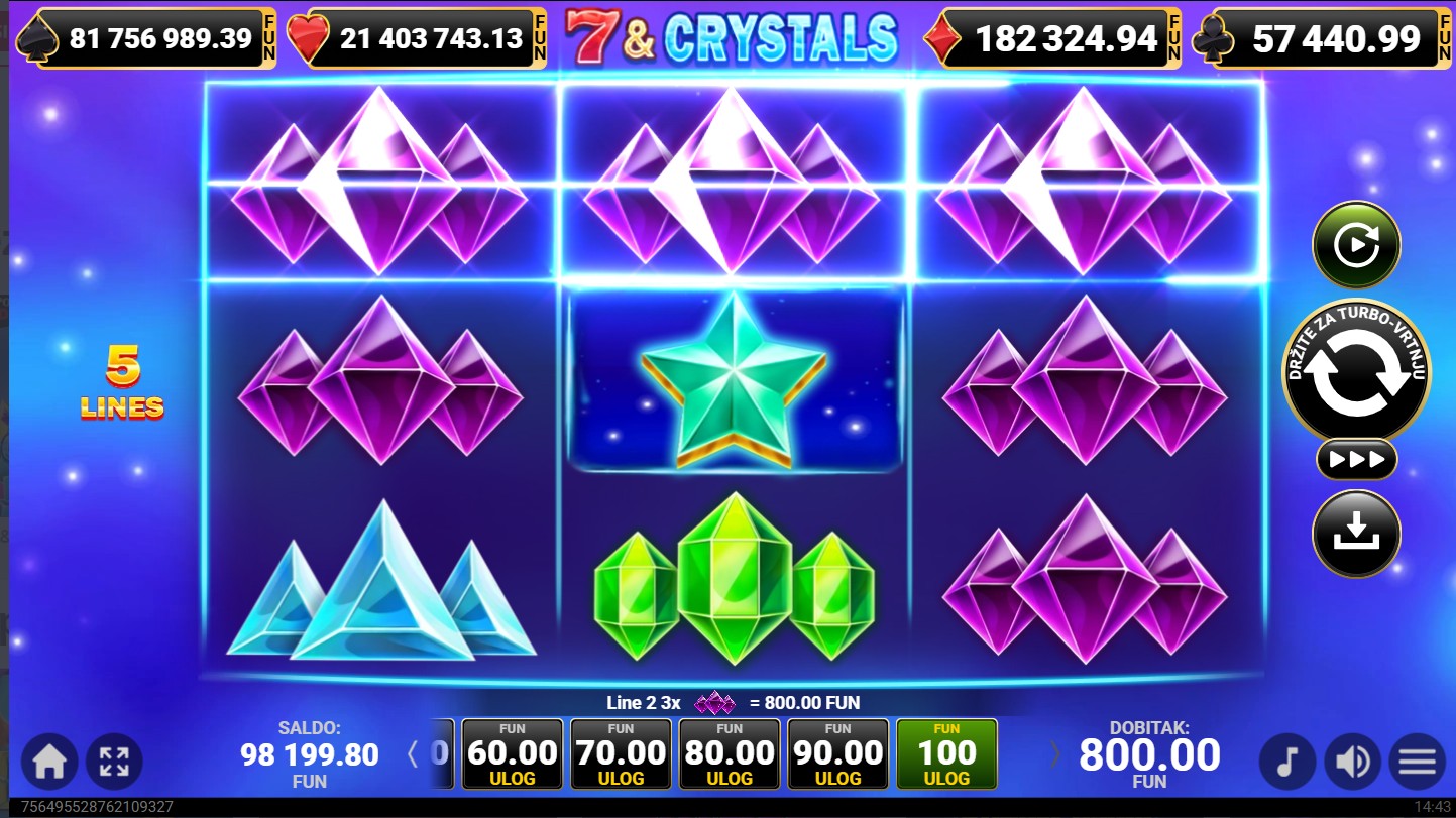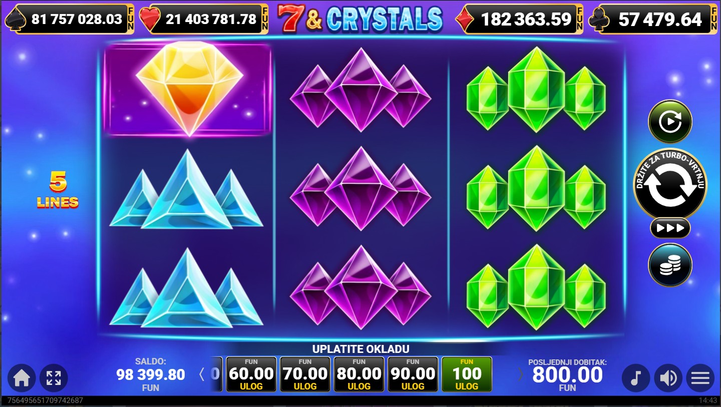 7 & Crystals se igra na 3 valjka i 3 reda s 5 fiksnih isplatnih linija. Dobitne kombinacije formiraju se kada se isti simboli slože na aktivnim linijama s lijeva na desno, a cilj je složiti što više identičnih simbola za nagrade. Nakon svakog dobitnog okretanja možeš iskoristiti opciju udvostručenja dobitka odabirom boje karte, dok posebne značajke igre pružaju priliku za osvajanje jackpota i nagradnih vrtnji. Svaka vrtnja donosi novu priliku za šarenu i uzbudljivu avanturu.