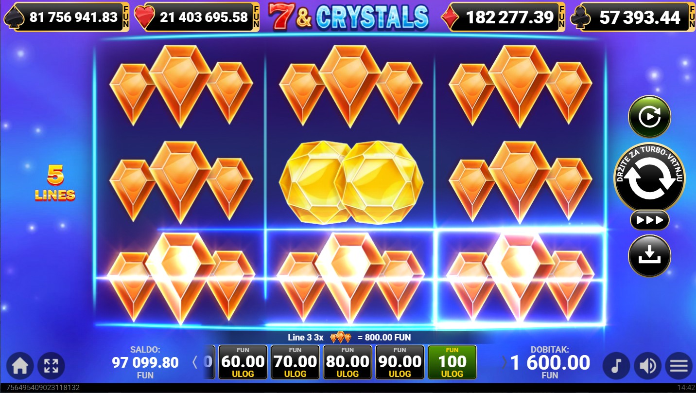 7 & Crystals ima RTP od 96,62%, što znači da pruža vrlo solidne šanse za dobitak tijekom igre. Volatilnost je niska, što znači da igra često donosi dobitke, ali manjih iznosa. Idealna je za igrače koji vole stabilnu i dugotrajnu igru s čestim nagradama, bez velikih rizika, dok uzbuđenje dolazi iz stalnih pobjeda i aktiviranja bonus značajki.