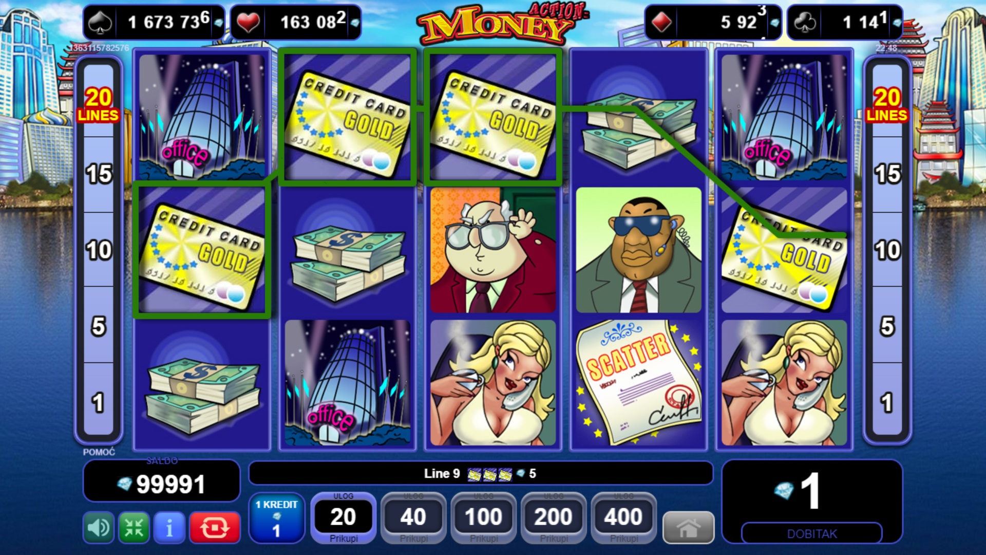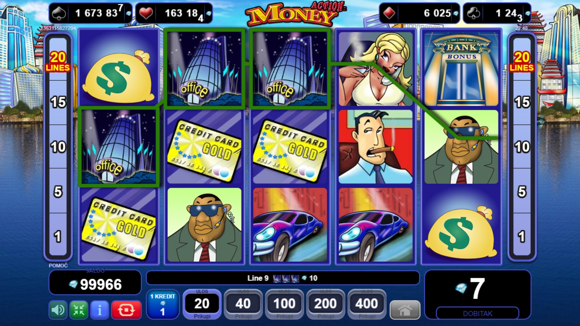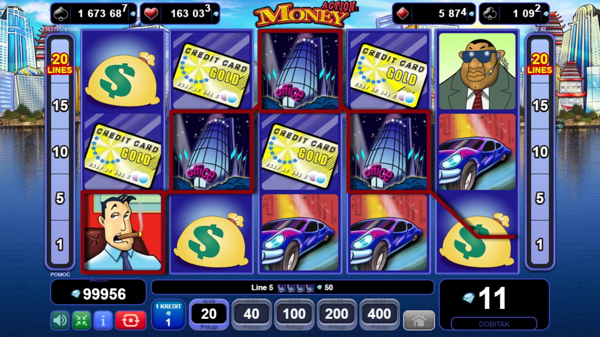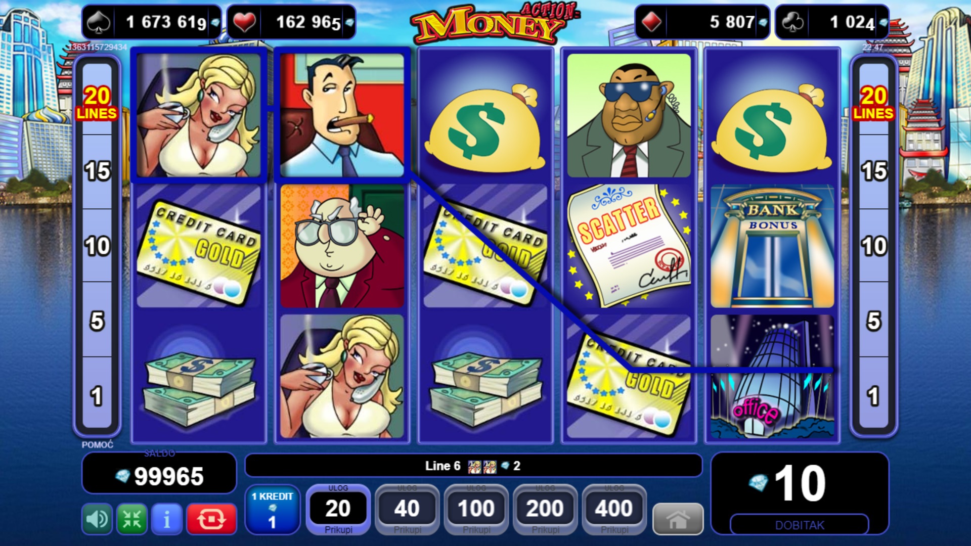 Action Money donosi dinamiku i uzbudljive prilike za dobitak s pet koluta i brojnim bonus značajkama. Pokreni značajku banke i odaberi svoju sretnu omotnicu kako bi otkrio besplatne vrtnje i množitelje do x5. Uz dodatni wild simbol, tvoje šanse za dobitak postaju još veće! Igra također uključuje tajanstveni Jackpot na četiri razine, koji možeš osvojiti biranjem karata iz bonus igre.