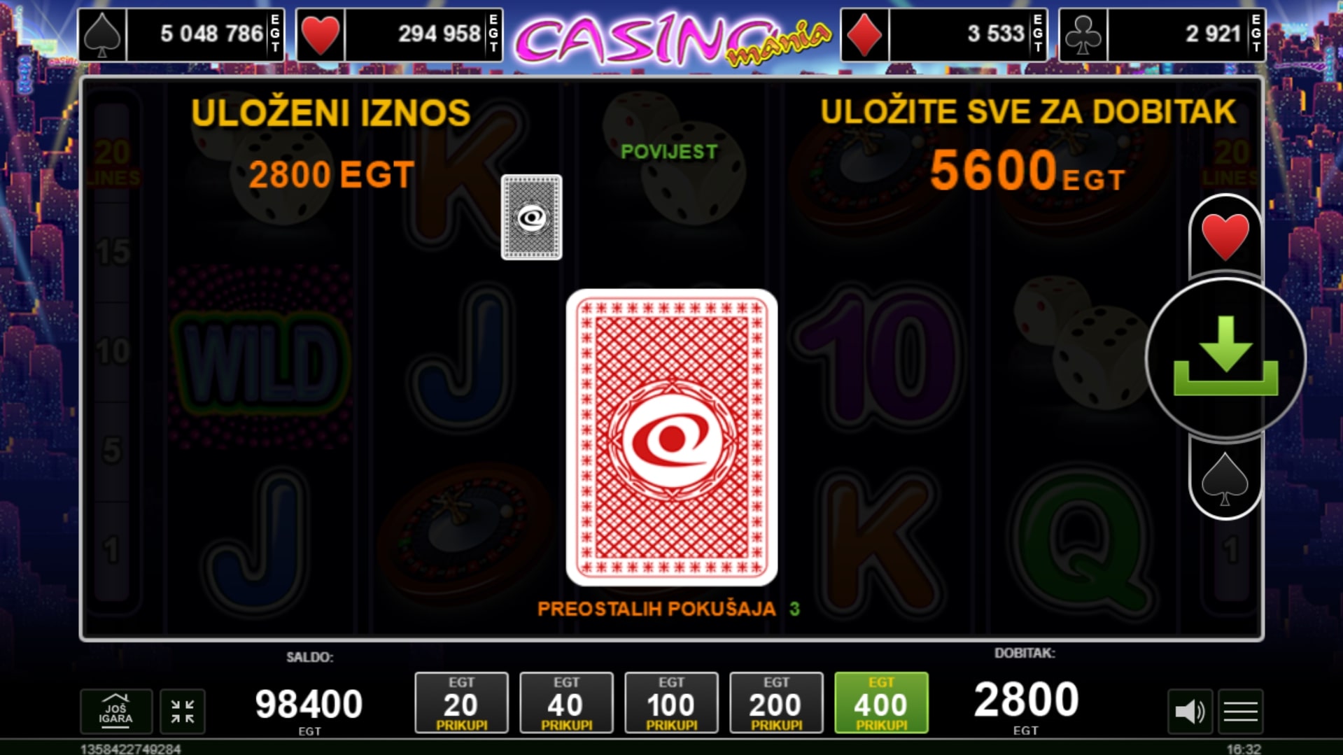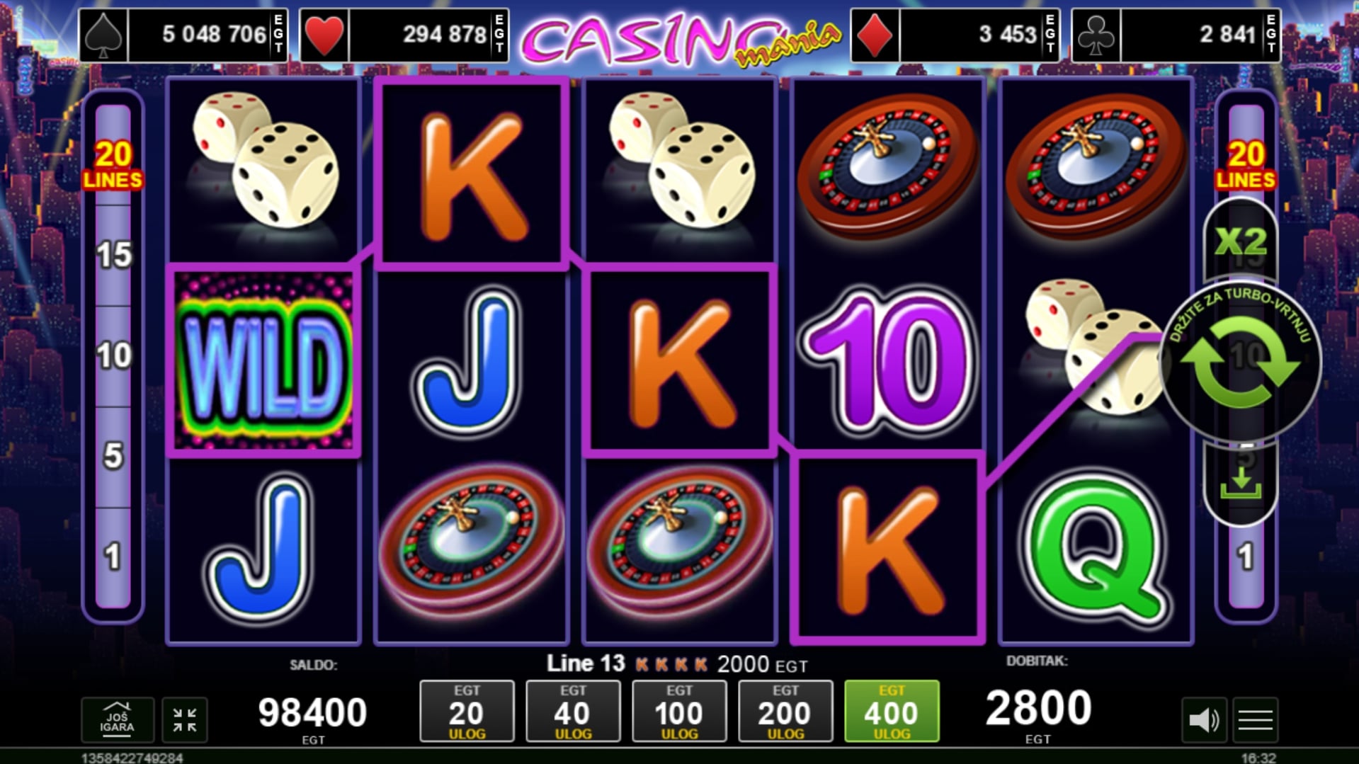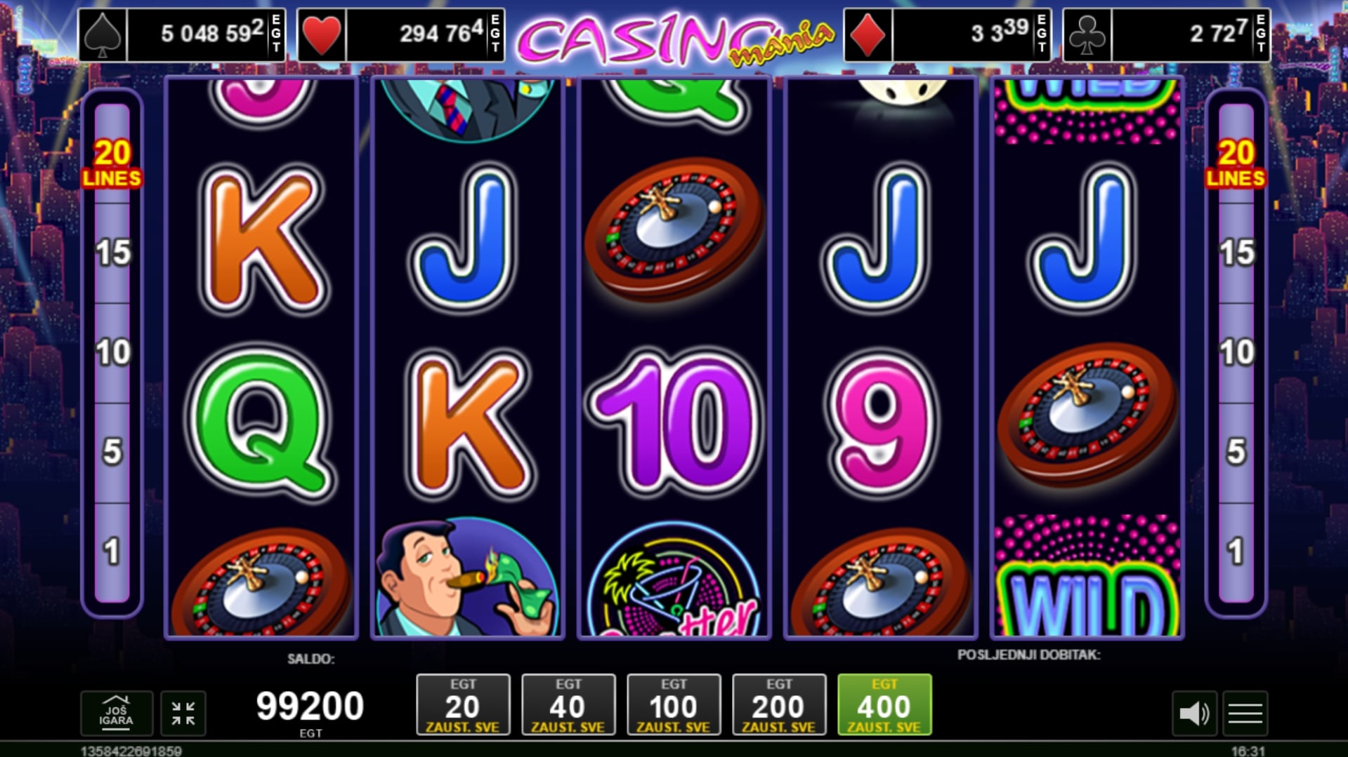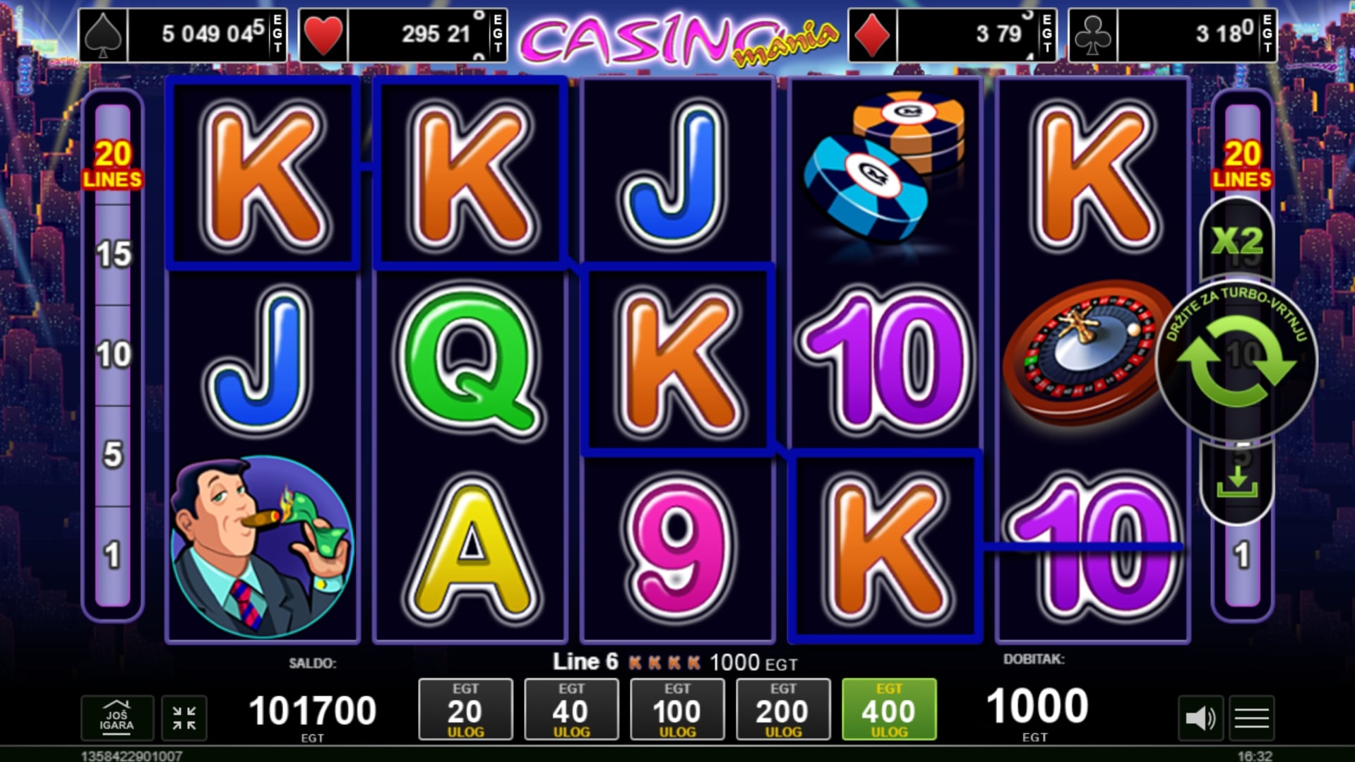 Casino Mania slot je igra što vodi igrača u svijet kasina i uzbudljivih igara na sreću. Najviše isplaćuju simboli gospodina s cigarom, ljepotice u rozoj haljini te kockica i žetona, dok Wild simbol mijenja druge simbole u potrazi za dobicima. Simbol Scatter može aktivirati besplatne vrtnje, a u slučaju dobitaka moguće ih je udvostručiti pogađanjem boje karte okrenute licem prema dolje. Zaigraj Casino Mania te osvoji iznimne nagrade!