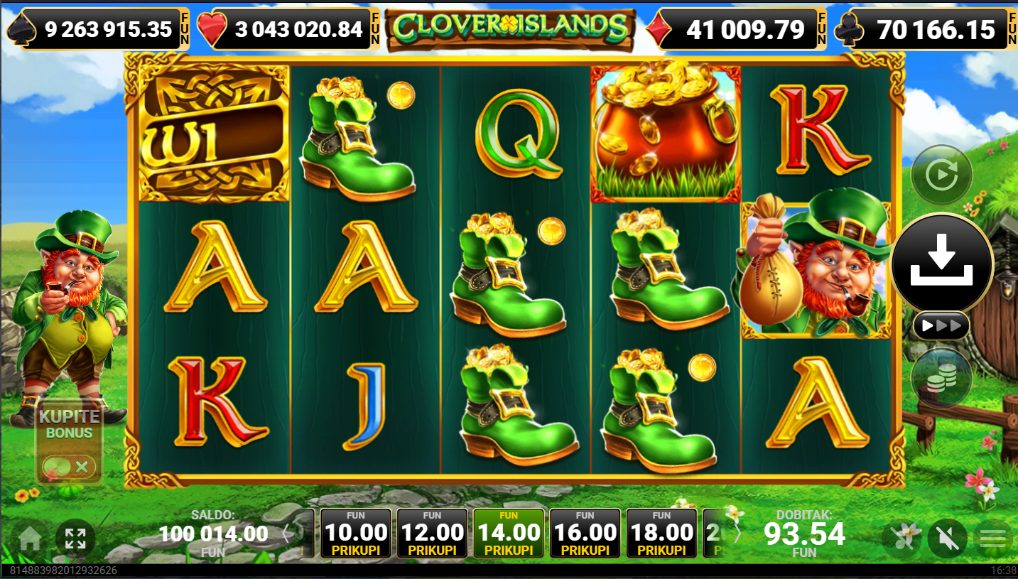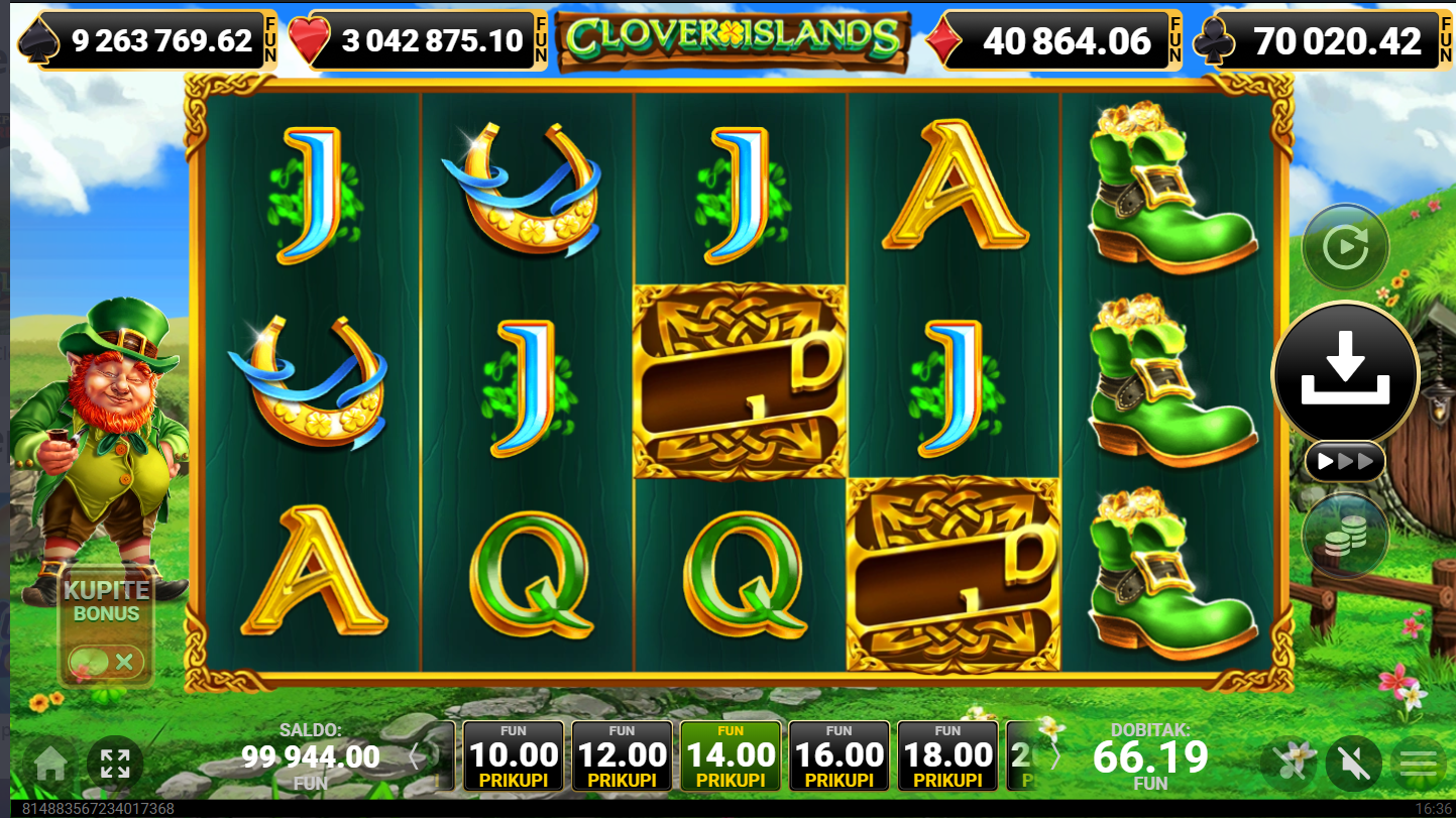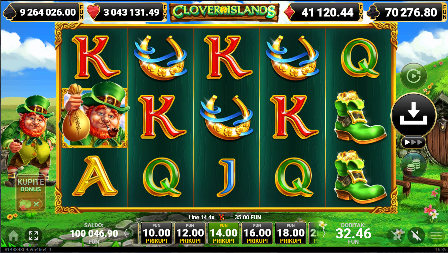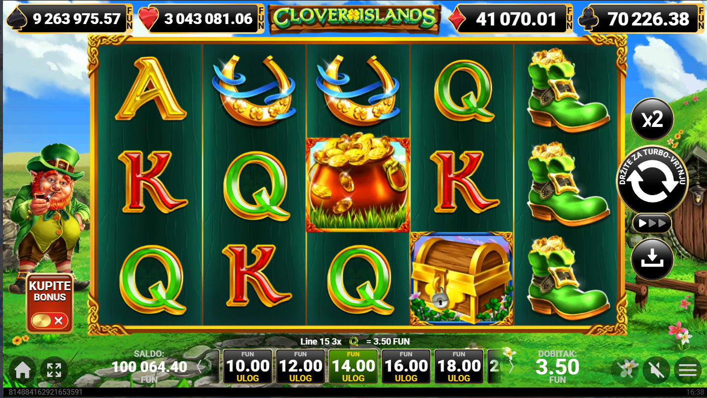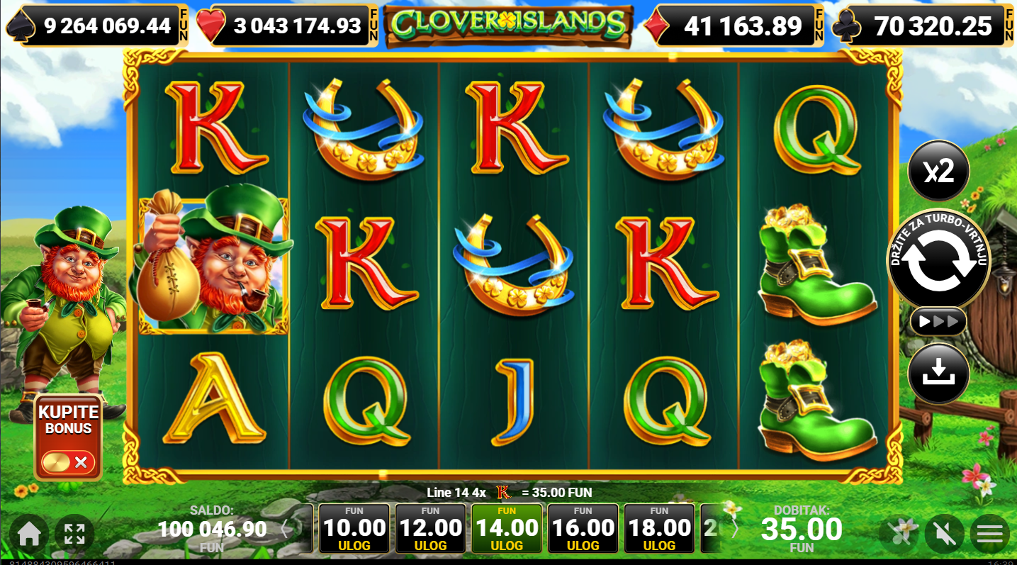 Clover Islands od Amusnet je irski tematski video slot koji je smješten u čarobni svijet djetelina, vila i skrivenog blaga. Vizualno je igra obojena zelenim tonovima uz simbole poput zlatnog lonca, vila i djeteline s četiri lista i klasičnih kartaških oznaka. Atmosfera igre podsjeća na bajkoviti irski krajolik pun sreće i zlata. Igra se odvija na mreži od pet bubnjeva i tri reda s deset isplatnih linija.