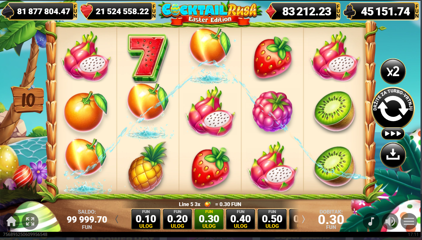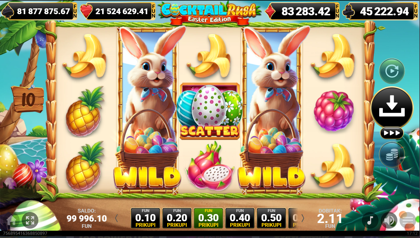 Odaberi svoj ulog, zavrti kolute i prepusti se koktelsko uskrsnoj zabavi. Wild simboli pomažu slagati dobitne kombinacije, dok scatteri donose dodatne nagrade. Pravila su jednostavna i lako shvatljiva, pa je igra odlična i za početnike. Svaka vrtnja dolazi s opuštenom, ali uzbudljivom energijom.