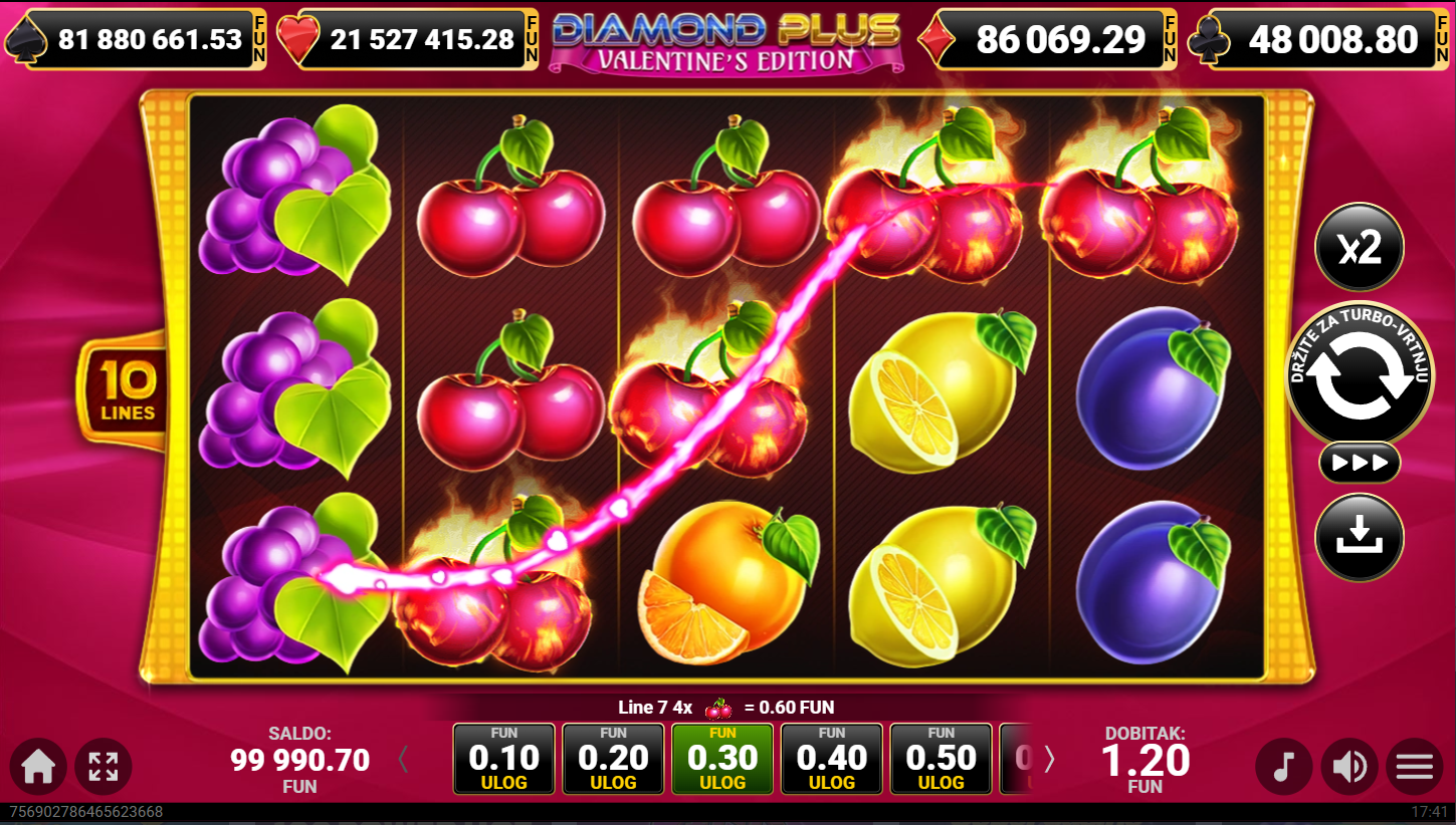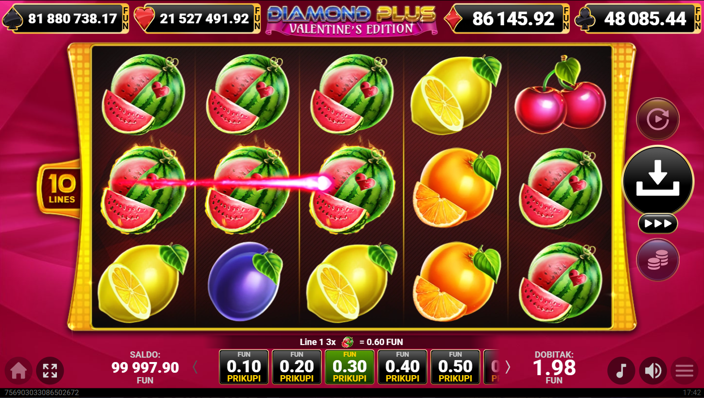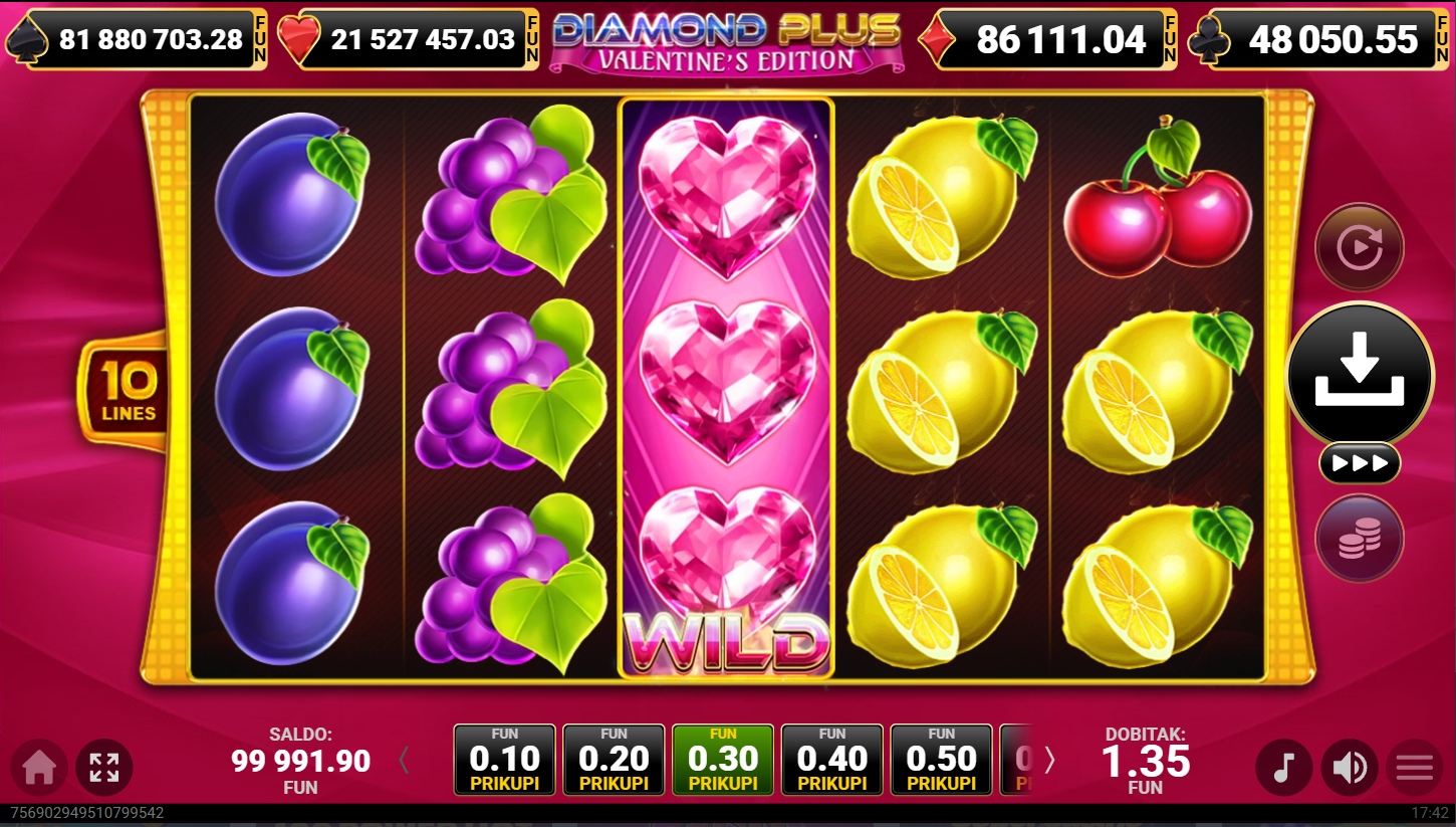 Diamond Plus – Valentine’s Edition od Amusneta je romantika na bubnjevima! Ovaj 5x3 slot nudi 10 linija, ružičaste dijamante i srca te wild simbole koji se proširuju preko koluta za besplatni respin. Ova je igra idealna za veljaču, Dan zaljubljenih i svaki dan u godini kada ima mjesta za ljubav.