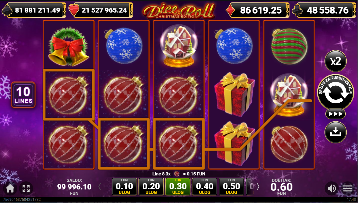 Sve je jednostavno: odaberi ulog, zavrti kolute i gledaj kako se kocke i voće slažu u dobitne linije. Wild simboli šire se preko cijelog koluta, dok scatter donosi veće nagrade. Brza i intuitivna, igra zadržava fokus na čistoj akciji. Božićna atmosfera daje joj poseban šarm, a svaki spin može biti pravo iznenađenje.