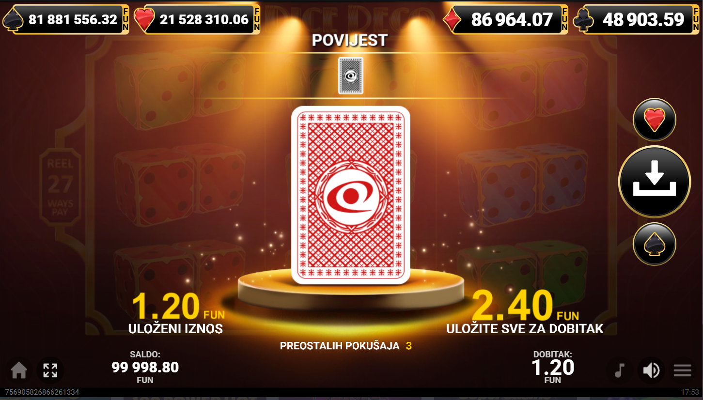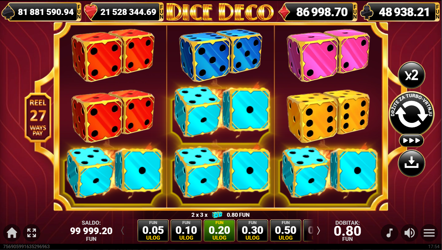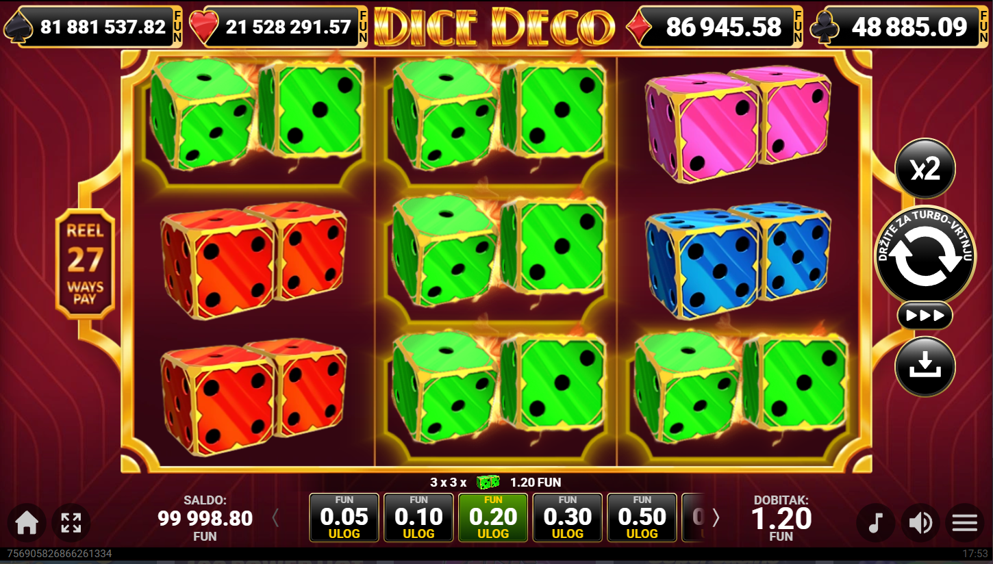 Dice Deco ima RTP od oko 96.33% i nisku do srednju volatilnost, što znači česte manje dobitke uz stabilan ritam. Najveća privlačnost leži u multiplikatorima i progresivnom jackpotu. Balans rizika i nagrada čini ga odličnim za igrače koji vole sigurnije sesije, ali žele i šansu za iznenađujući dobitak.