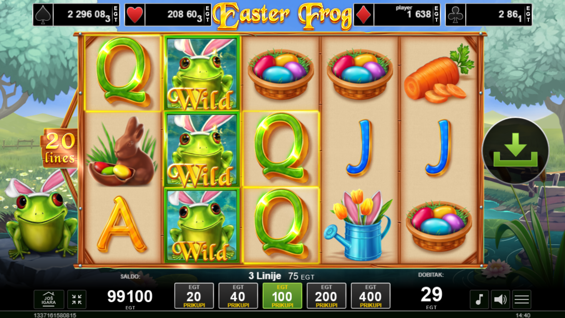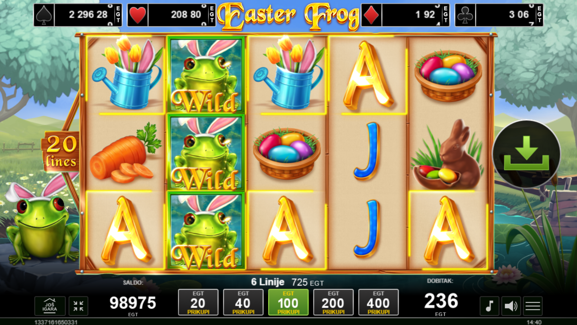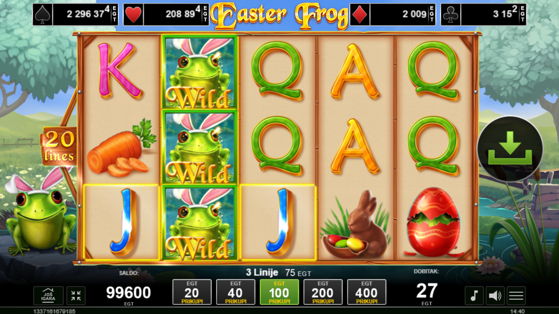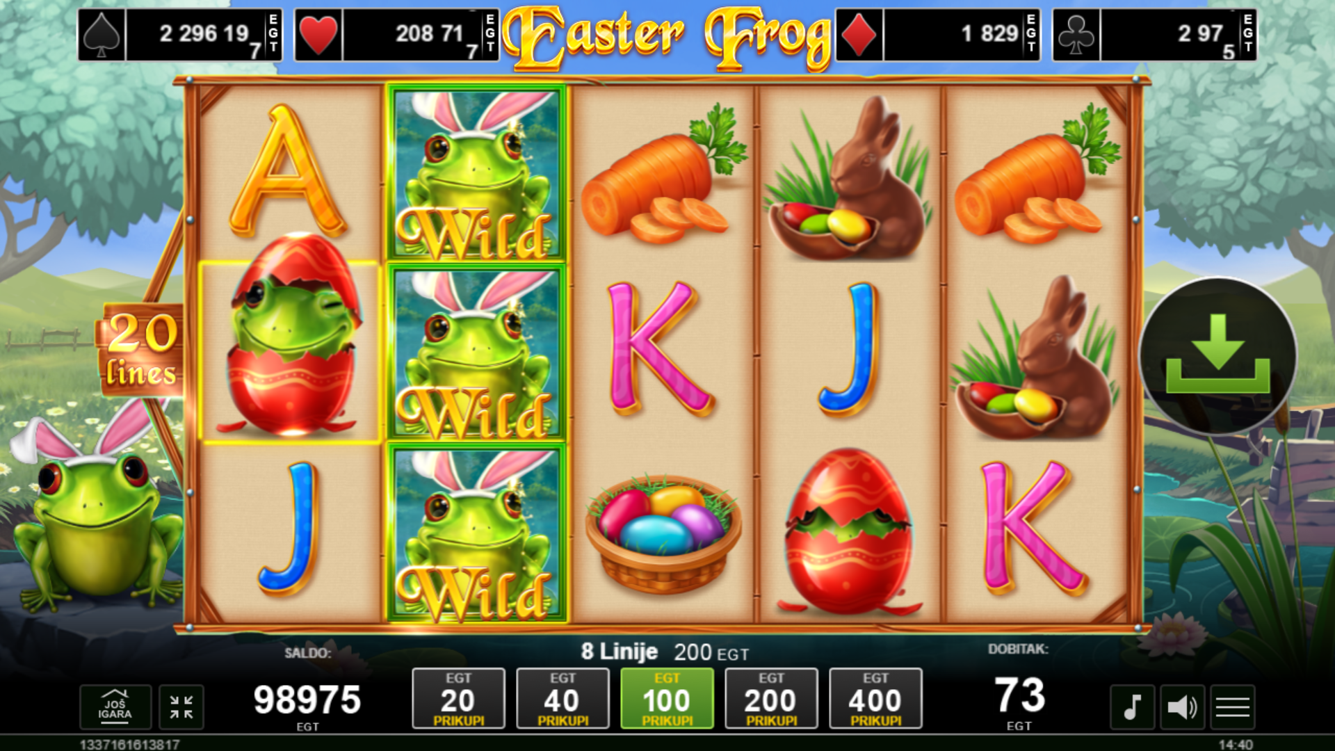 Easter Frog ima RTP od 96.03%, što znači da igra nudi dobre šanse za dobitak. Volatilnost je srednja, što znači da možeš očekivati česte, ali manje dobitke. Igra je savršena za igrače koji vole balans između rizika i nagrada.