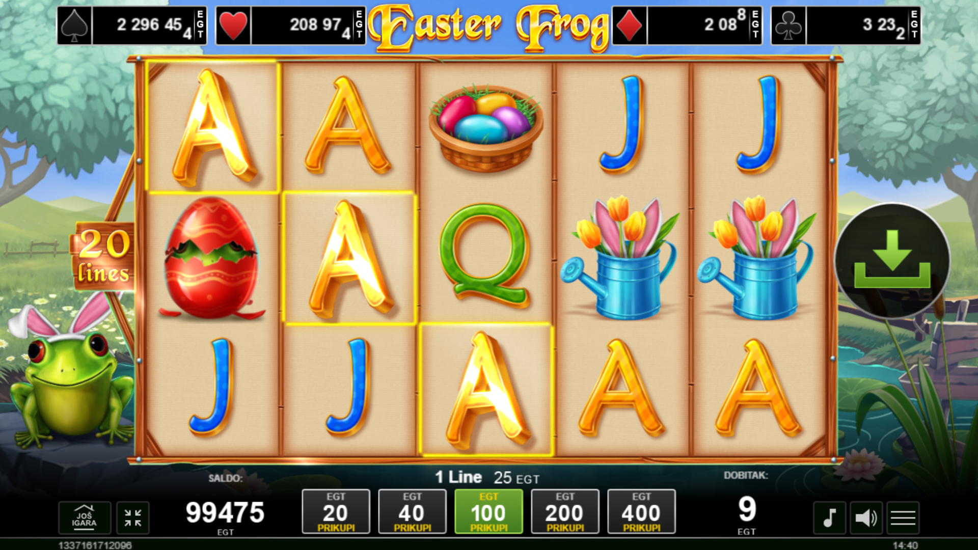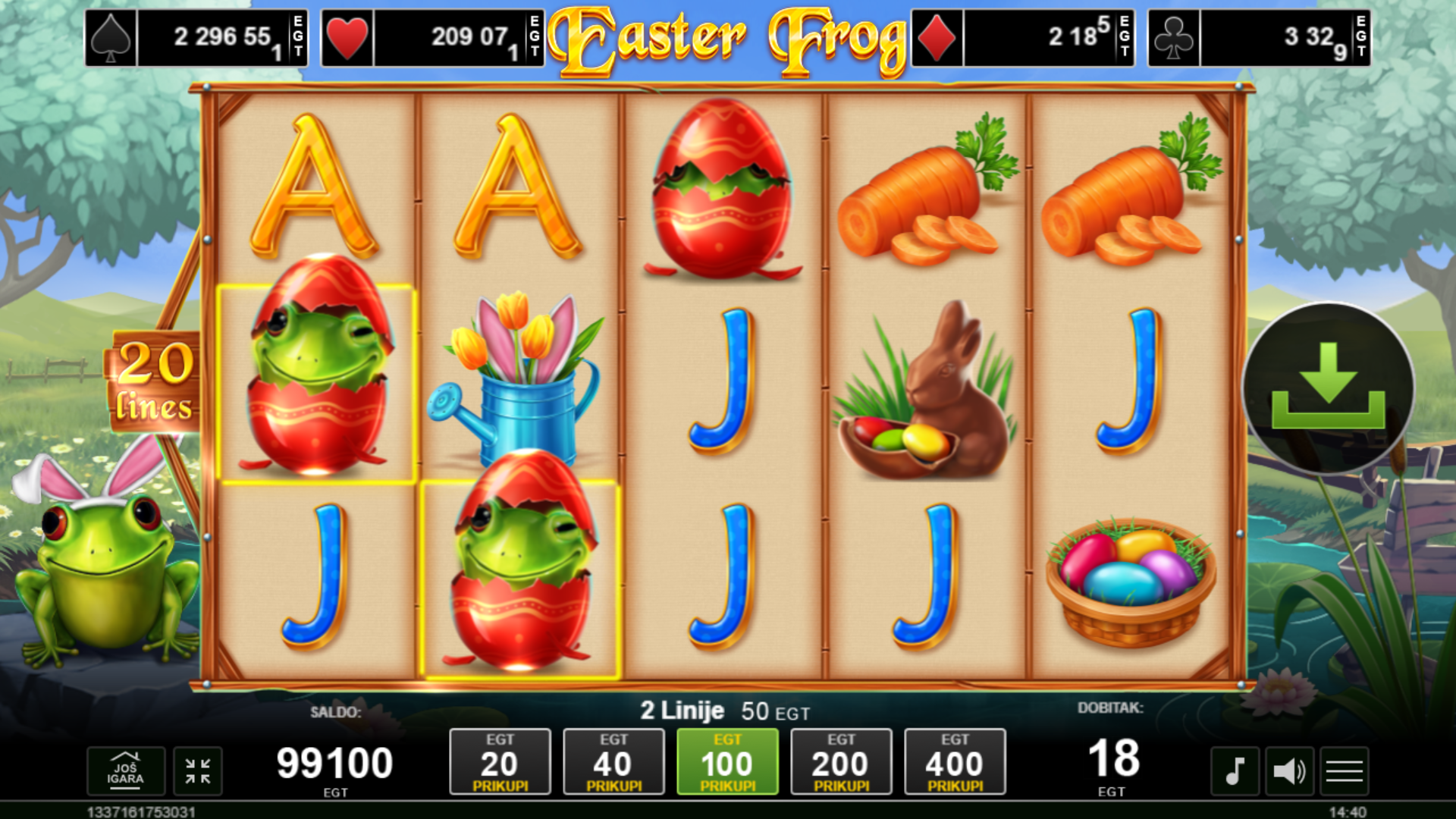 U igri Easter Frog od Amusnet, uživat ćeš u živopisnim simbolima i raznolikim bonusima inspiriranim uskrsnom tematikom. Ova video slot igra s 5 koluta i 20 linija nudi uzbudljive mogućnosti za dobitak uz kaskadne kolute i brojne besplatne vrtnje. S 11 simbola, uključujući Wild i Scatter simbole, svaka vrtnja može donijeti iznenađenje i nagradu. Pronađi skrivena uskrsna jaja i doživi pravu avanturu na kolutima!